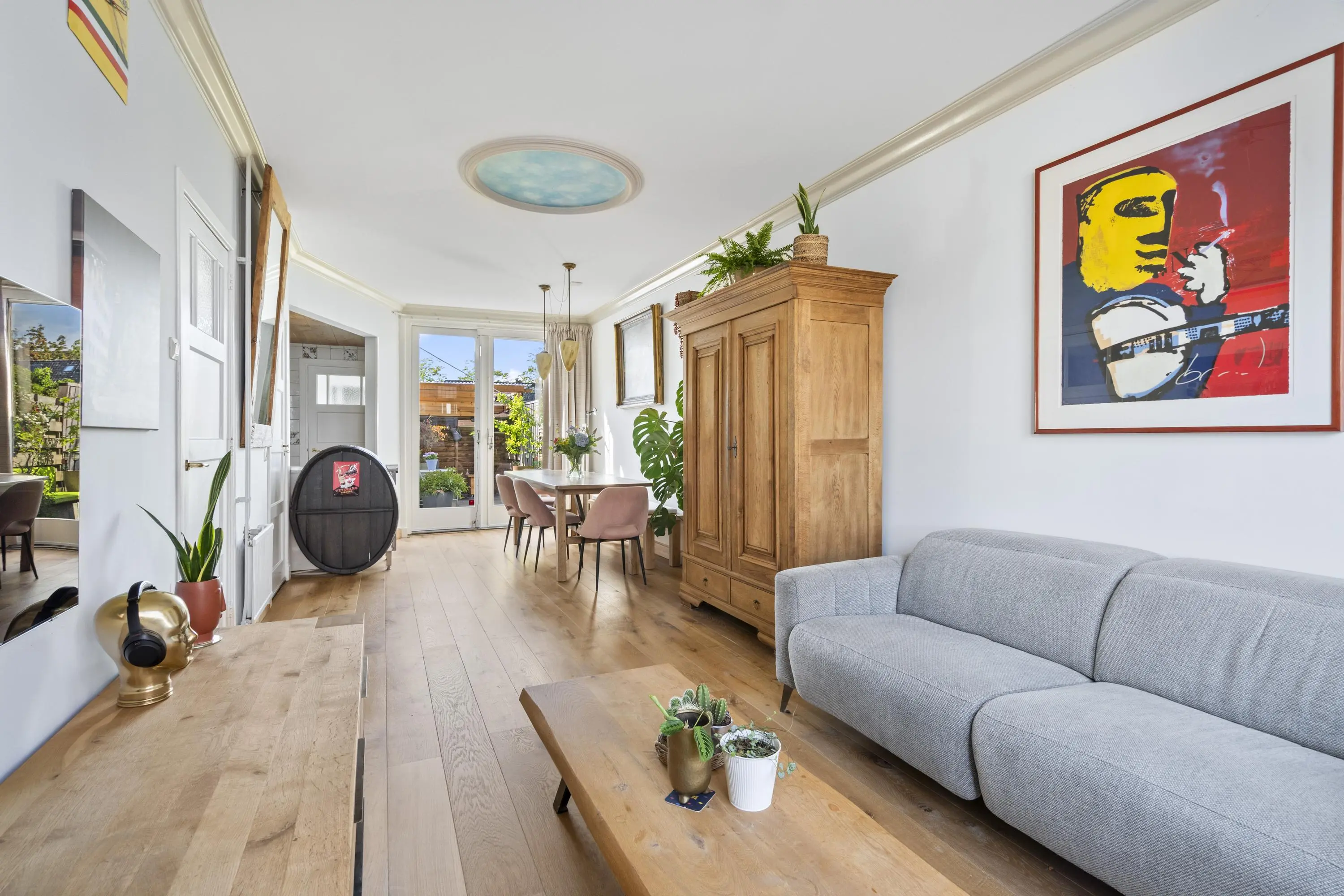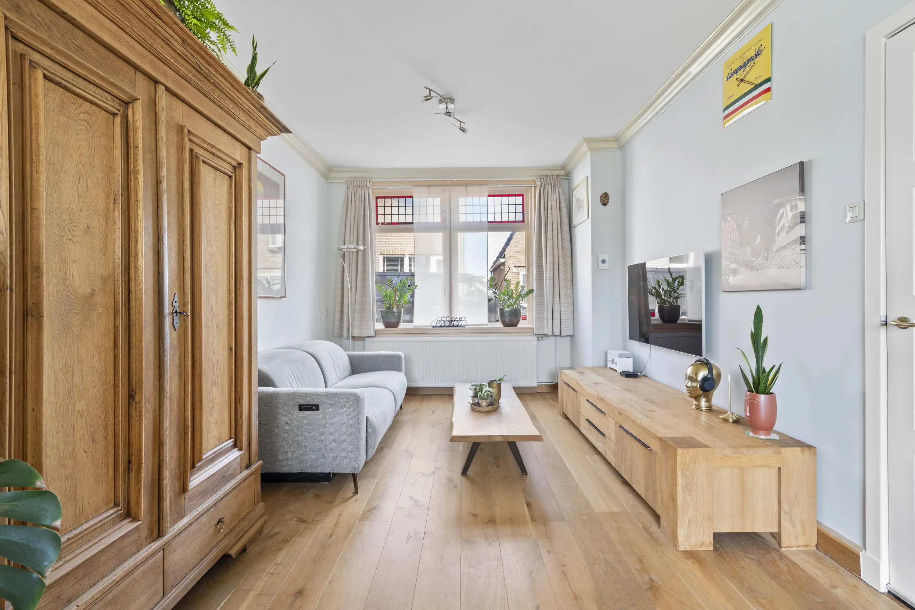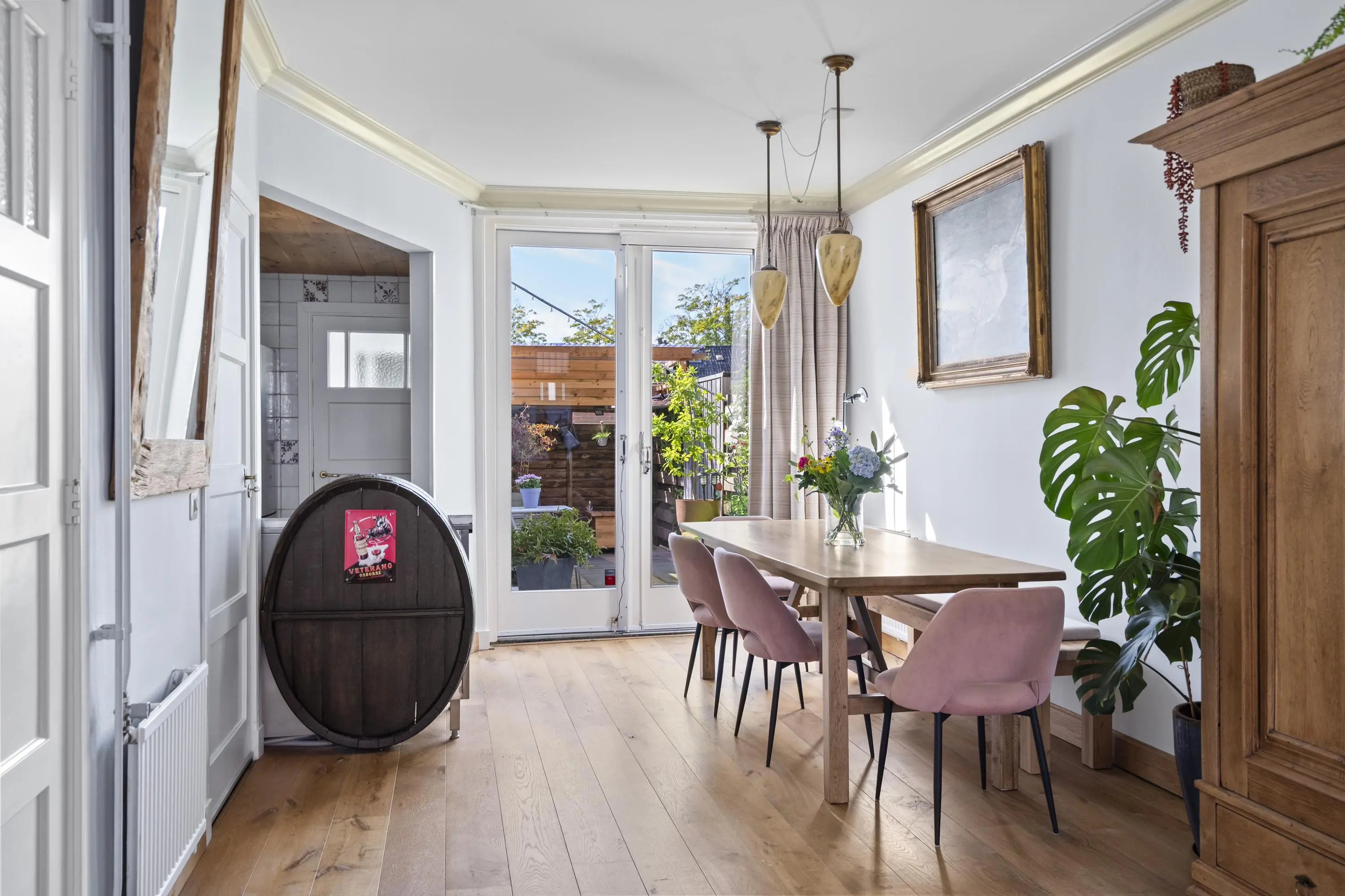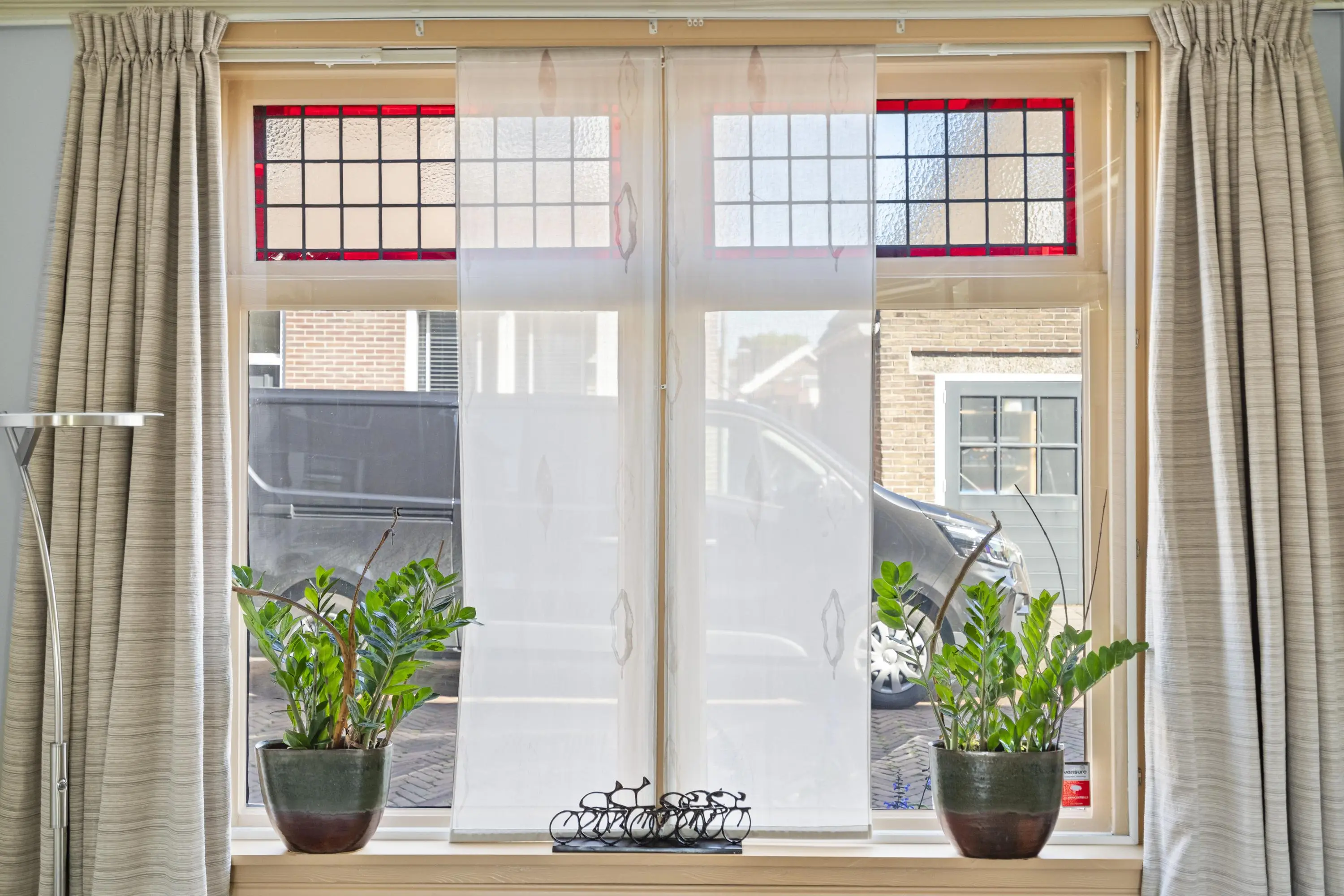 Voor het huis ligt een gezellige geveltuin die direct zorgt voor een prettige eerste indruk. Via de voordeur stap je de lange hal binnen met meterkast en trapopgang. Vanuit hier bereik je de woonkamer: een heerlijke doorzonkamer waar het zonlicht je de hele dag volgt. De glas-in-loodramen aan de voorzijde geven het geheel een authentieke uitstraling, terwijl de eikenhouten vloer zorgt voor warmte en eenheid.