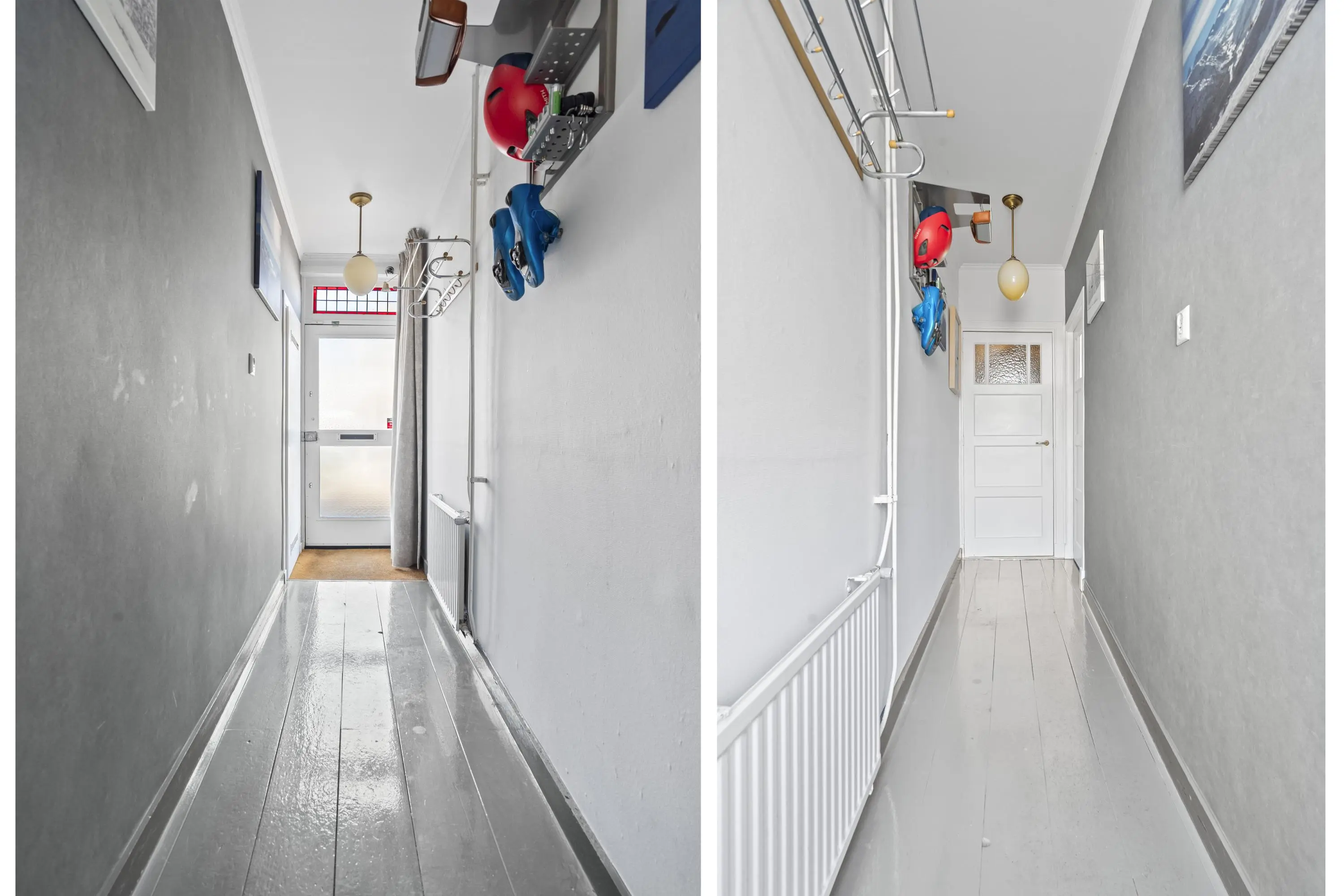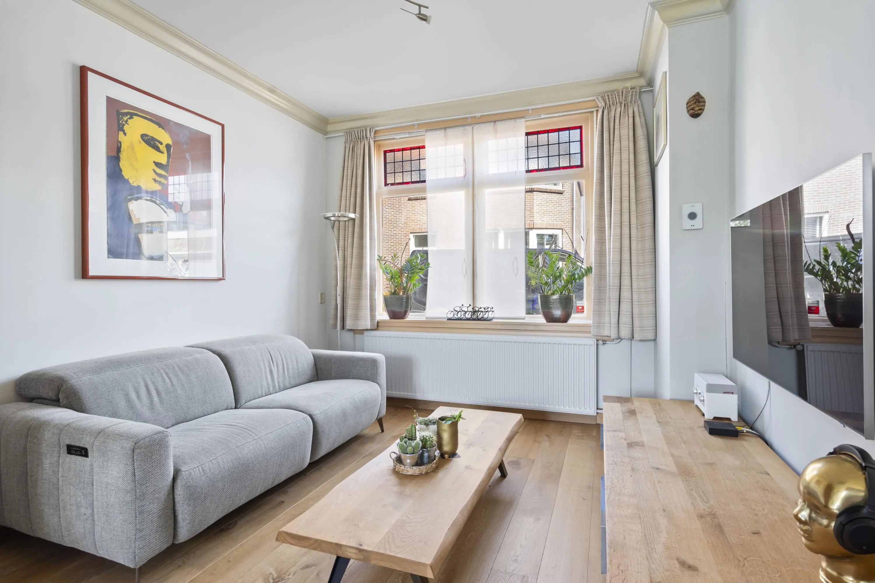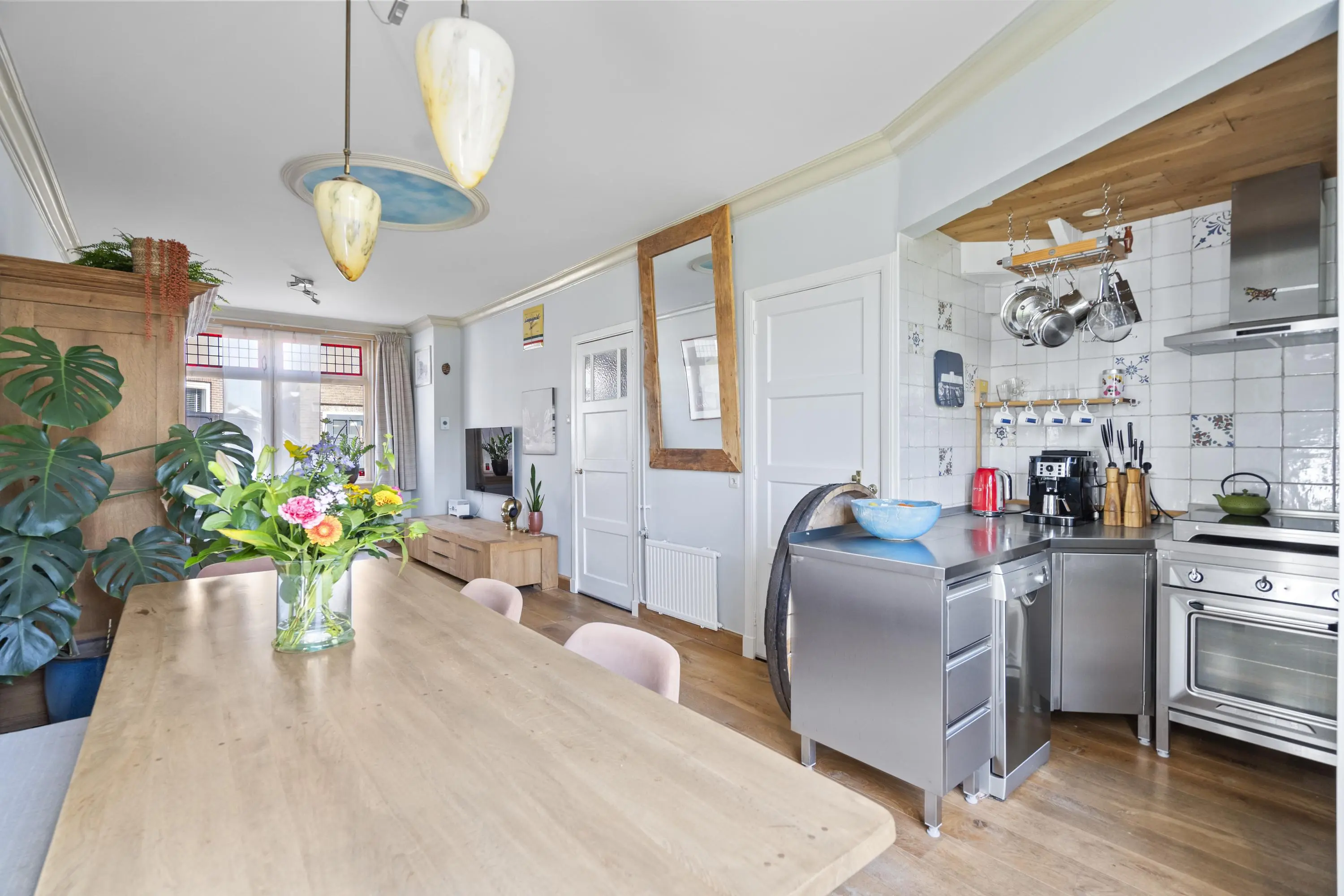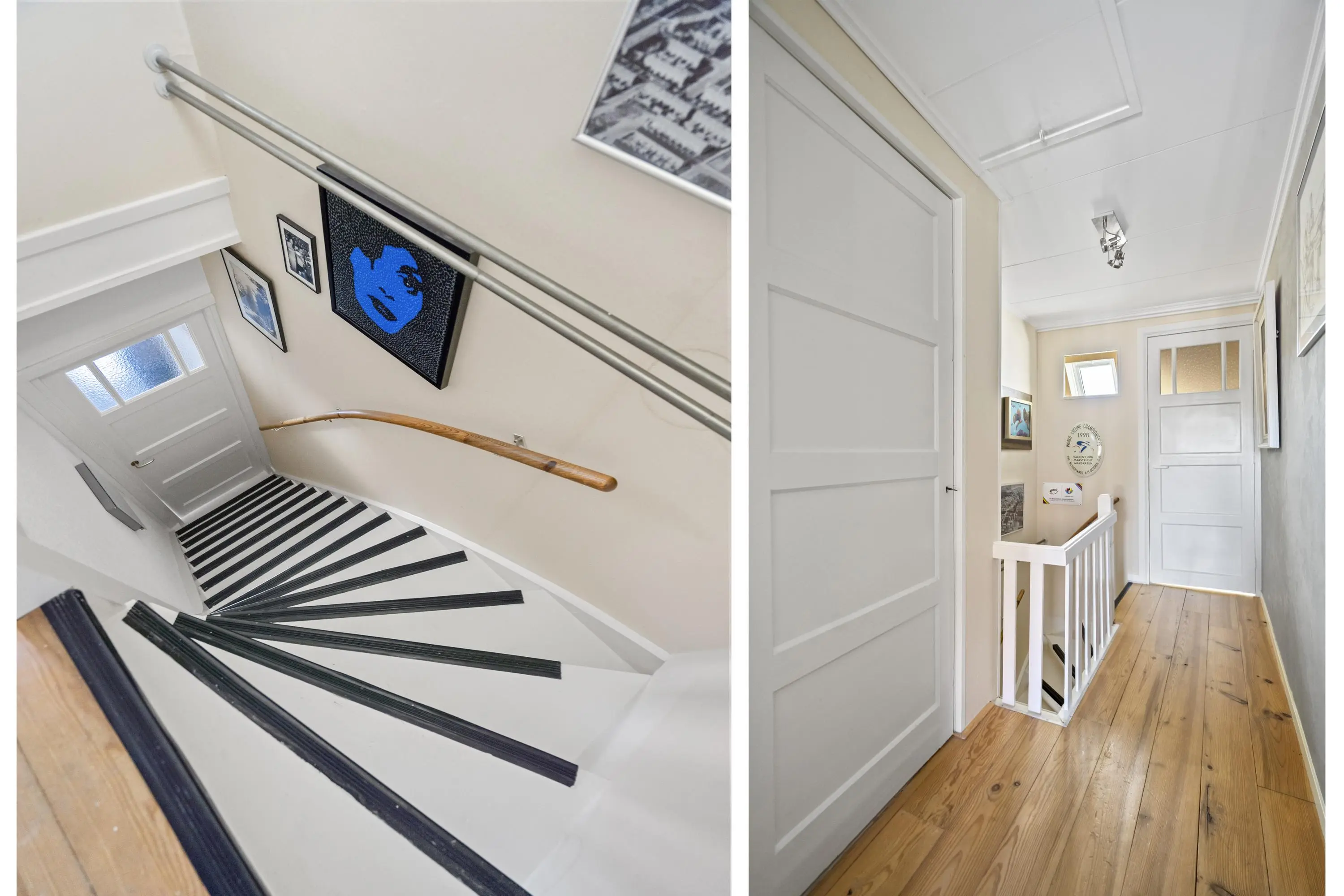 Voor het huis ligt een gezellige geveltuin die direct zorgt voor een prettige eerste indruk. Via de voordeur stap je de lange hal binnen met meterkast en trapopgang. Vanuit hier bereik je de woonkamer: een heerlijke doorzonkamer waar het zonlicht je de hele dag volgt. De glas-in-loodramen aan de voorzijde geven het geheel een authentieke uitstraling, terwijl de eikenhouten vloer zorgt voor warmte en eenheid.