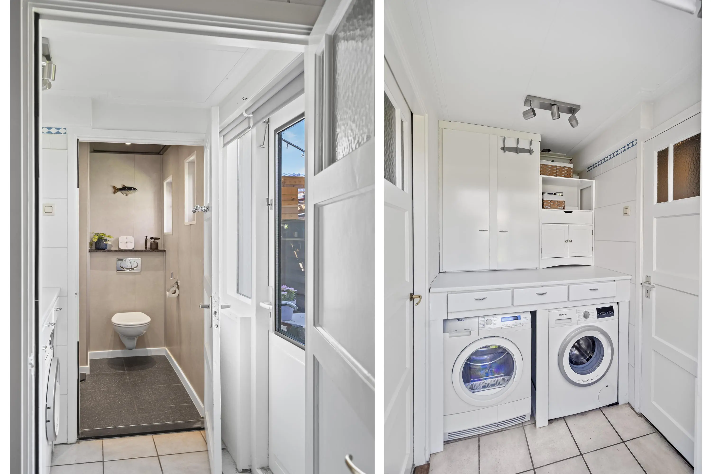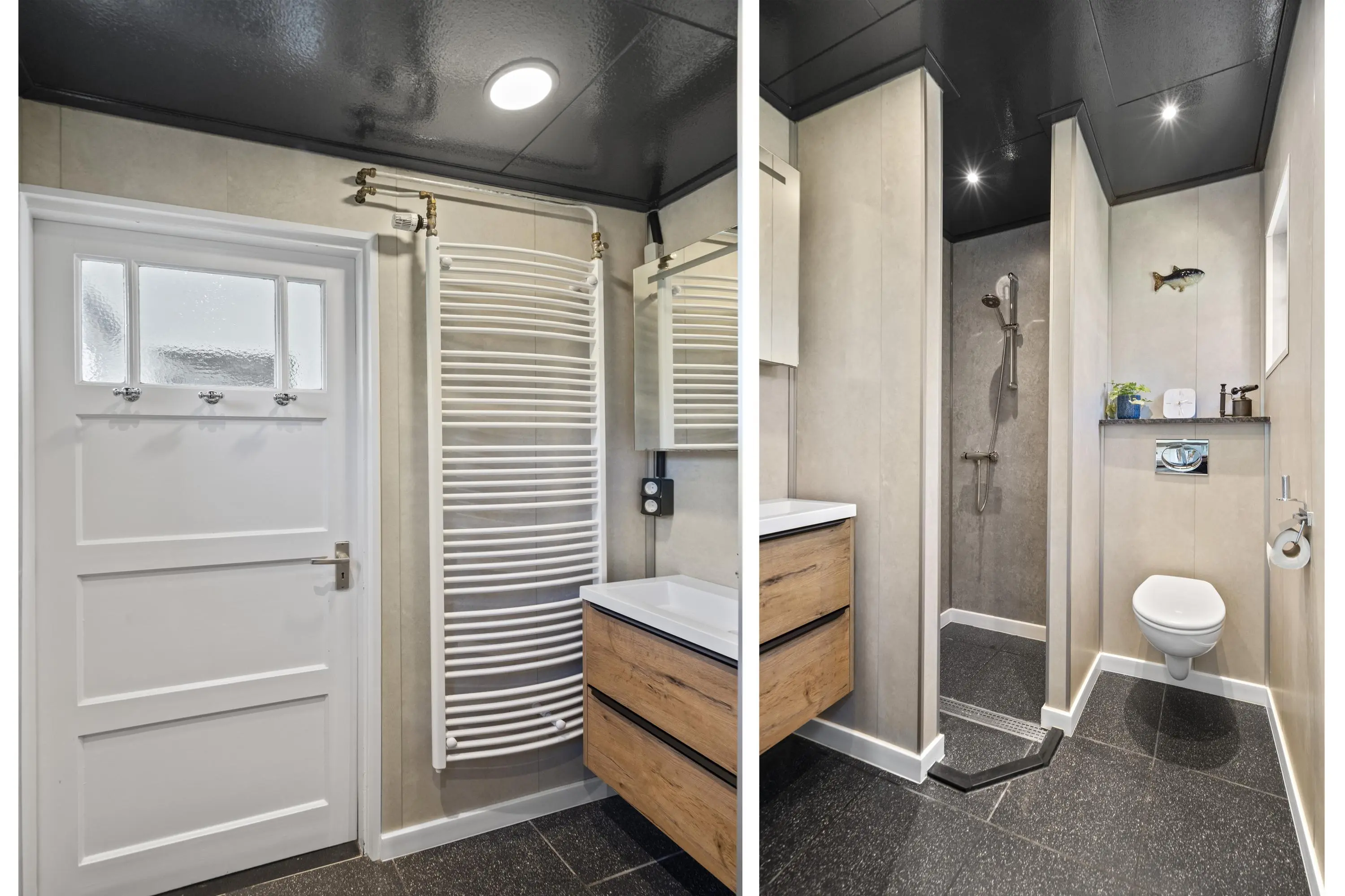 Achter de keuken vind je de praktische wasruimte met plek voor wasmachine en droger, en de Nefit CV-ketel (2023). Vanuit hier bereik je de recent vernieuwde badkamer (2024), die luxe uitstraalt met een inloopdouche, wandcloset, wastafelmeubel en een stoere hardstenen afwerking.