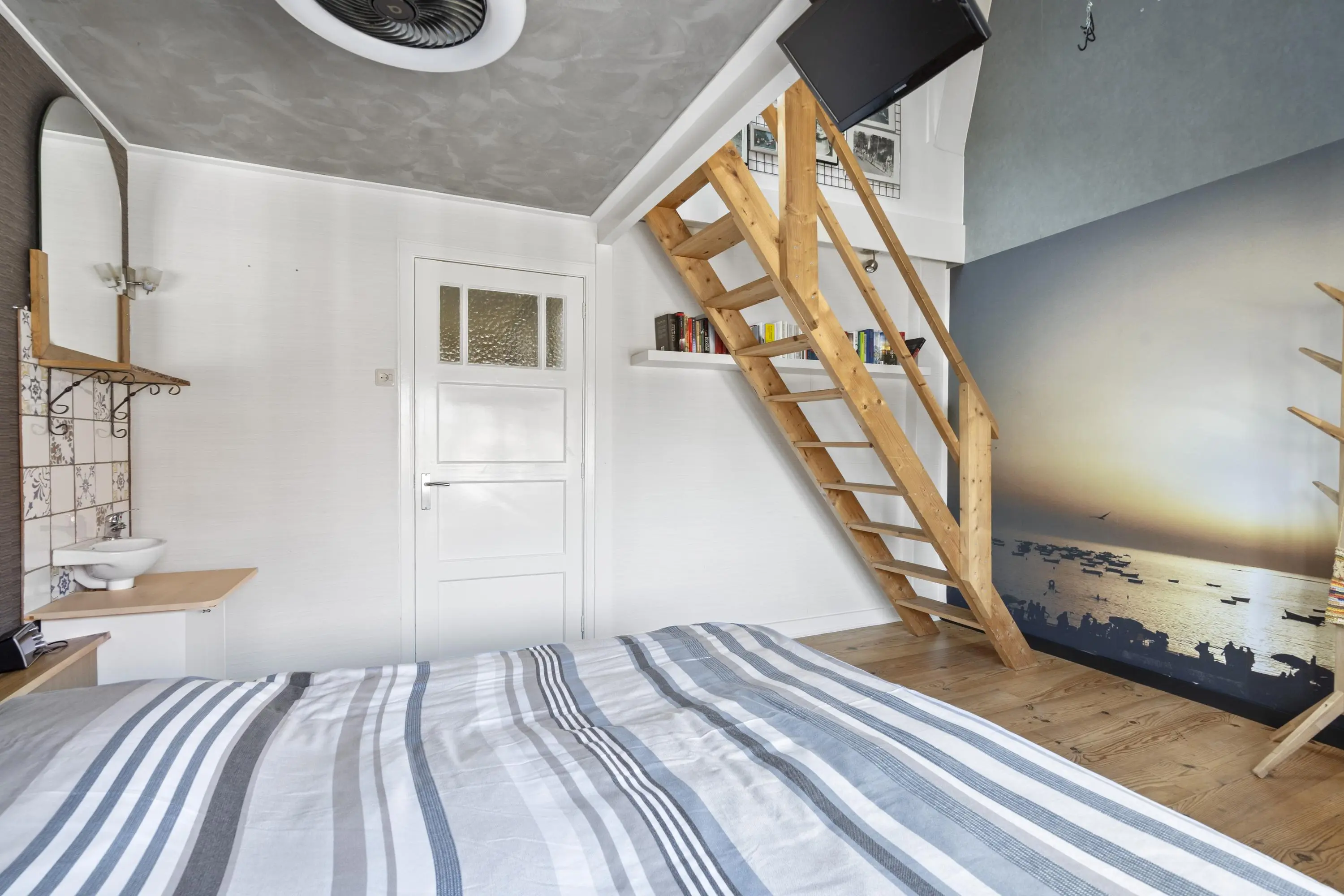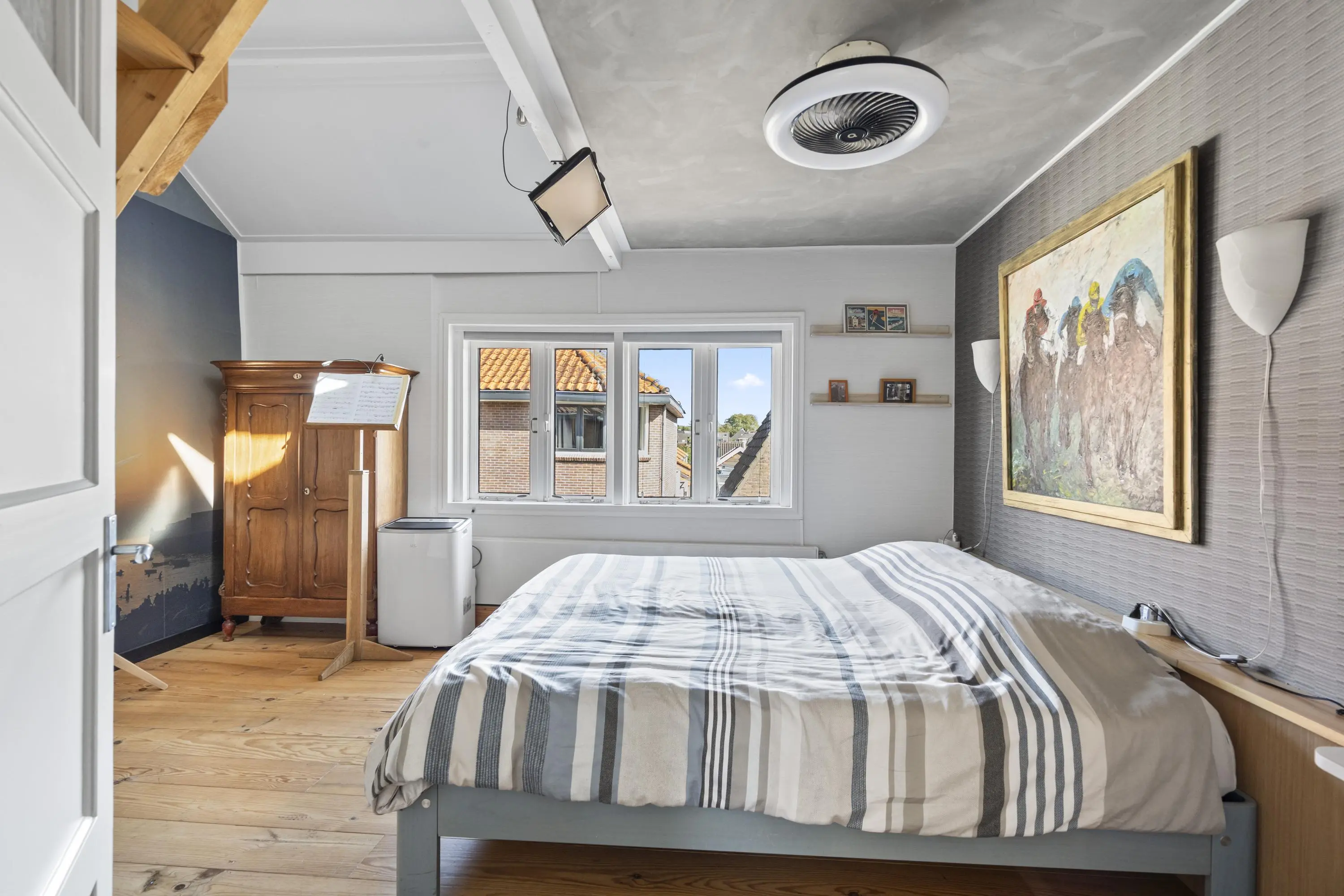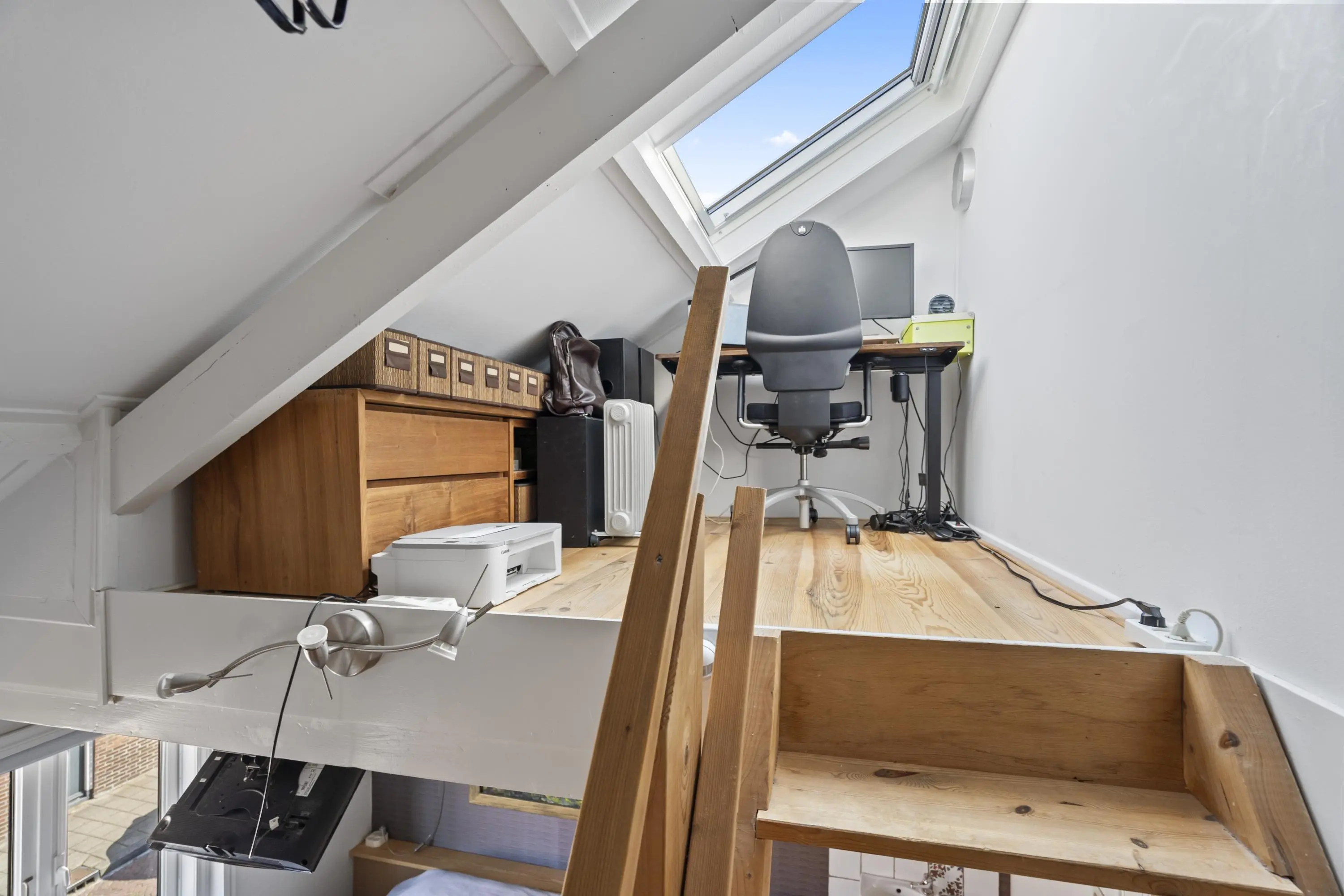 Op de eerste verdieping zijn twee ruime slaapkamers (voorheen drie), beide met houten vloer. De slaapkamer aan de voorzijde beschikt over een wastafelmeubel en een vaste trap naar een lichte werkplek met dakraam. Dit is een perfecte plek om rustig te werken of studeren. De slaapkamer aan de achterzijde heeft eveneens een dakraam en handige bergruimte achter het knieschot. De overloop biedt extra opbergruimte in de vaste kast en toegang tot de vliering via een vlizotrap.