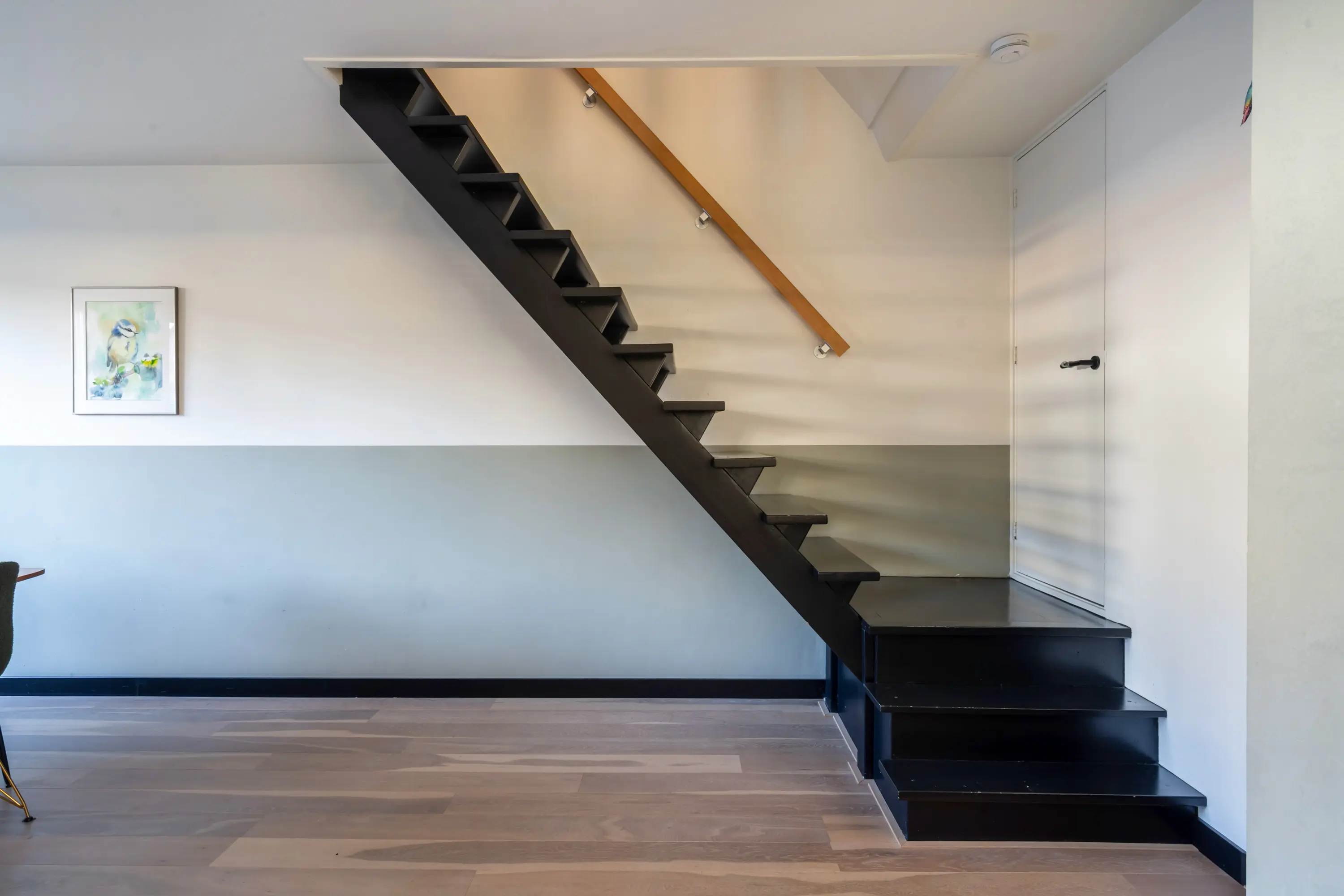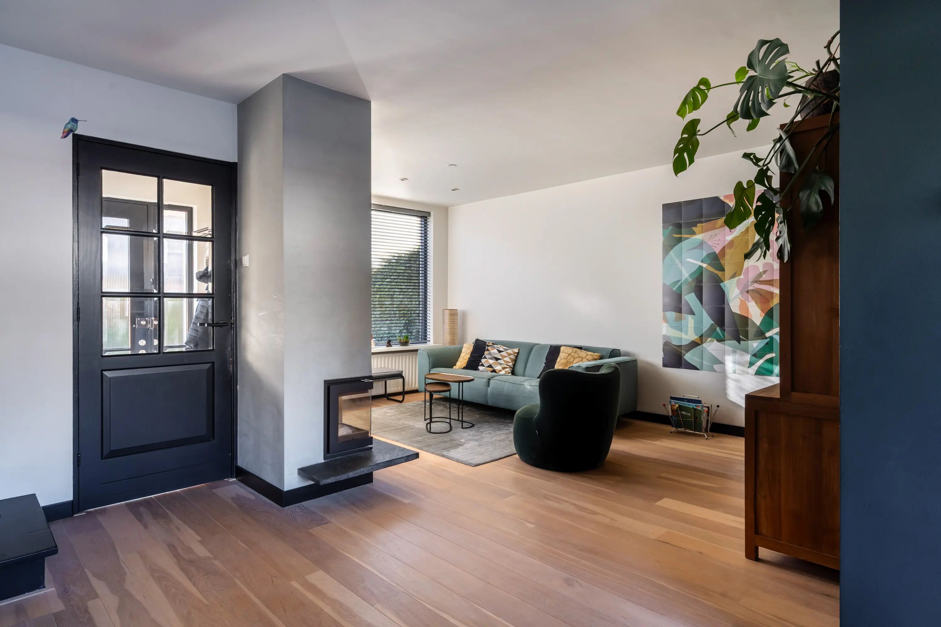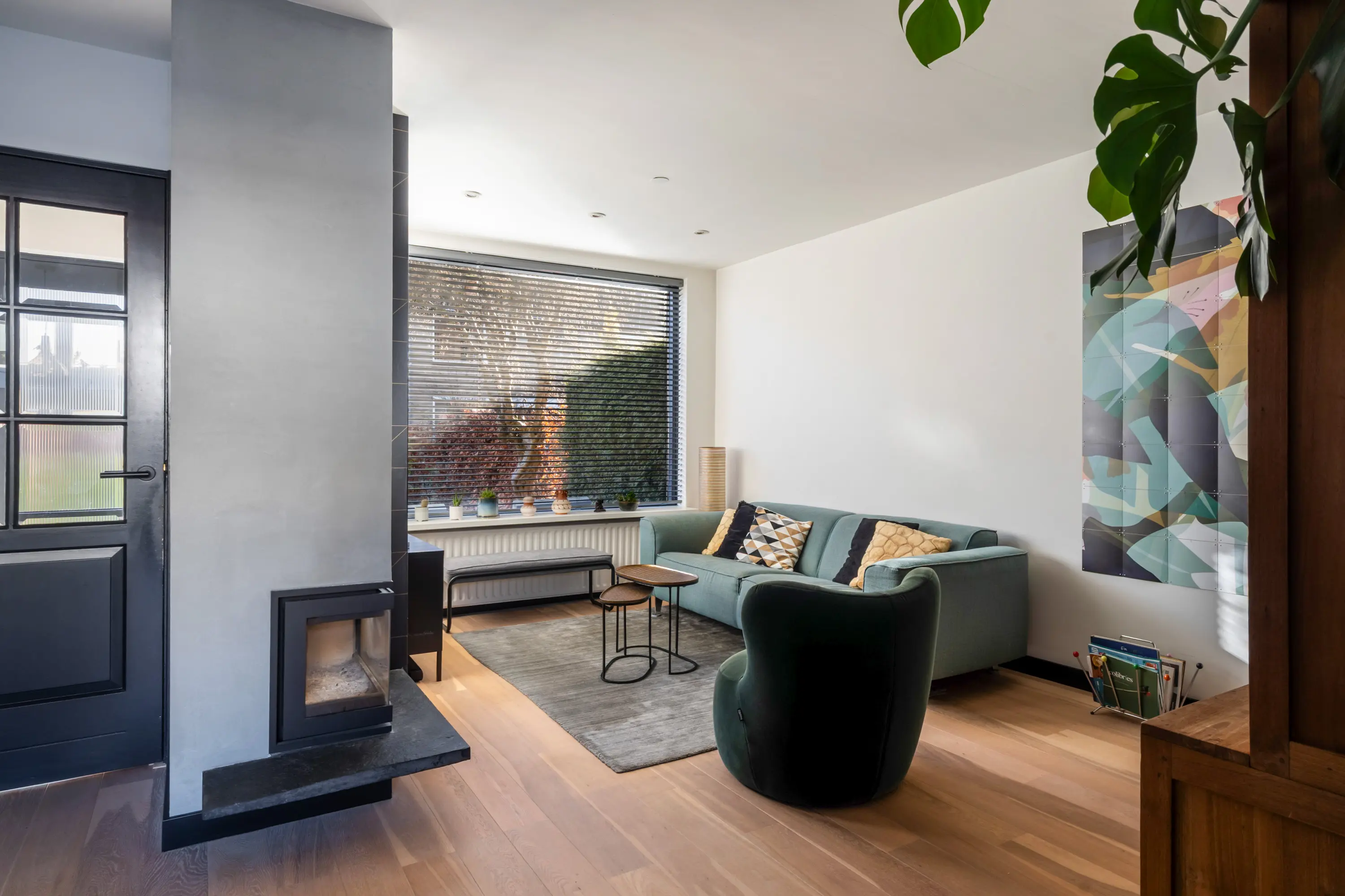 De lichte en speels ingedeelde Z-vormige woonkamer valt direct op door de grote raampartijen en het prettige lichtinval. De trap met bordes geeft toegang tot de eerste verdieping.