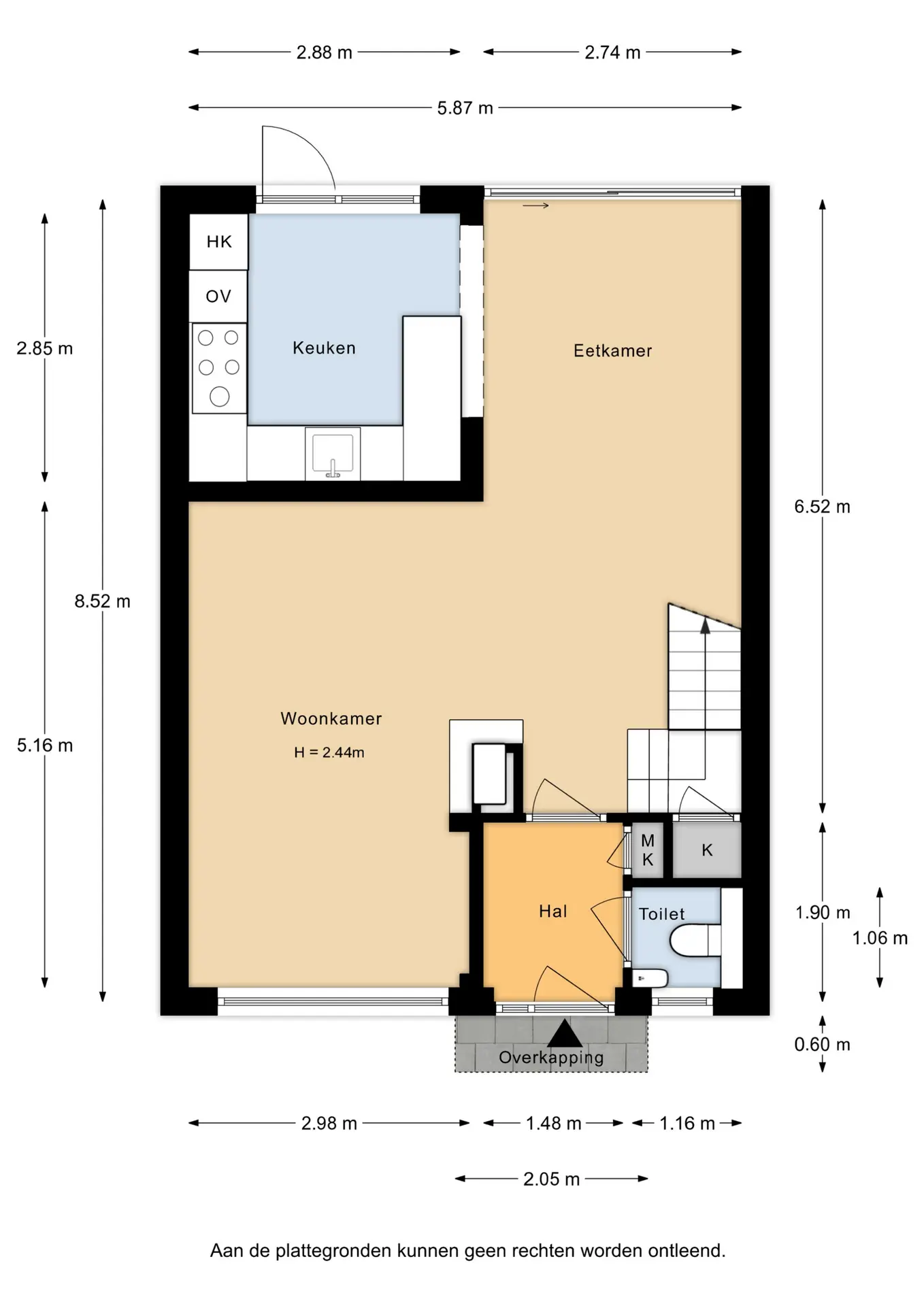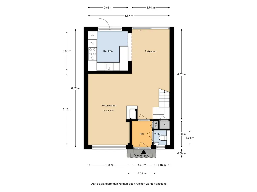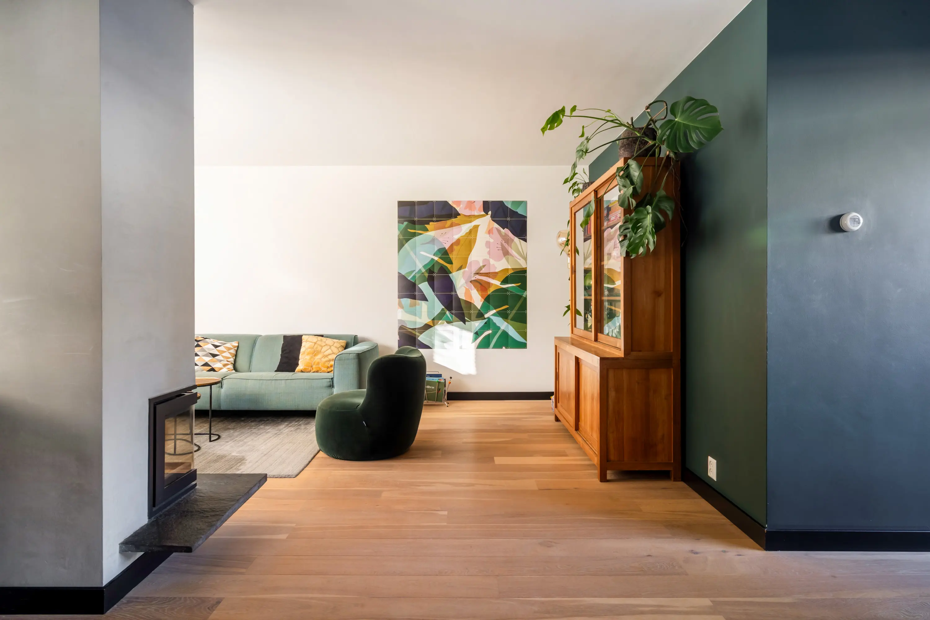 De lichte en speels ingedeelde Z-vormige woonkamer valt direct op door de grote raampartijen en het prettige lichtinval. De trap met bordes geeft toegang tot de eerste verdieping.
