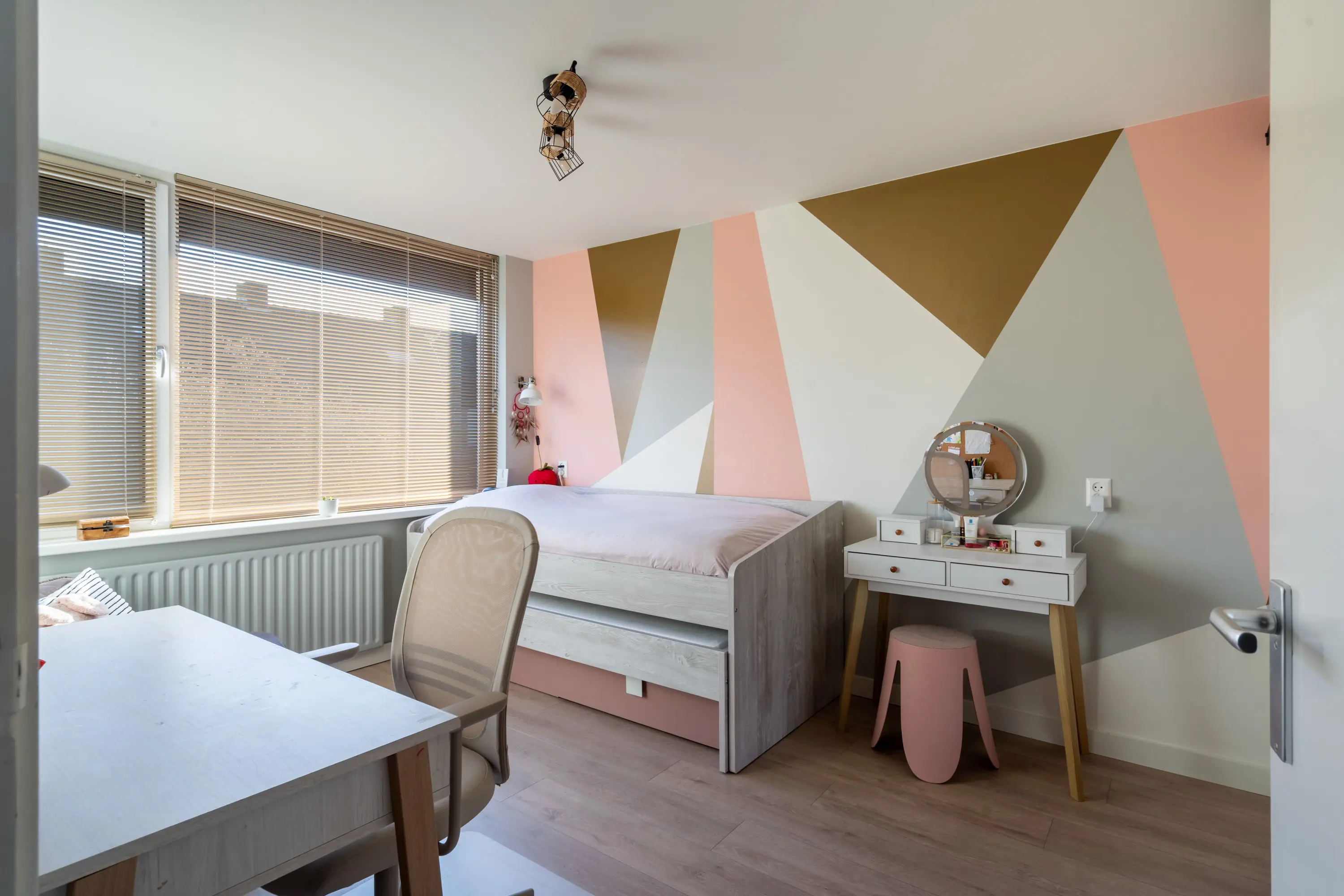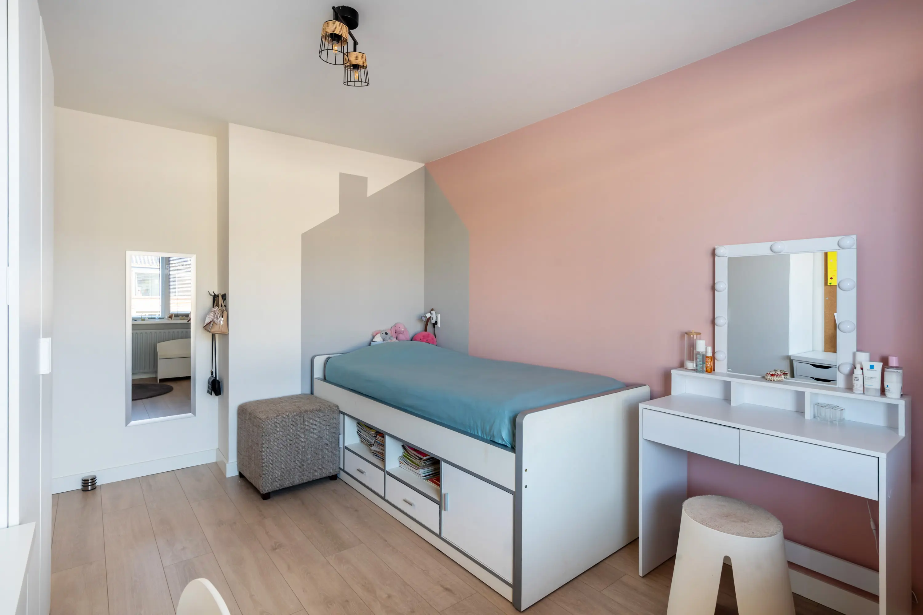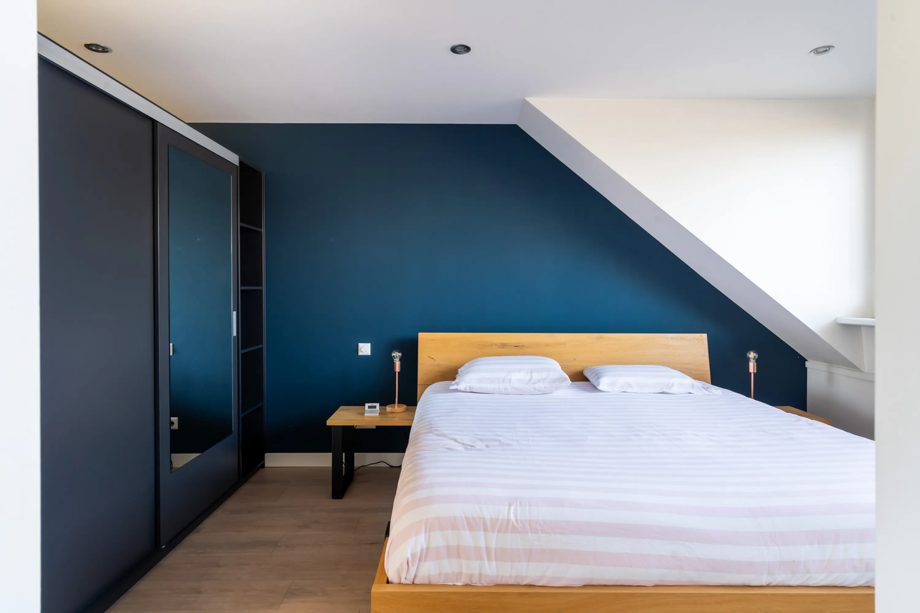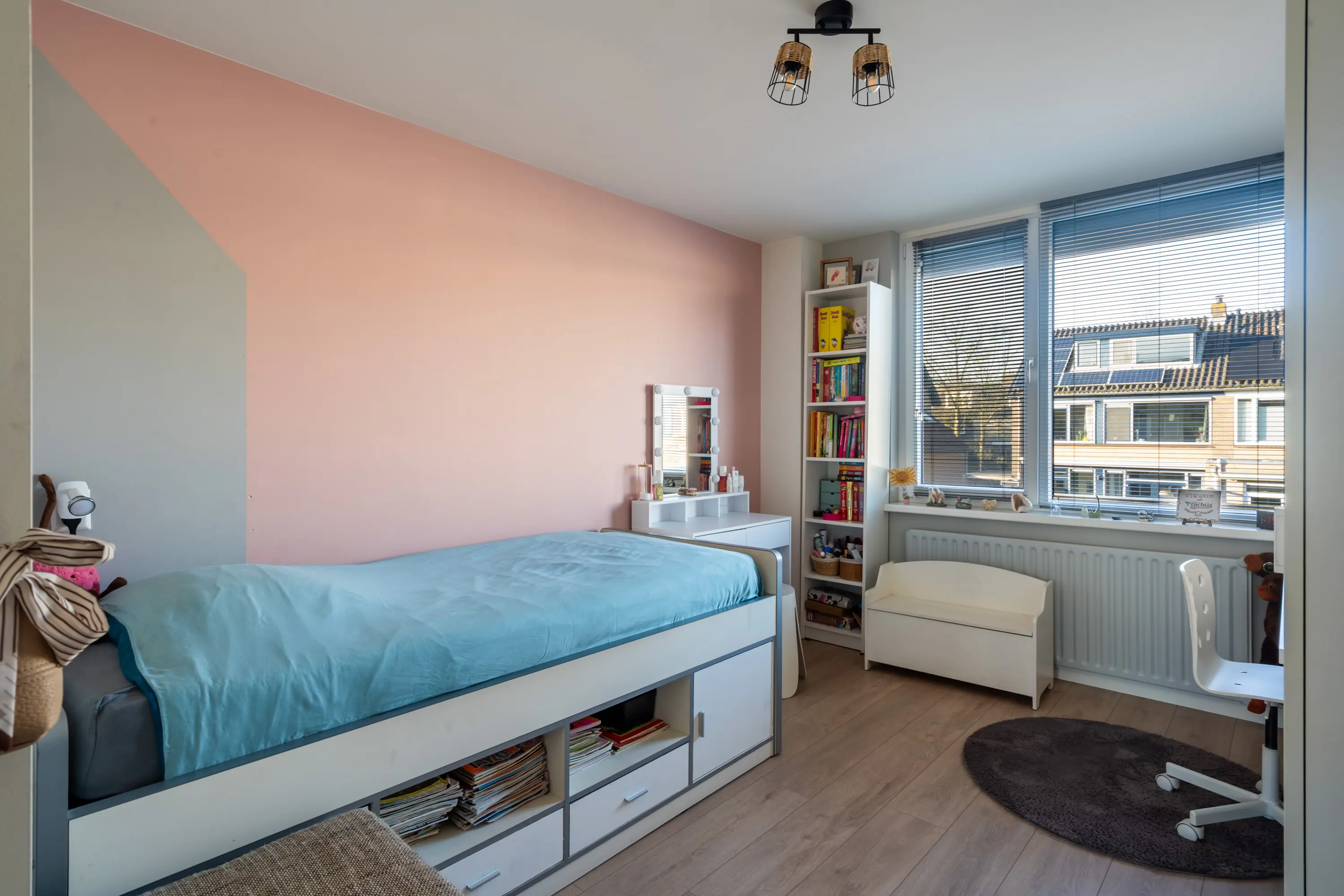 Op deze verdieping bevinden zich drie ruime slaapkamers, waarvan één met een dubbele vaste kast. De slaapkamer aan de voorzijde en de slaapkamer aan de achterzijde zijn uitgerust met een rolluik, wat zorgt voor extra comfort, privacy en verkoeling.