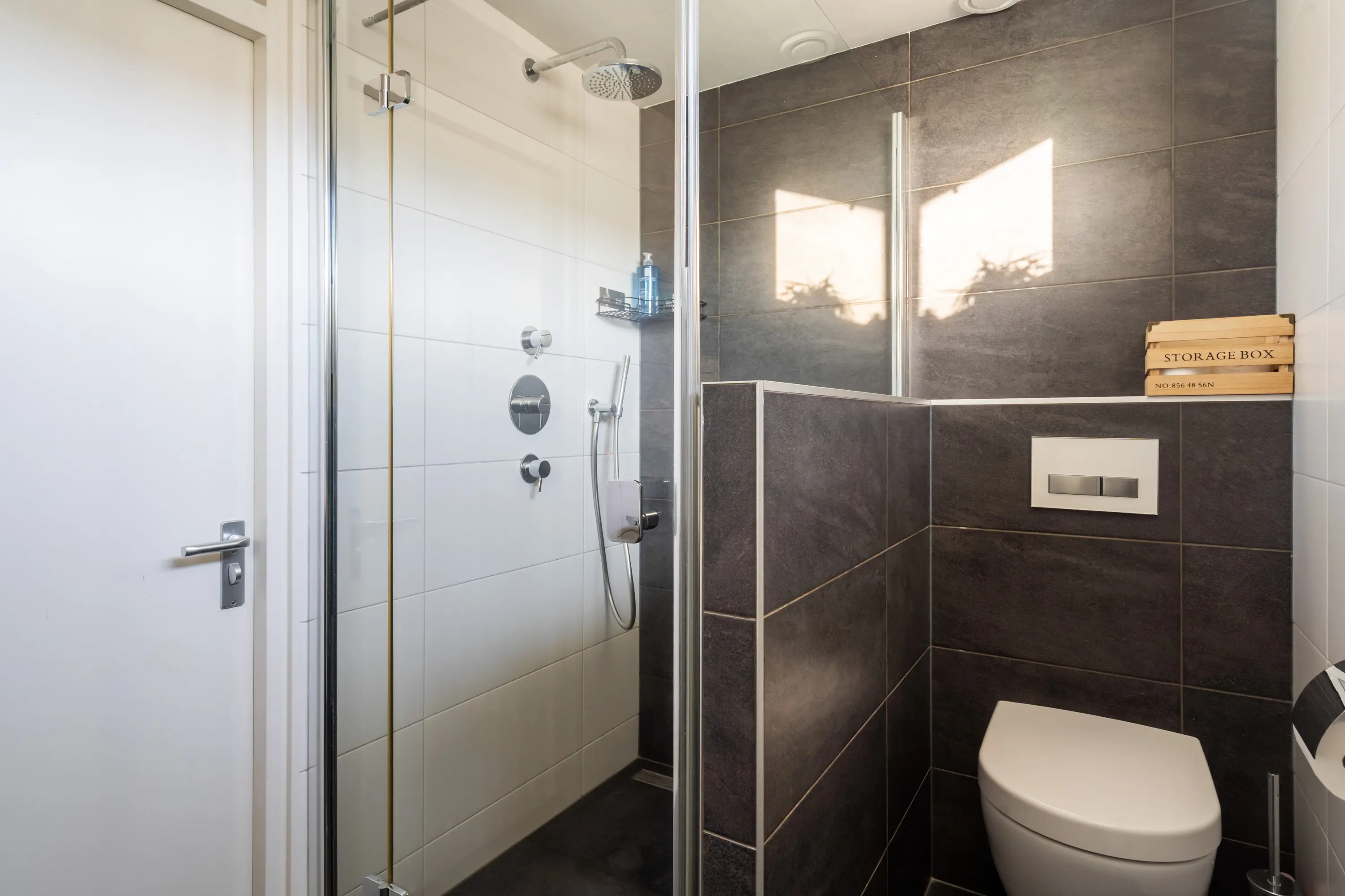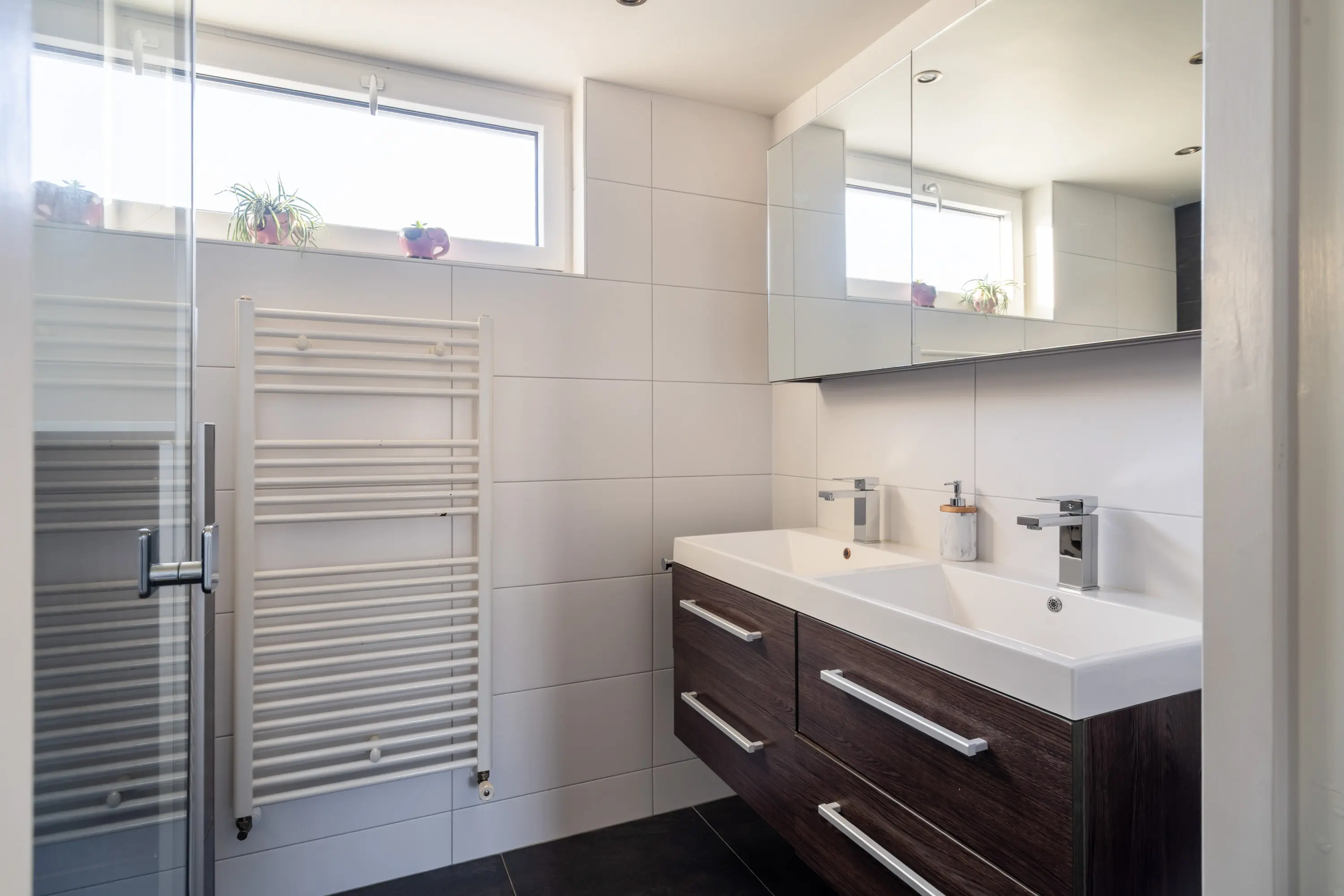 De moderne, volledig betegelde badkamer is voorzien van een ruime inloopdouche met inbouwkranen, wandcloset, designradiator en een dubbele wastafel met meubel.