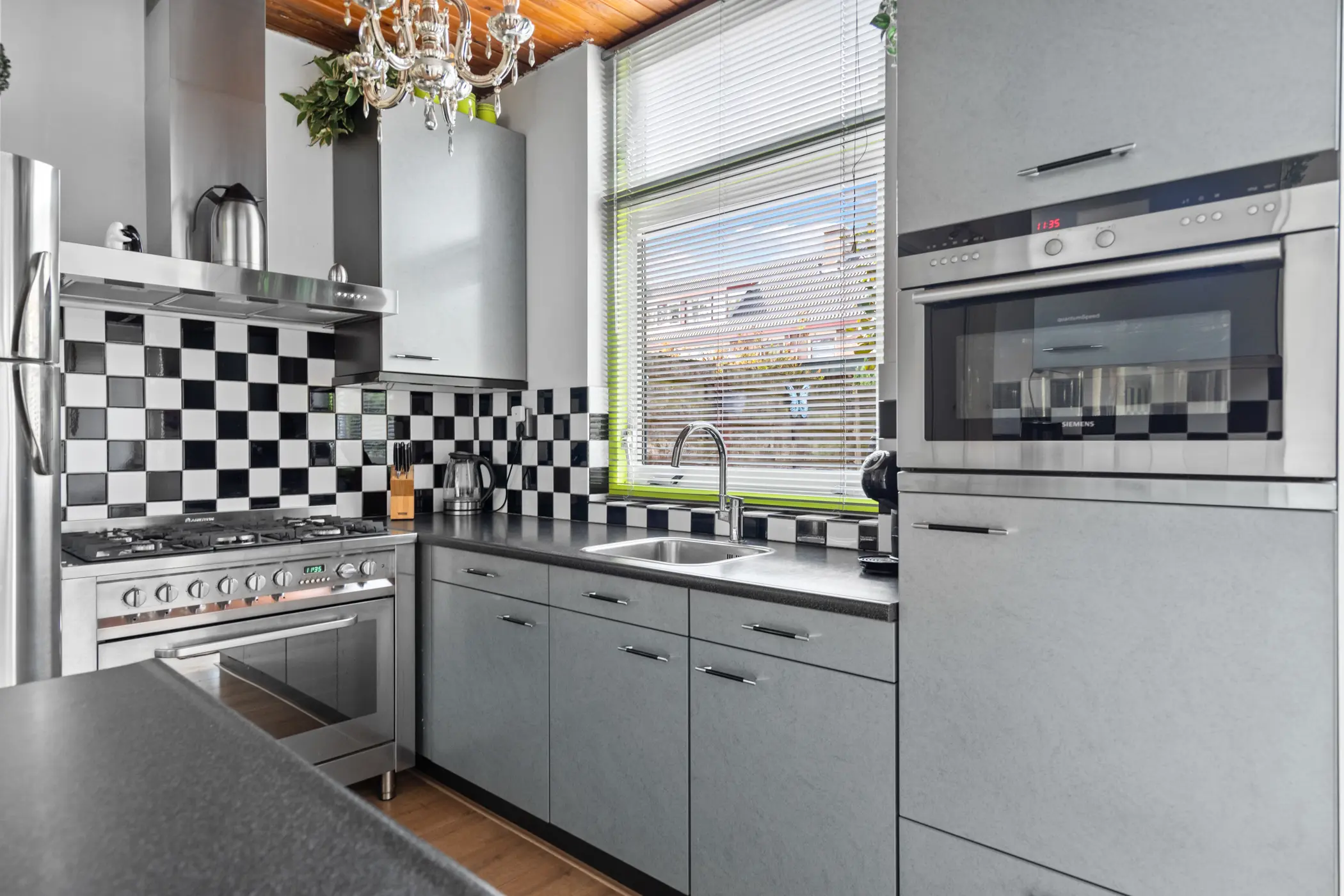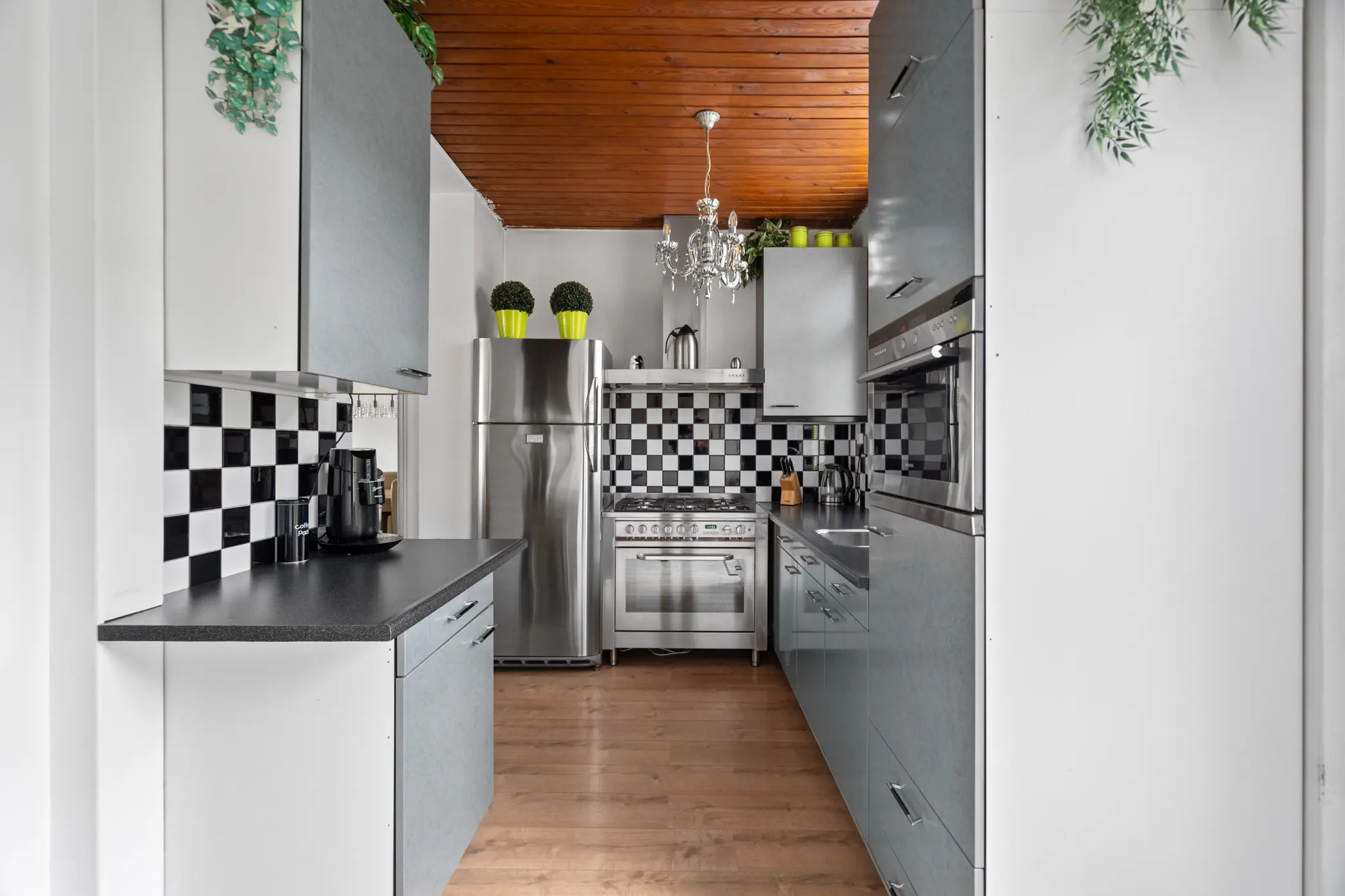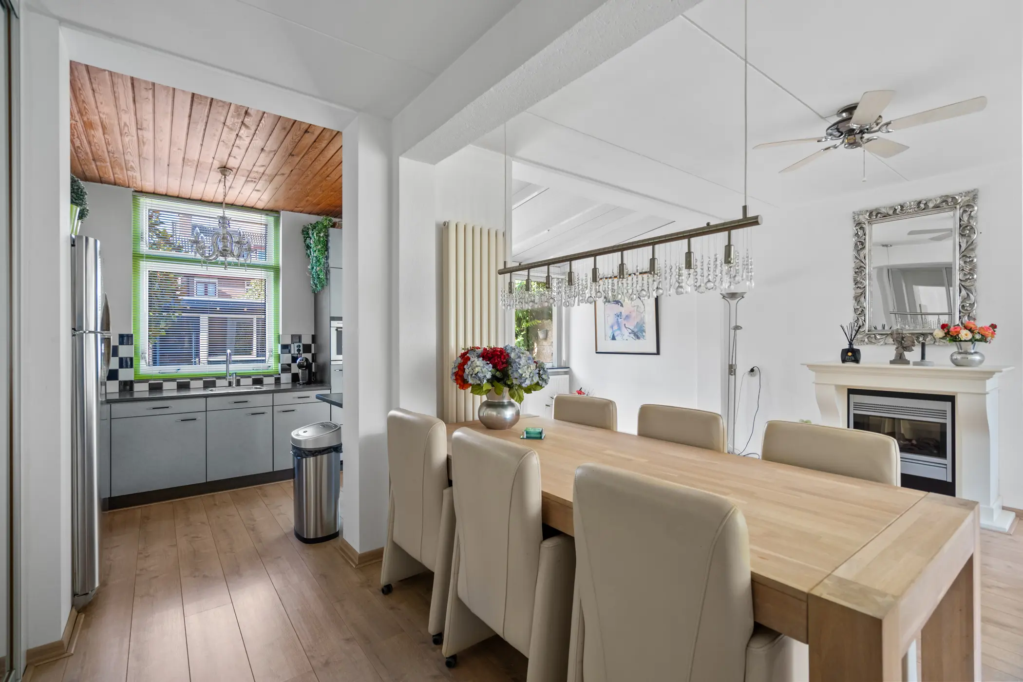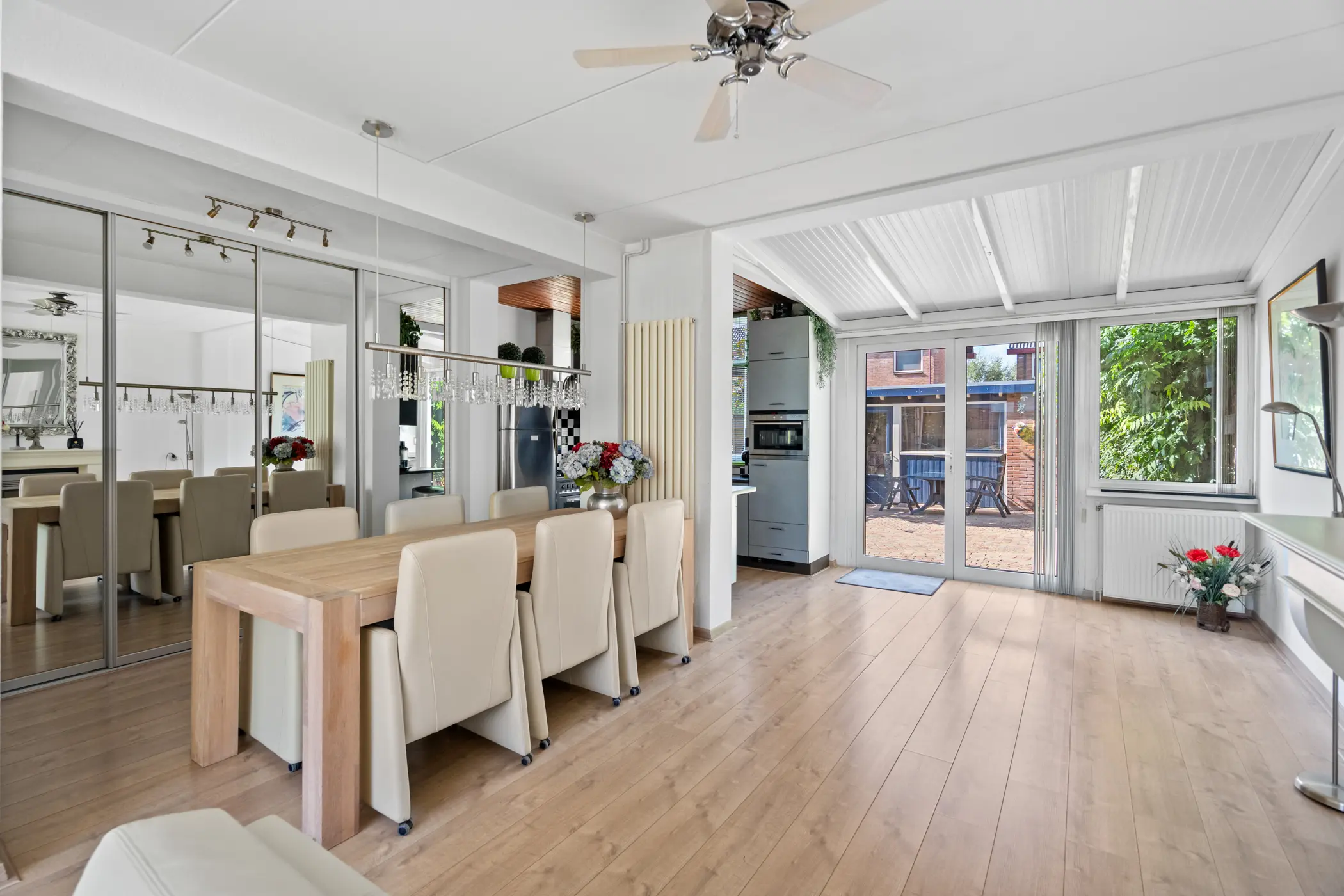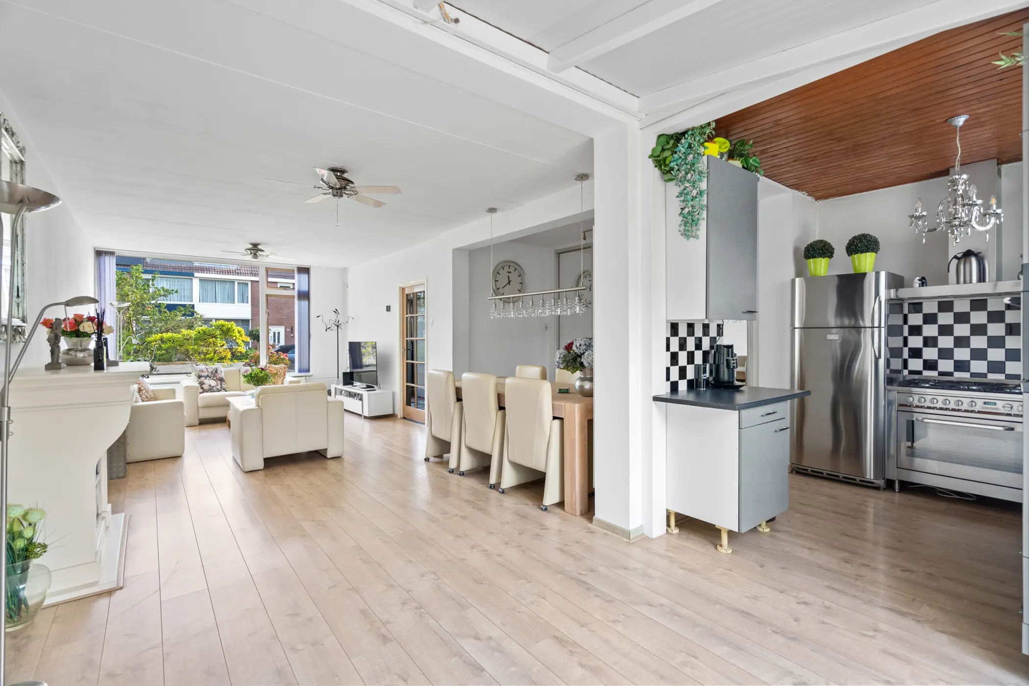 Via de entree bereikt u de hal met toilet, meterkast, trapopgang en een praktische bergkast. De royale uitgebouwde woonkamer is heerlijk licht en voelt extra ruim door de vaste spiegelkast. Bovendien beschikt de woonkamer over een uitbouw en openslaande deuren naar de tuin, waardoor binnen en buiten mooi in elkaar overlopen. De open keuken is uitgerust met diverse inbouwapparatuur en biedt alle gemakken voor dagelijks koken.