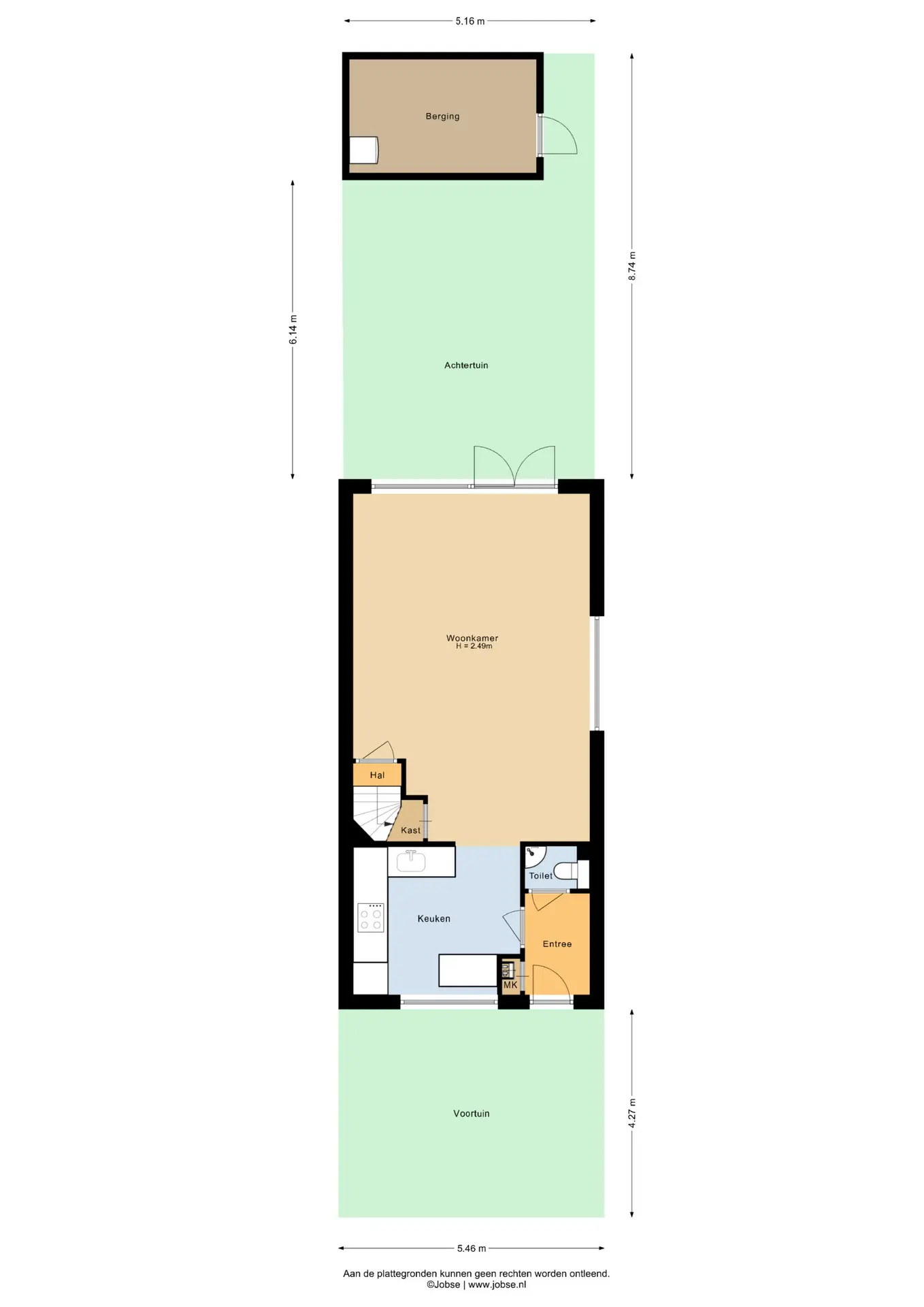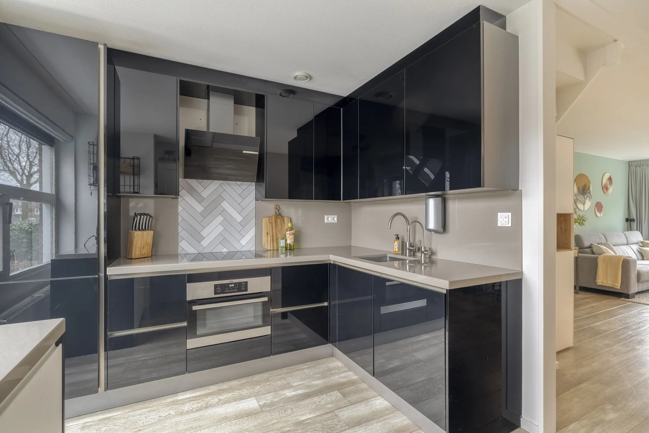 Via de verzorgde voortuin bereikt u de entree van de woning. In de hal bevinden zich de meterkast en een modern toilet. Aan de voorzijde van de woning bevindt zich de moderne keuken. De keuken is compleet uitgerust met diverse inbouwapparatuur, waaronder een inductiekookplaat, combi-magnetron, koelkast, vriezer, vaatwasser en afzuigschouw, afgewerkt met een composiet aanrechtblad. De uitgebouwde woonkamer aan de achterzijde vormt het hart van de woning. Deze tuingerichte leefruimte is royaal opgezet en voorzien van een laminaatvloer, strak gestucte wanden en een praktische trapkast. Dankzij de openslaande deuren en het extra zijraam geniet de ruimte van een prachtige lichtinval en een fijne verbinding met de tuin. De openslaande deuren geven toegang tot de achtertuin met vrijstaande houten berging en achterom.