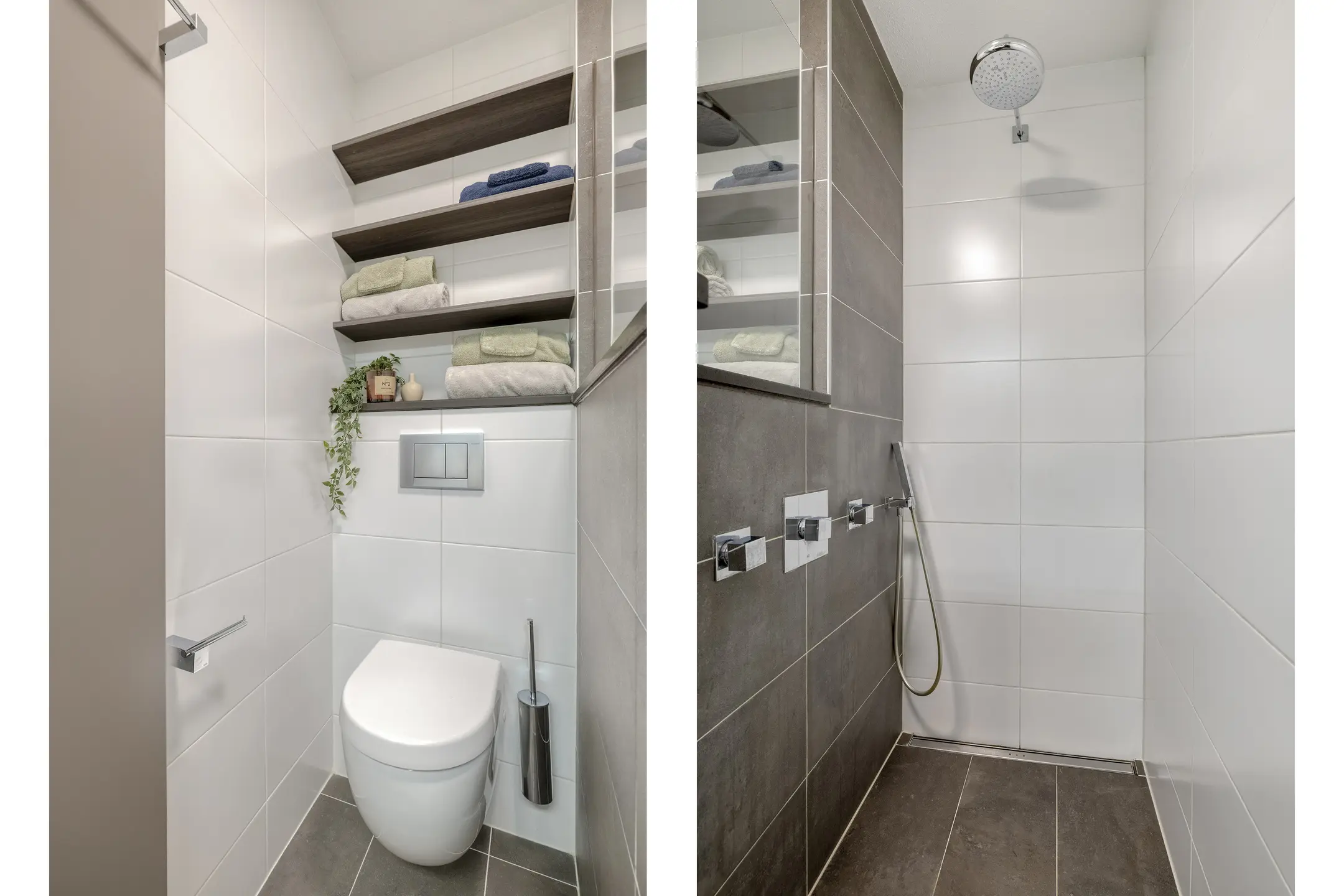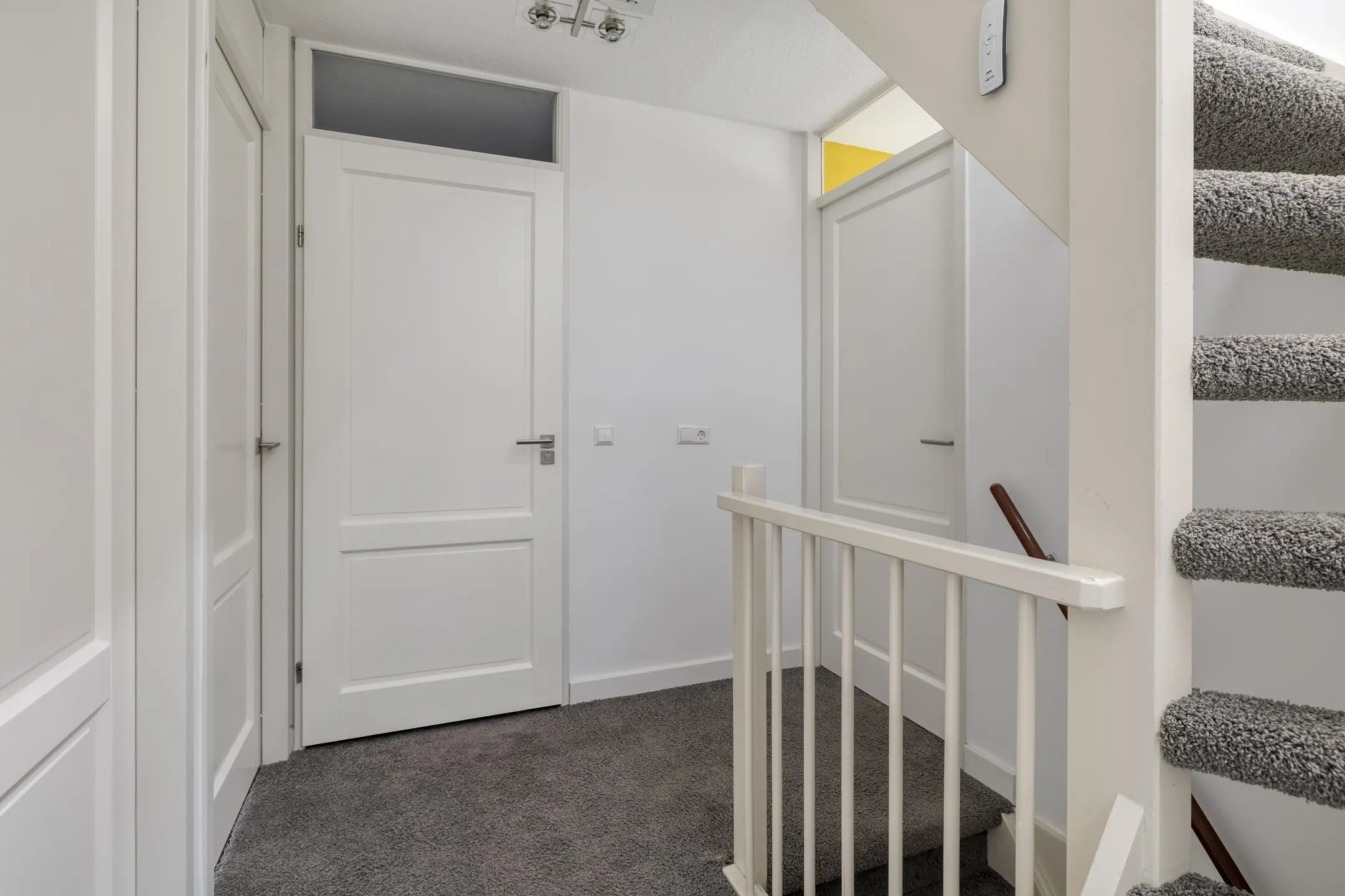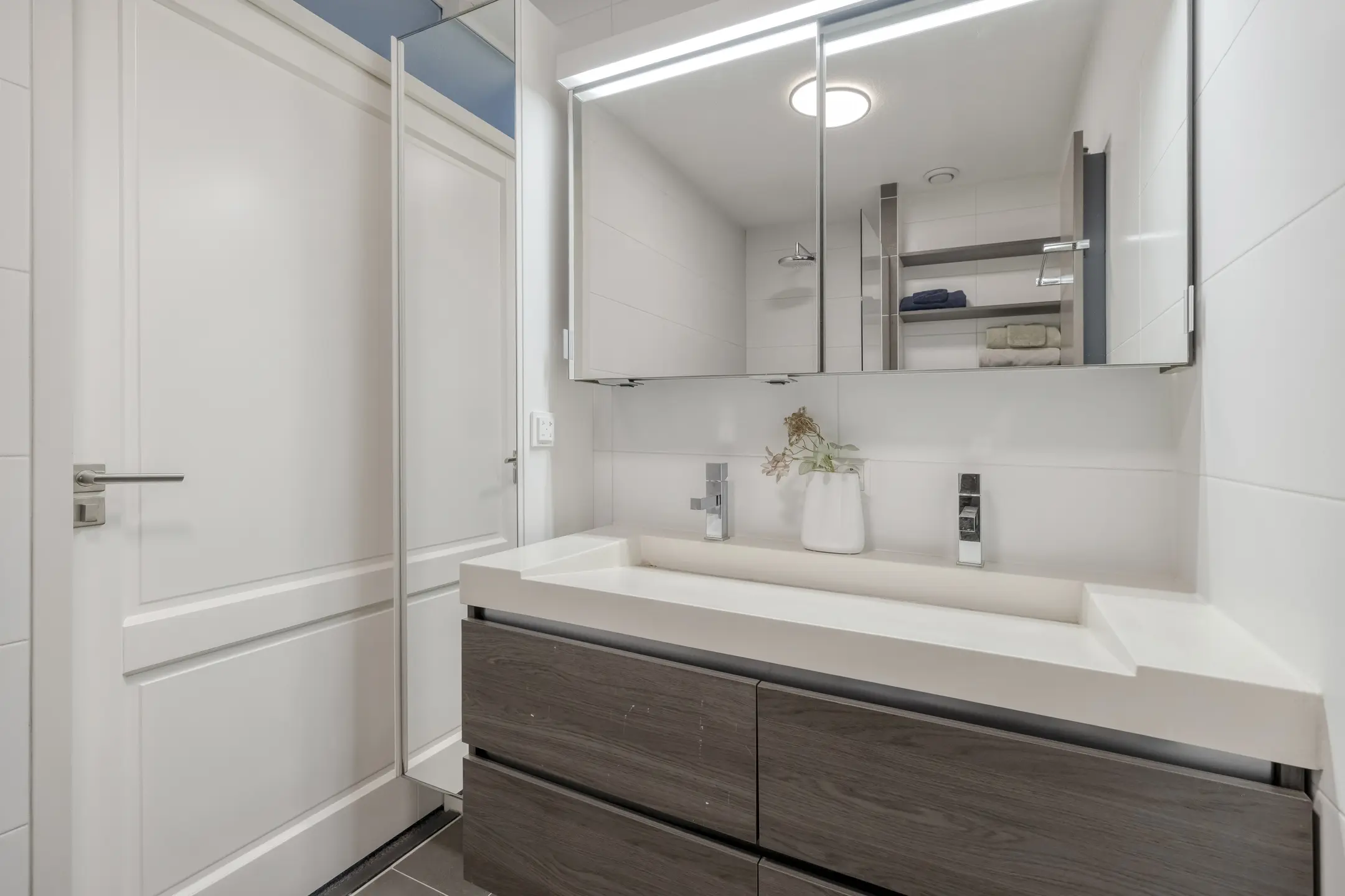De overloop geeft toegang tot drie comfortabele slaapkamers en de moderne badkamer. Aan de voorzijde bevindt zich een royale slaapkamer over de volledige breedte van de woning, met extra zijraam en rolluiken. Deze kamer biedt een prettige lichtinval en een rustig uitzicht. Aan de achterzijde liggen nog twee goed bemeten slaapkamers, mede dankzij de uitbouw op deze verdieping. De moderne badkamer is stijlvol uitgevoerd en voorzien van een inloopdouche met drain, hand- en regendouche, een dubbele wastafel met meubel en een tweede toilet. Via een vaste trap bereikt u de tweede verdieping.