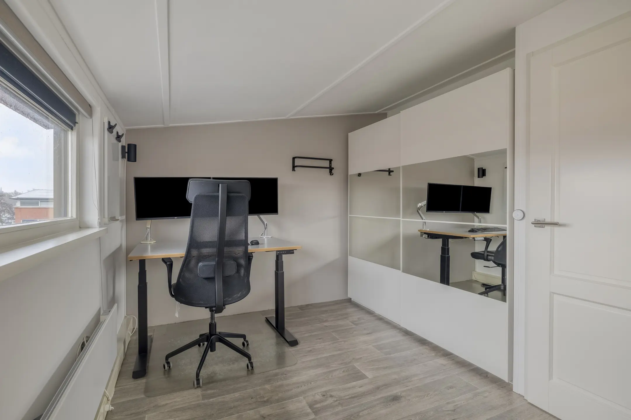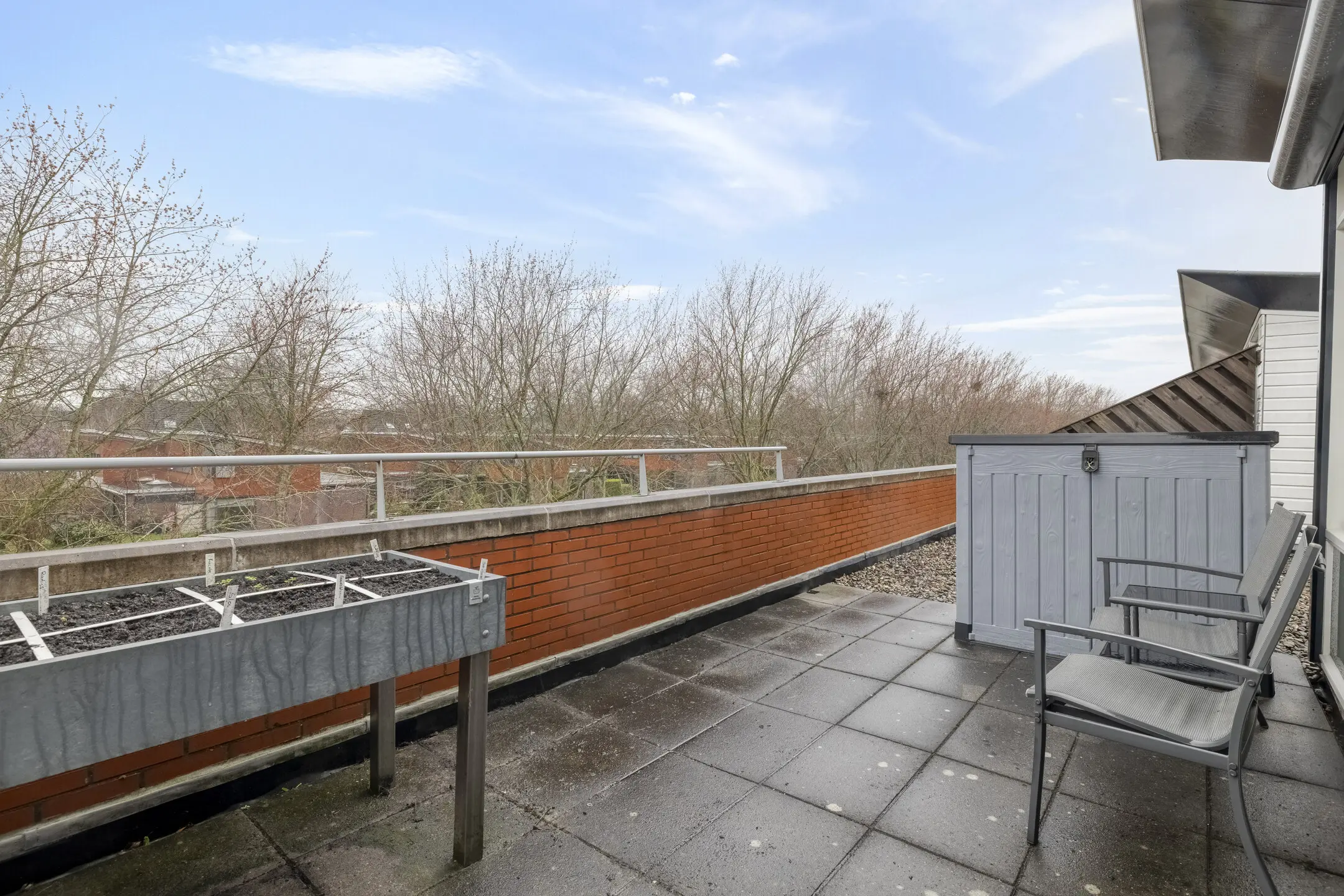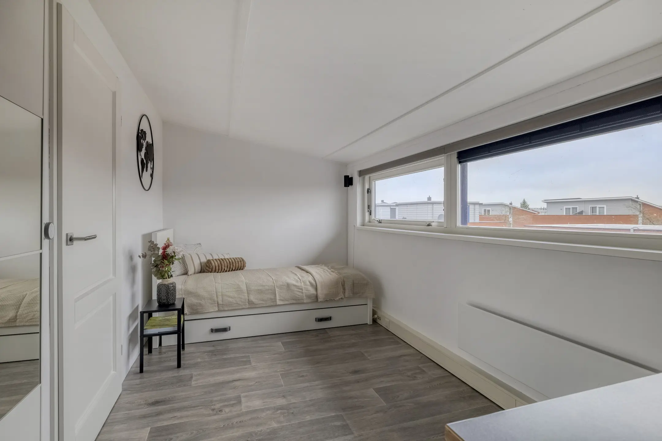 De ruim opgezette voorzolder biedt toegang tot de volwaardige vierde slaapkamer, een aparte bergruimte en het zonnige dakterras op het zuidwesten, een heerlijke plek om tot in de avond van de zon te genieten. Netjes weggewerkt in de bergruimte bevinden zich de opstelplaatsen van de cv-ketel en de mechanische ventilatie, evenals de aansluitingen voor wasmachine en droger. De voorzolder is voorzien van rolluiken. Deze zorgen voor extra comfort en helpen de bovenverdieping ook op warme dagen aangenaam koel te houden.