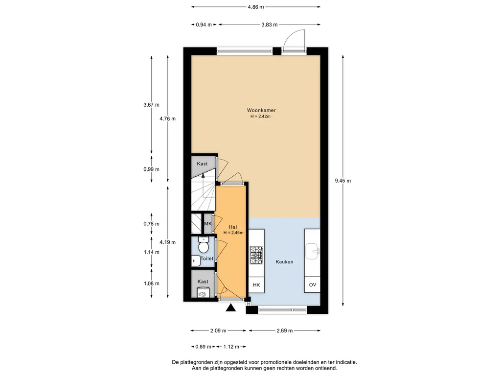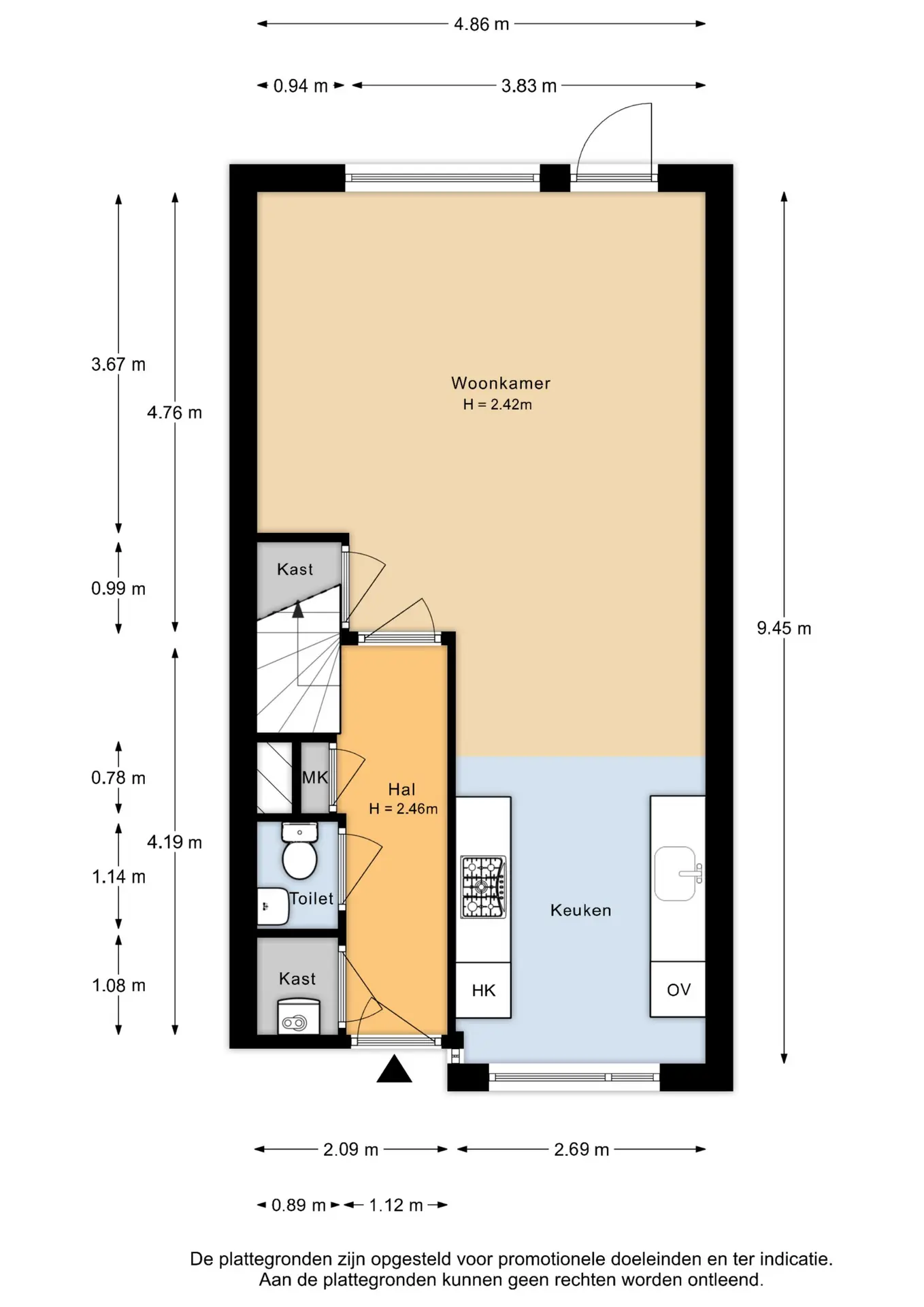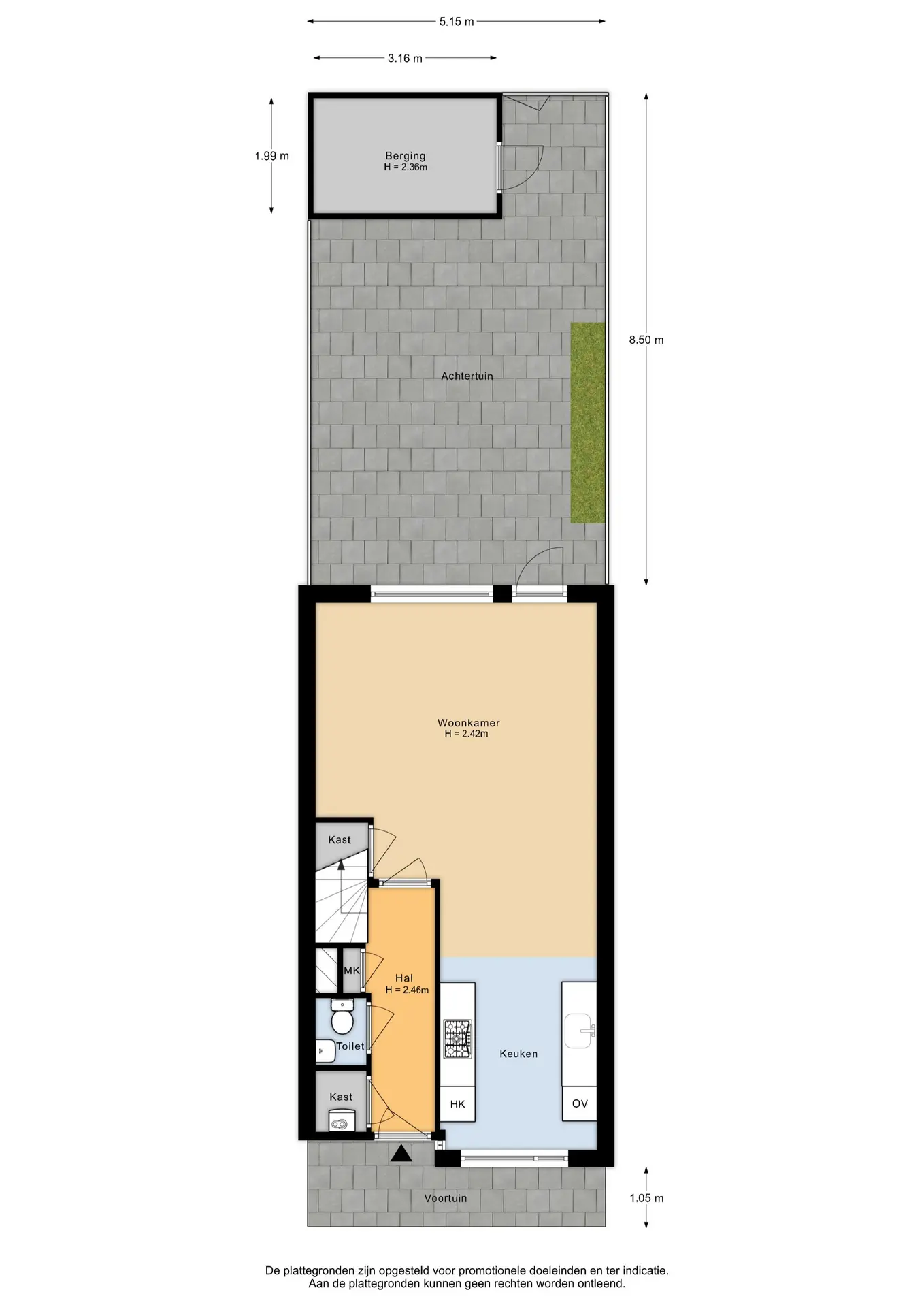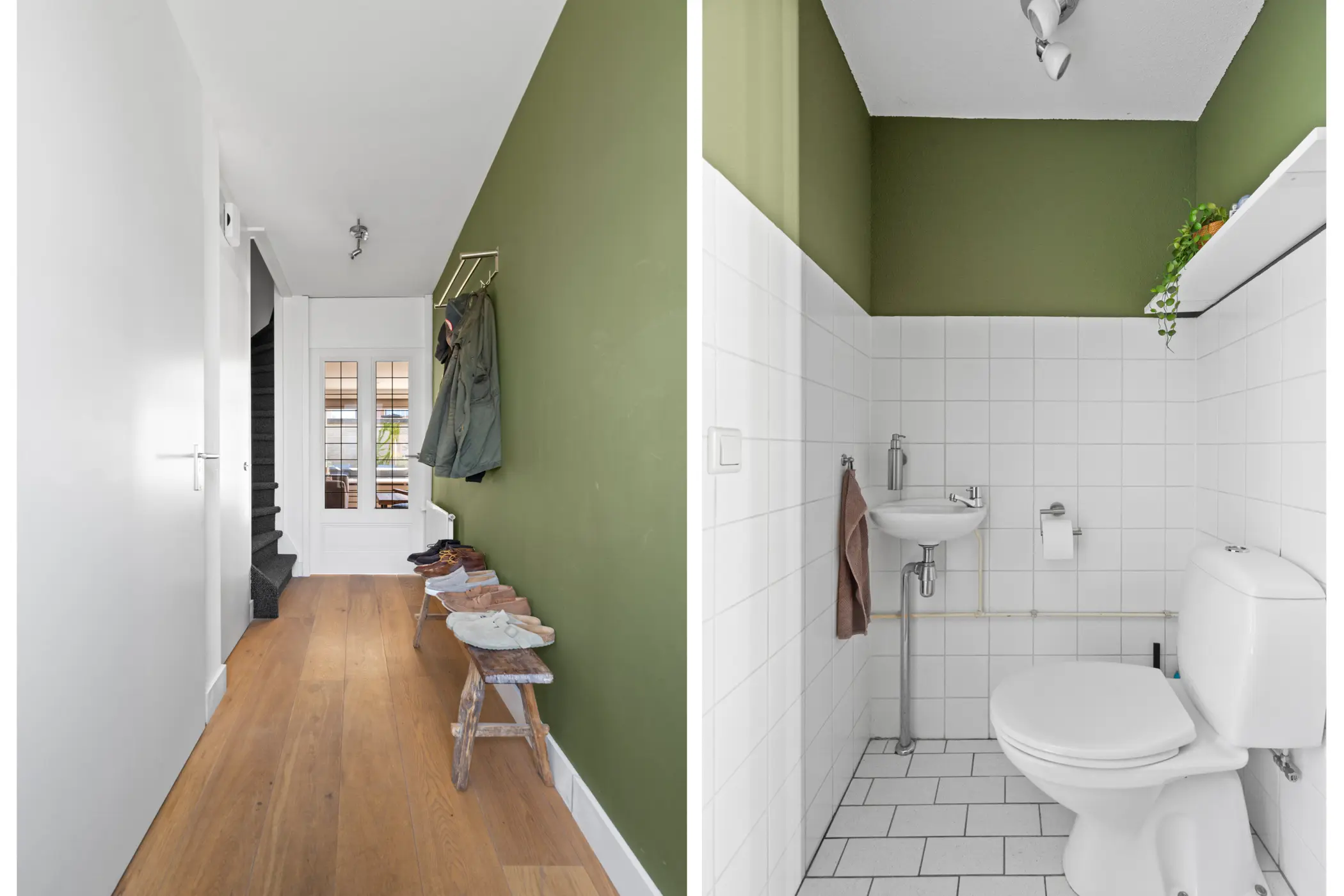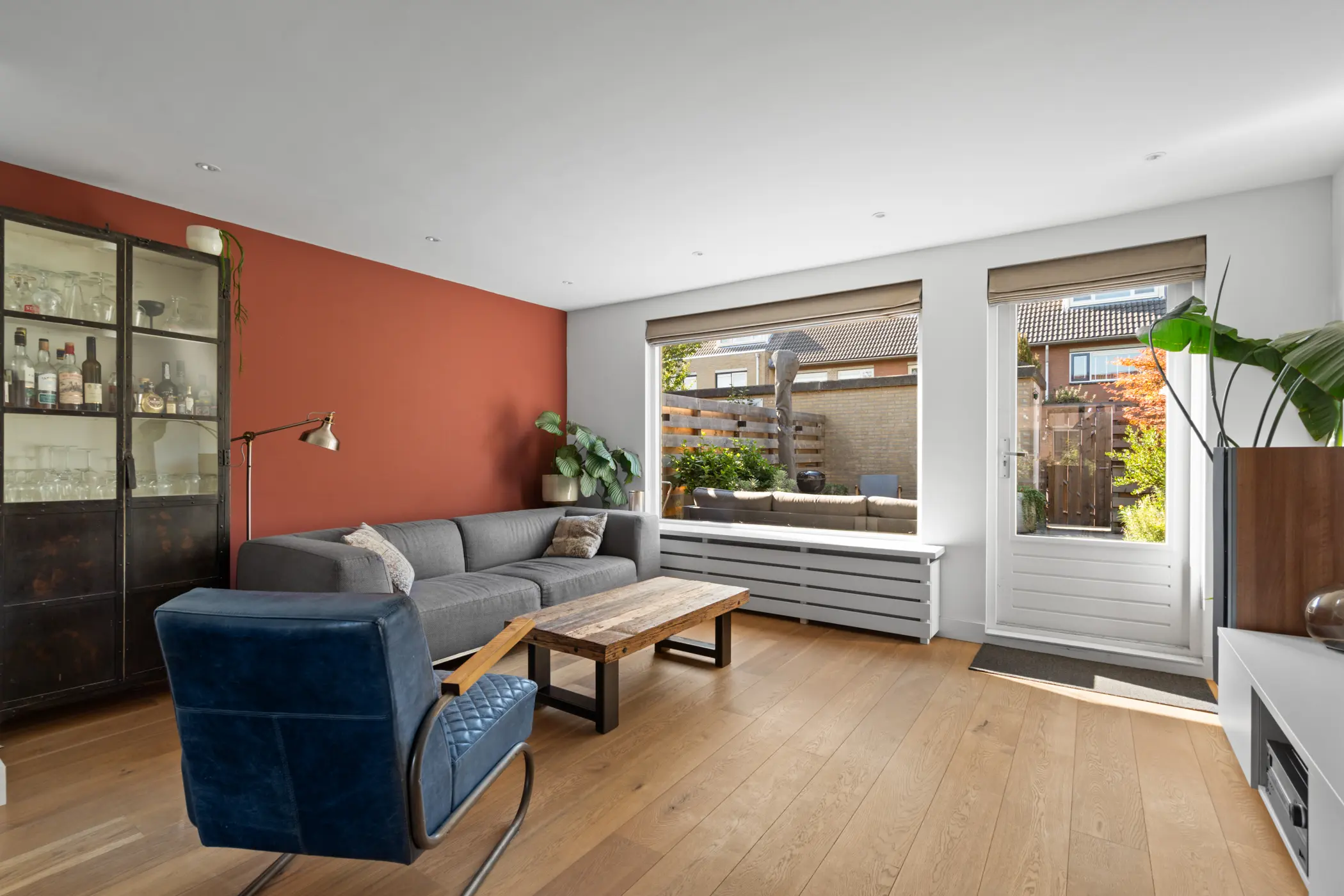 Je komt binnen in de hal met meterkast, een handige vaste kast en een keurig half betegeld toilet met fonteintje. Ook vind je hier de trapopgang naar de eerste verdieping. In de vaste kast vind je de opstelplaats voor de Cv-ketel en een aansluitpunt voor de wasmachine. De tuingerichte woonkamer voelt direct warm en uitnodigend aan, mede dankzij de Eiken Lamel Parketvloer die de hele begane grond siert. Hier is het heerlijk vertoeven, met uitzicht op de zonnige tuin.