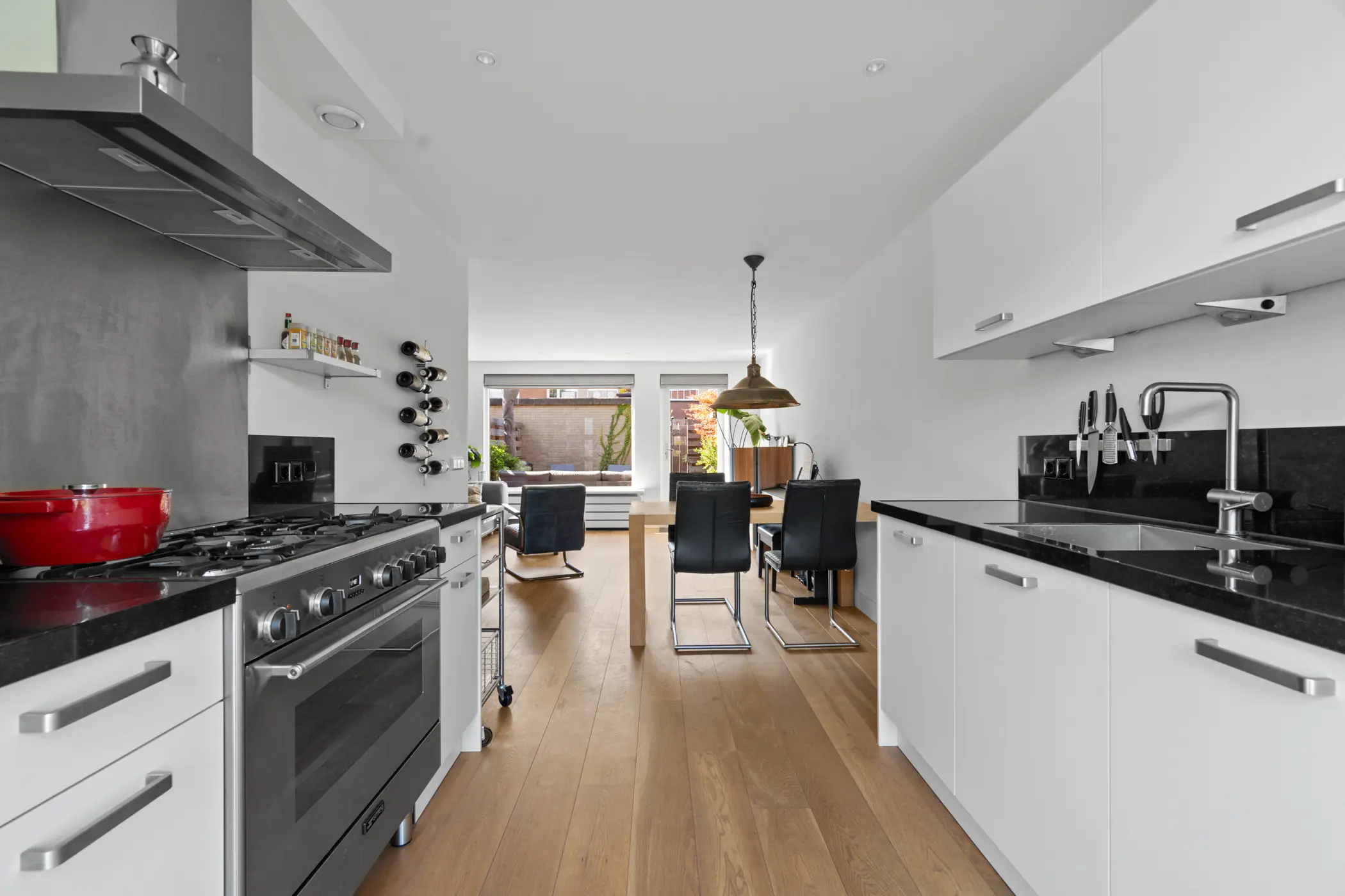 De keuken bevindt zich aan de voorzijde. Dankzij het stenen blad en de complete uitrusting is dit een fijne plek voor iedere kookliefhebber. De keuken beschikt over een breed 5-pits gasfornuis, een afzuigkap, een vaatwasser, combi-oven en koel-/vriescombinatie. De praktische indeling biedt daarnaast volop kastruimte.