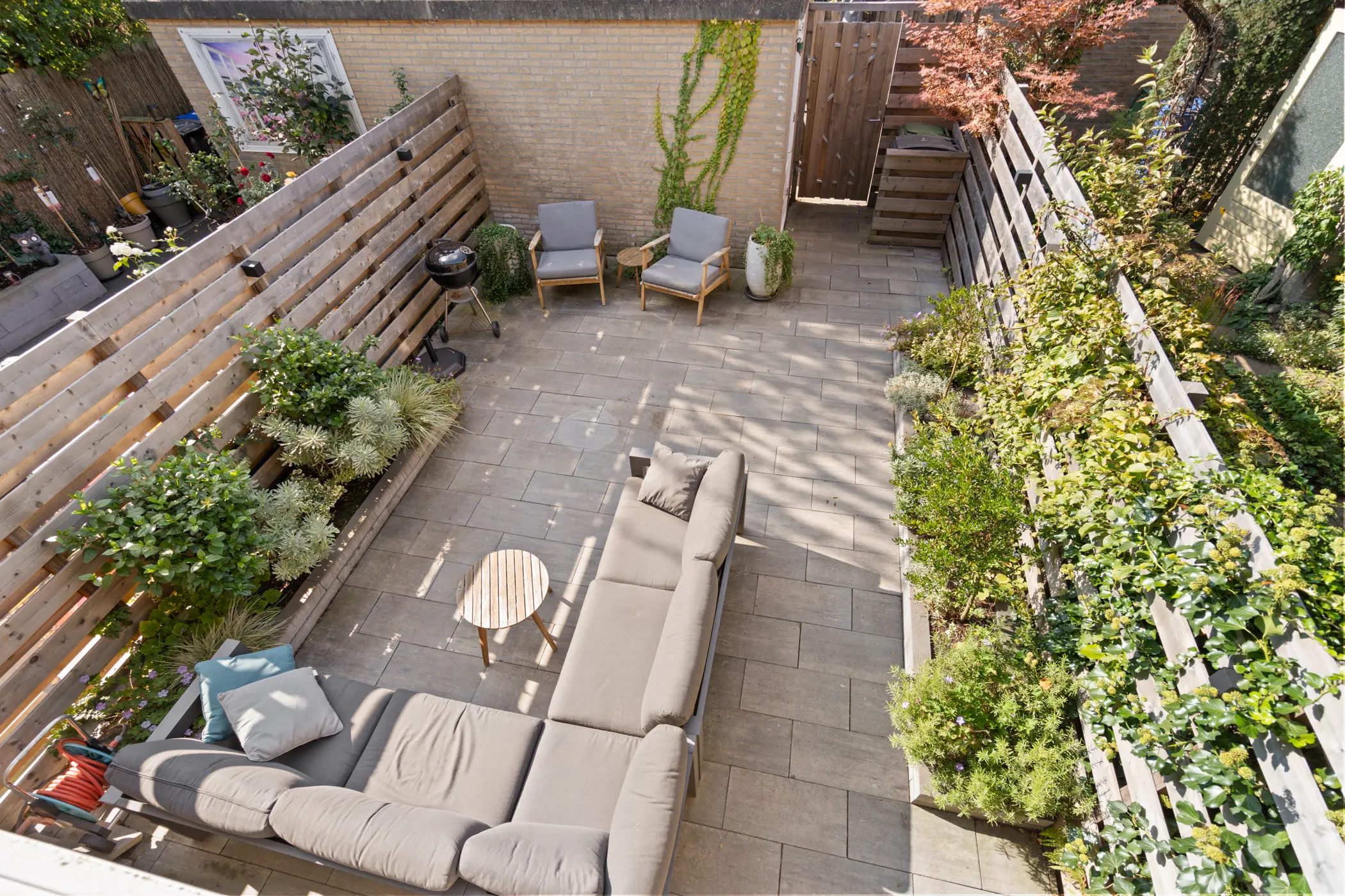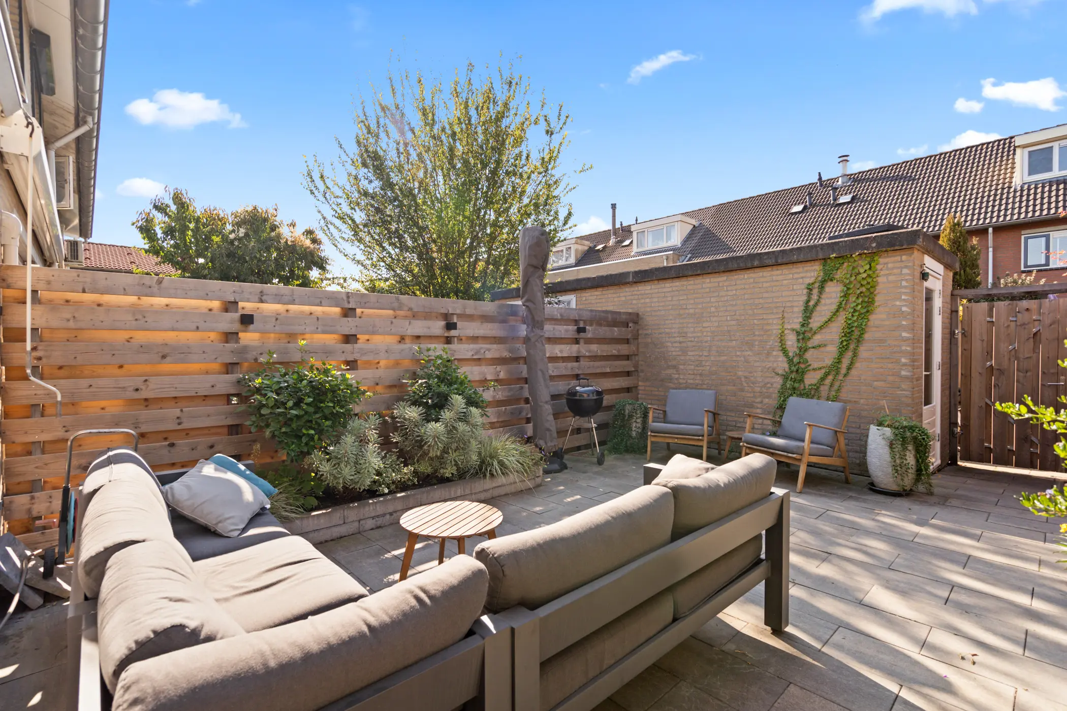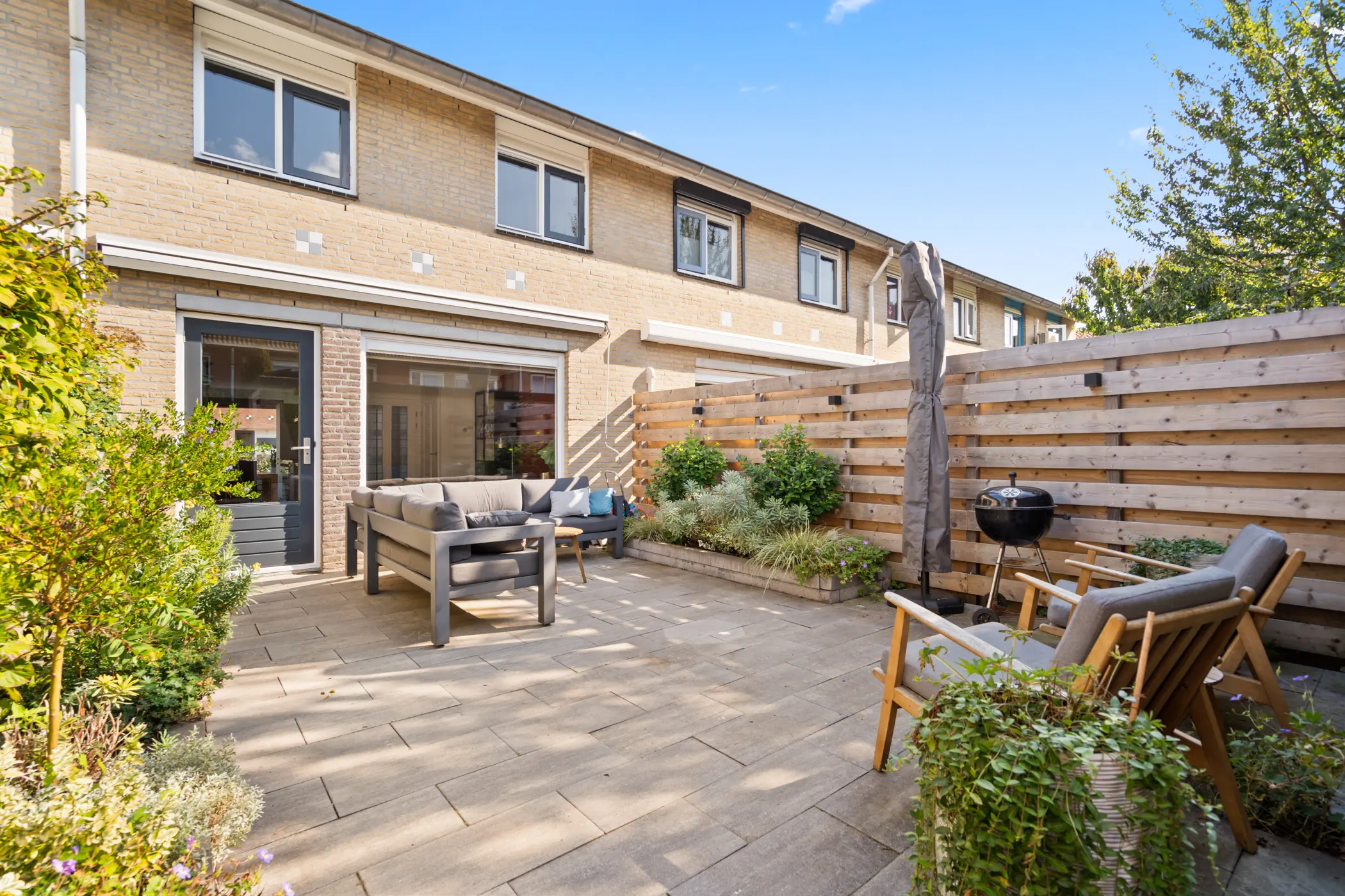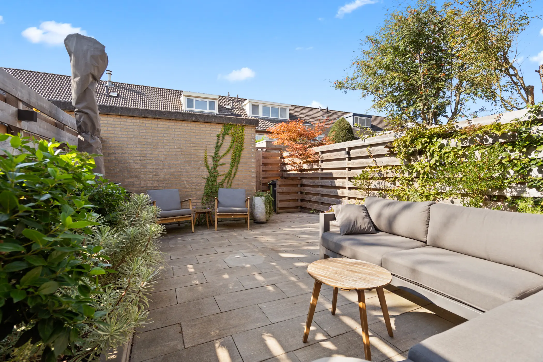 Via de loopdeur stap je zo de achtertuin in. Deze is gelegen op het zuidwesten en daarmee ideaal om tot in de avond van de zon te genieten. De tuin is voorzien van een achterom en een vrijstaande stenen berging met elektra.