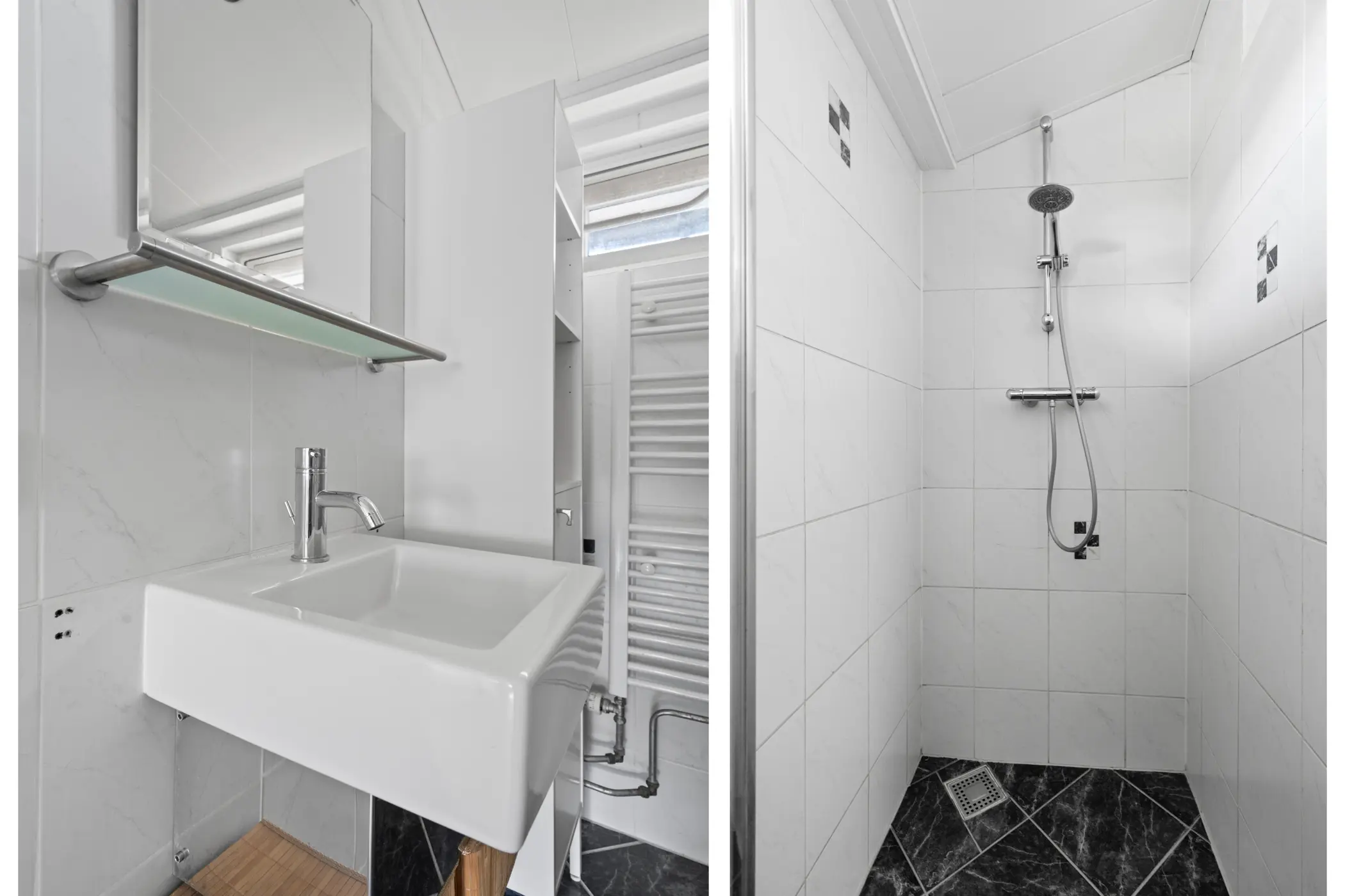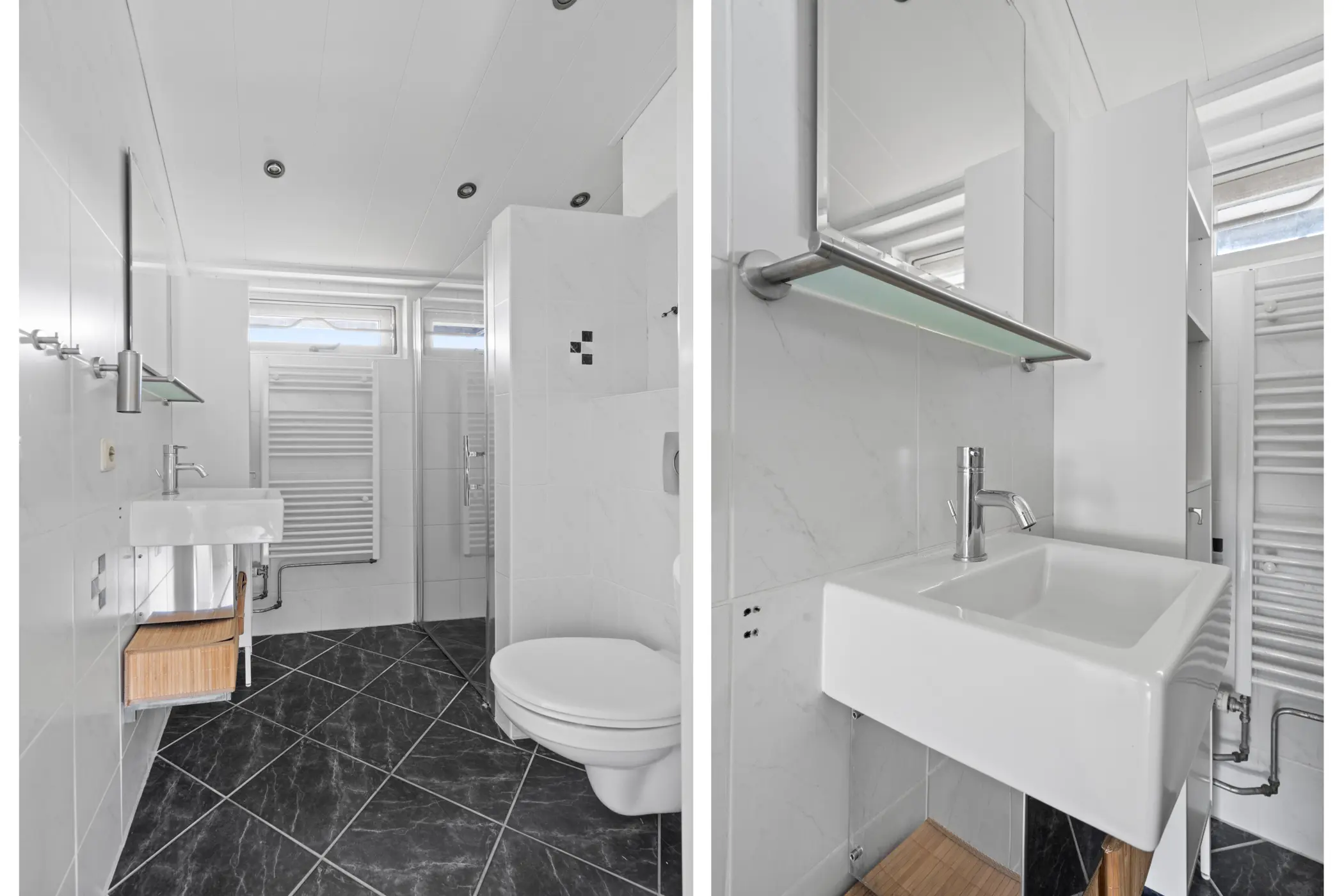 De badkamer is modern uitgevoerd en voorzien van een inloopdouche, wastafel, tweede toilet (wandcloset) en een designradiator.