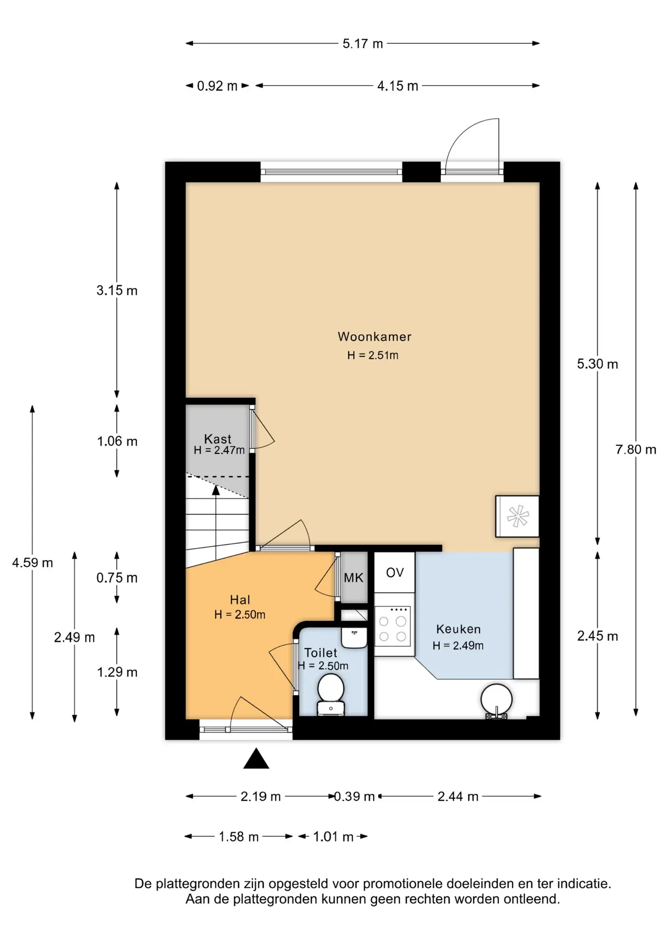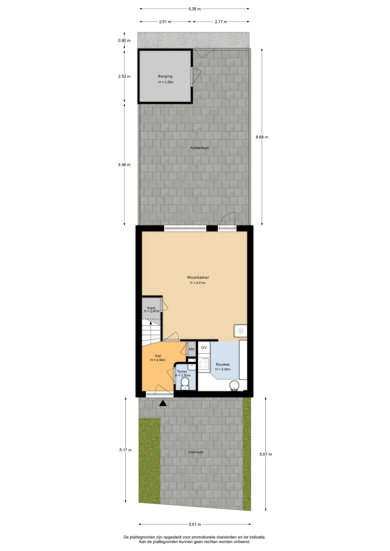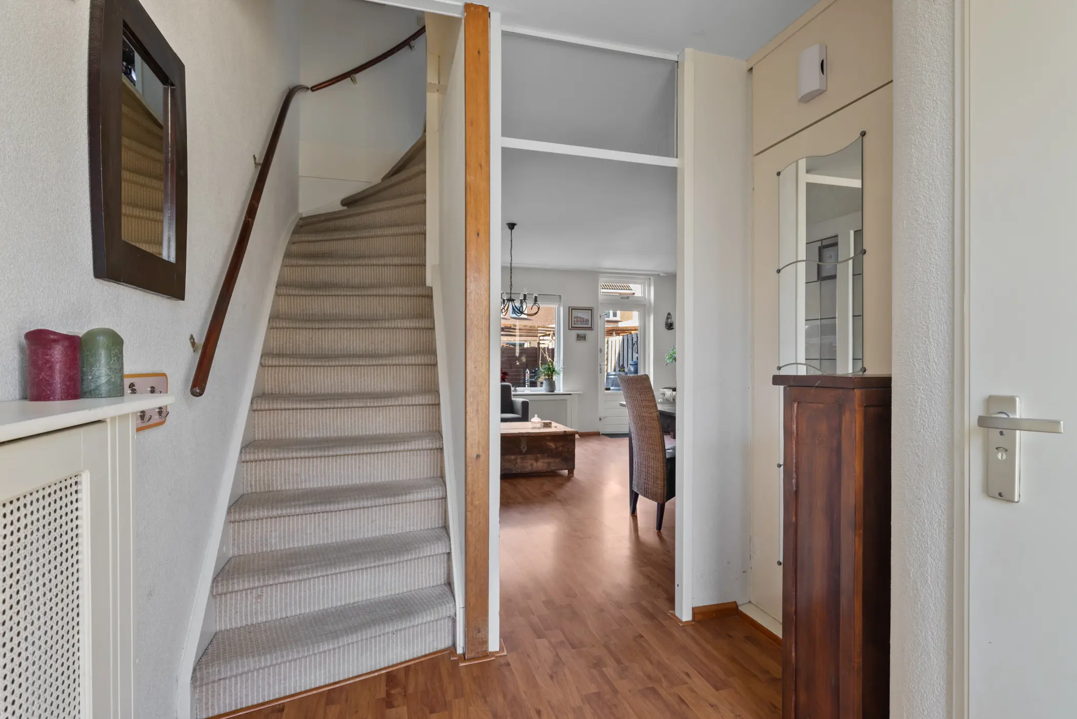 U komt binnen in de hal met meterkast, toilet met fonteintje en trapopgang. Vanuit de hal heeft u toegang tot de lichte woonkamer, voorzien van een praktische trapkast en een loopdeur naar de achtertuin. De begane grond is volledig voorzien van laminaat.