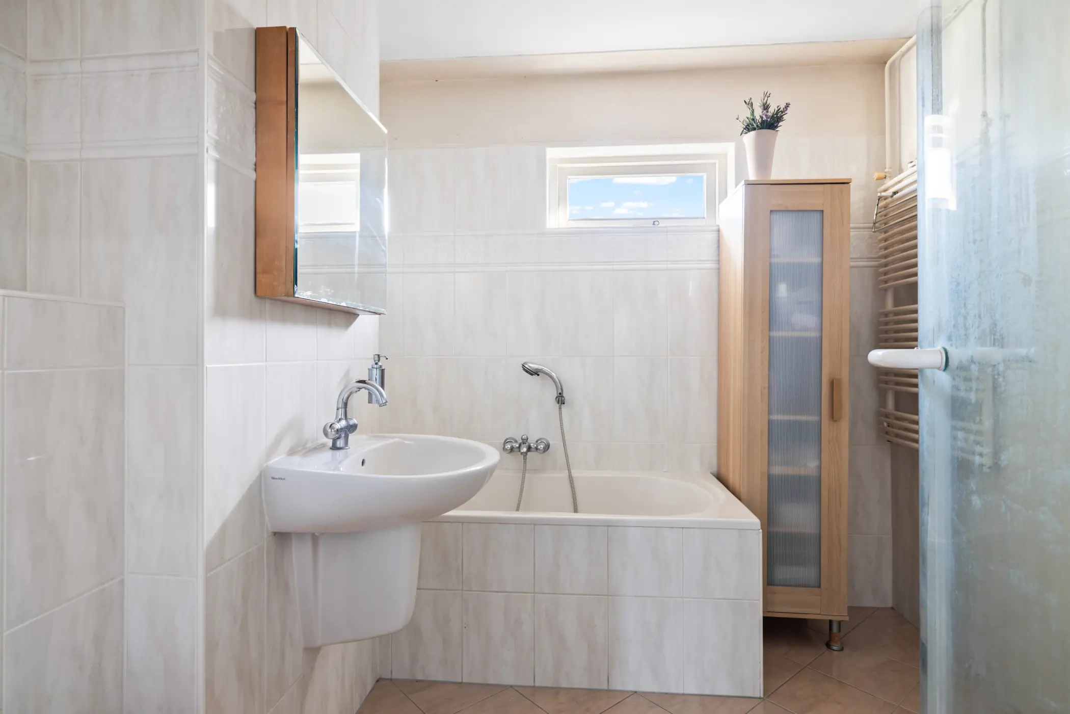 De badkamer beschikt over een ligbad, douchehoek, wastafel en toilet.