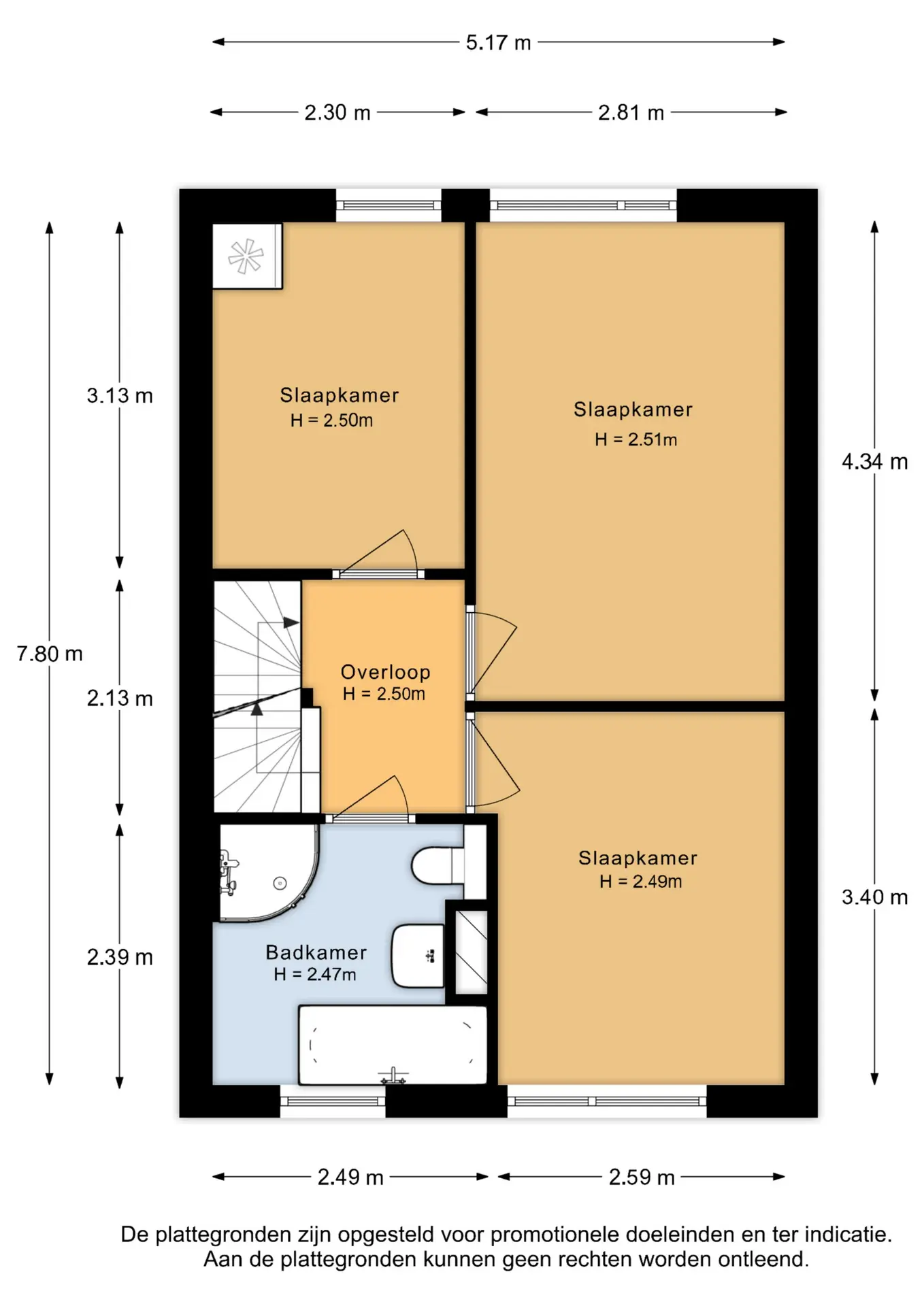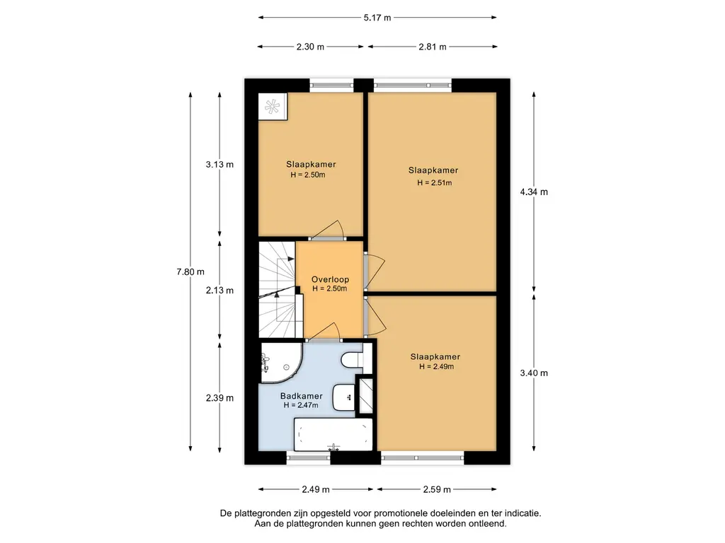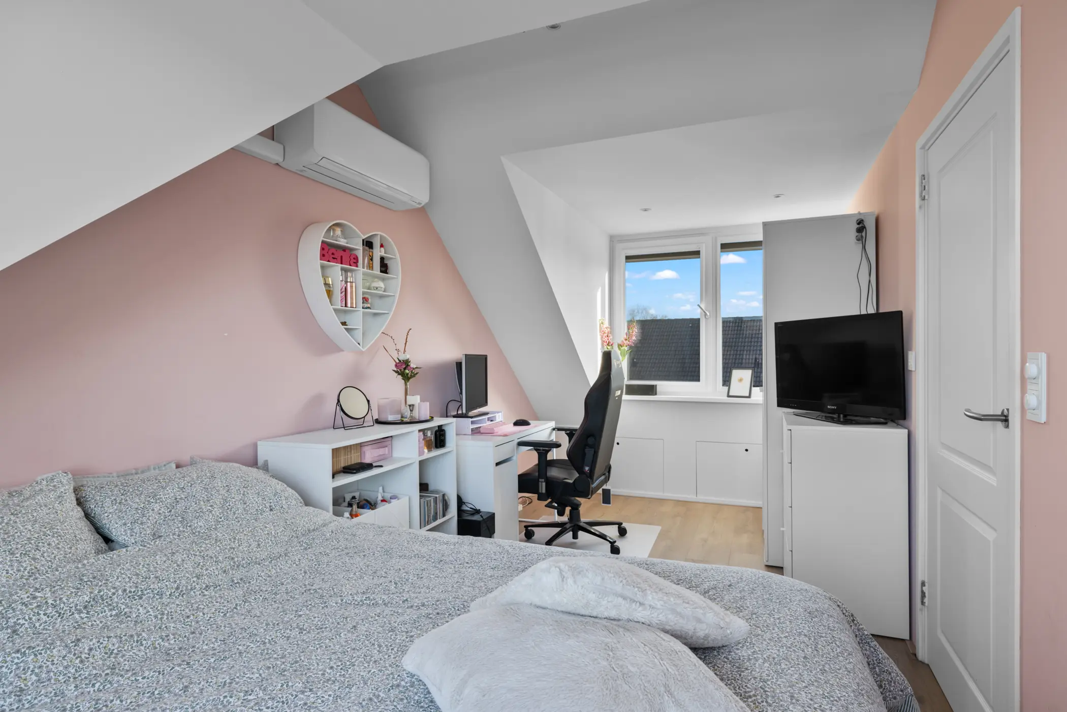 De overloop biedt toegang tot drie slaapkamers en de badkamer. Eén van de slaapkamers aan de achterzijde is voorzien van airconditioning.