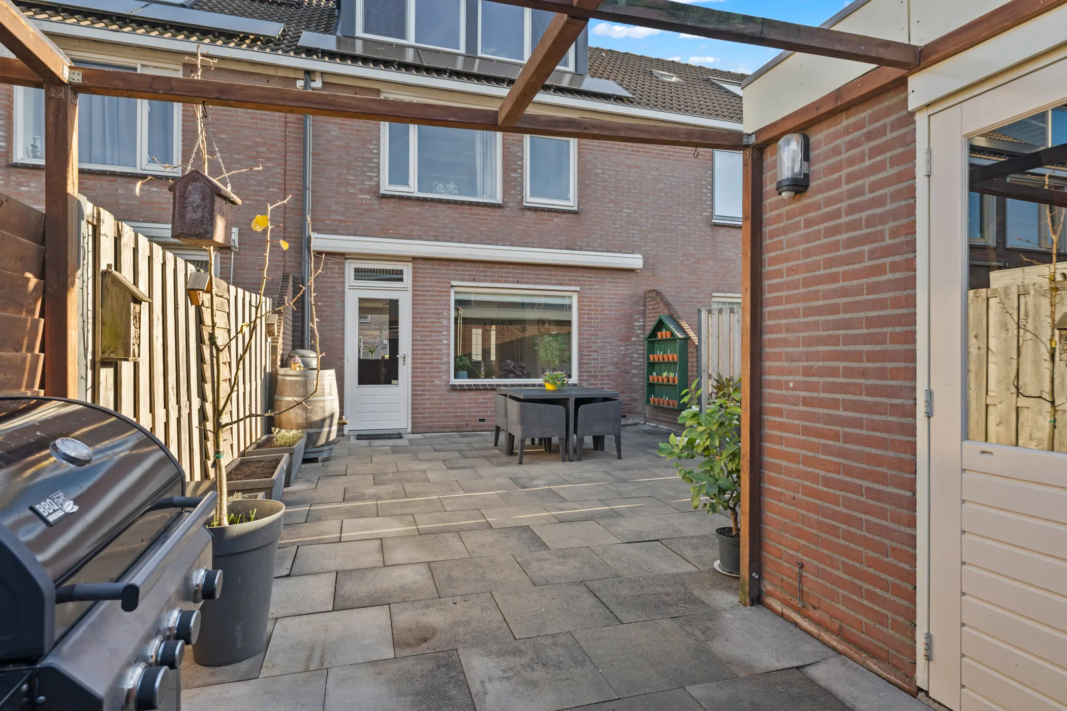 De achtertuin ligt op het westen en is onderhoudsvriendelijk aangelegd met sierbestrating. U geniet hier van privacy en veel zon in de middag en avond. Daarnaast is de tuin voorzien van een elektrisch zonnescherm, ideaal voor extra schaduw op warme dagen. De tuin beschikt verder over een vrijstaande stenen berging en is bereikbaar via de achterom.