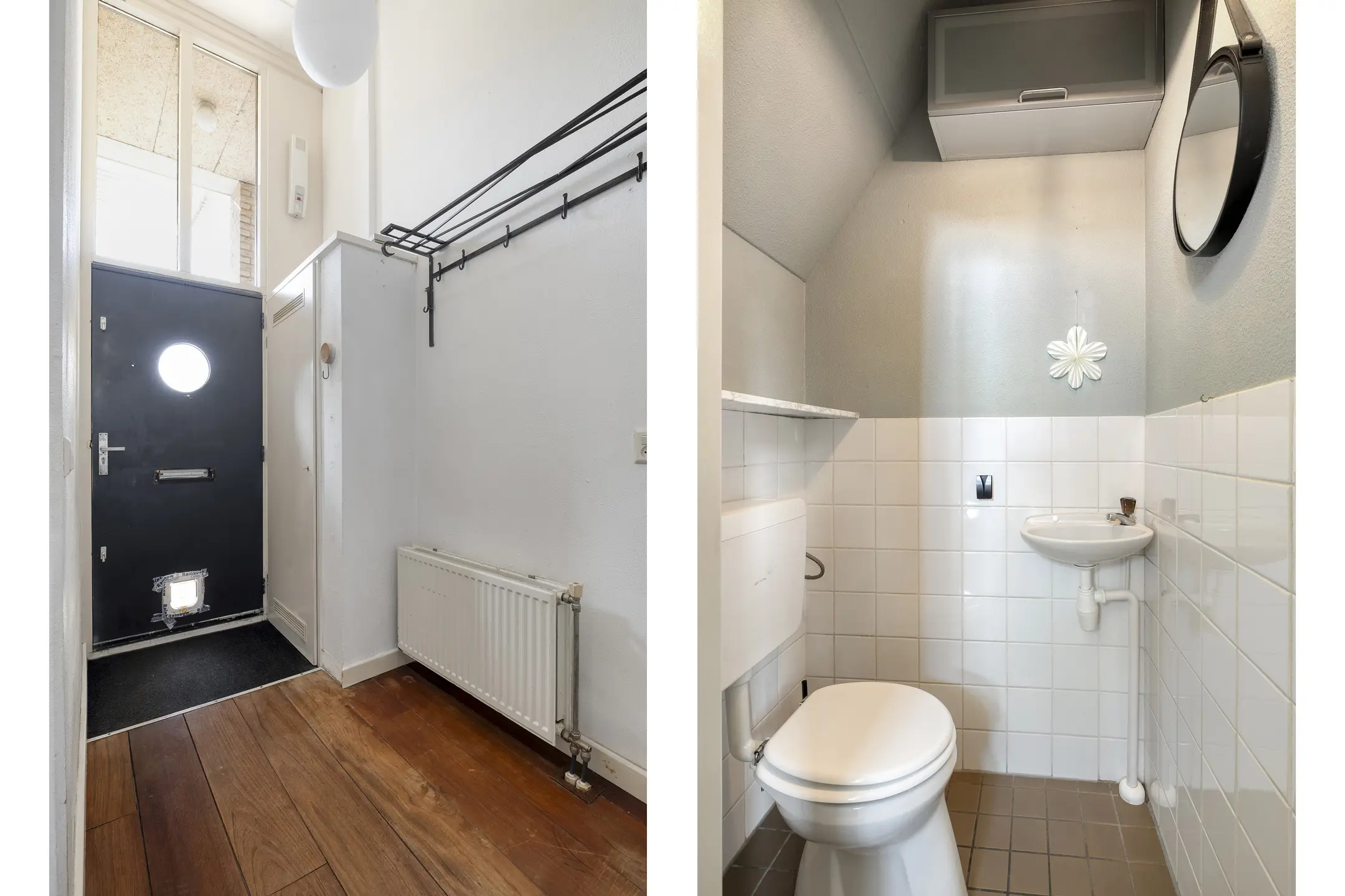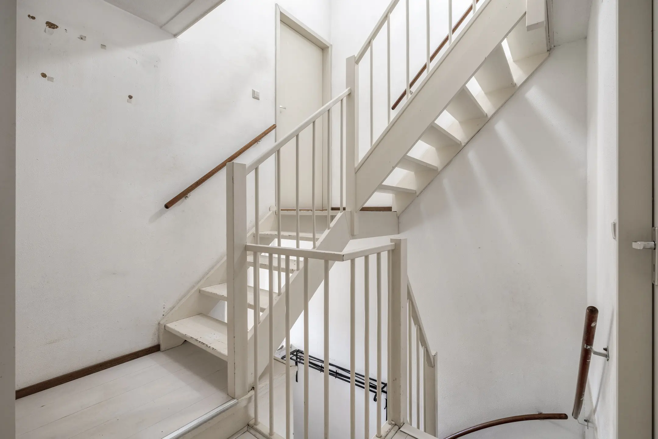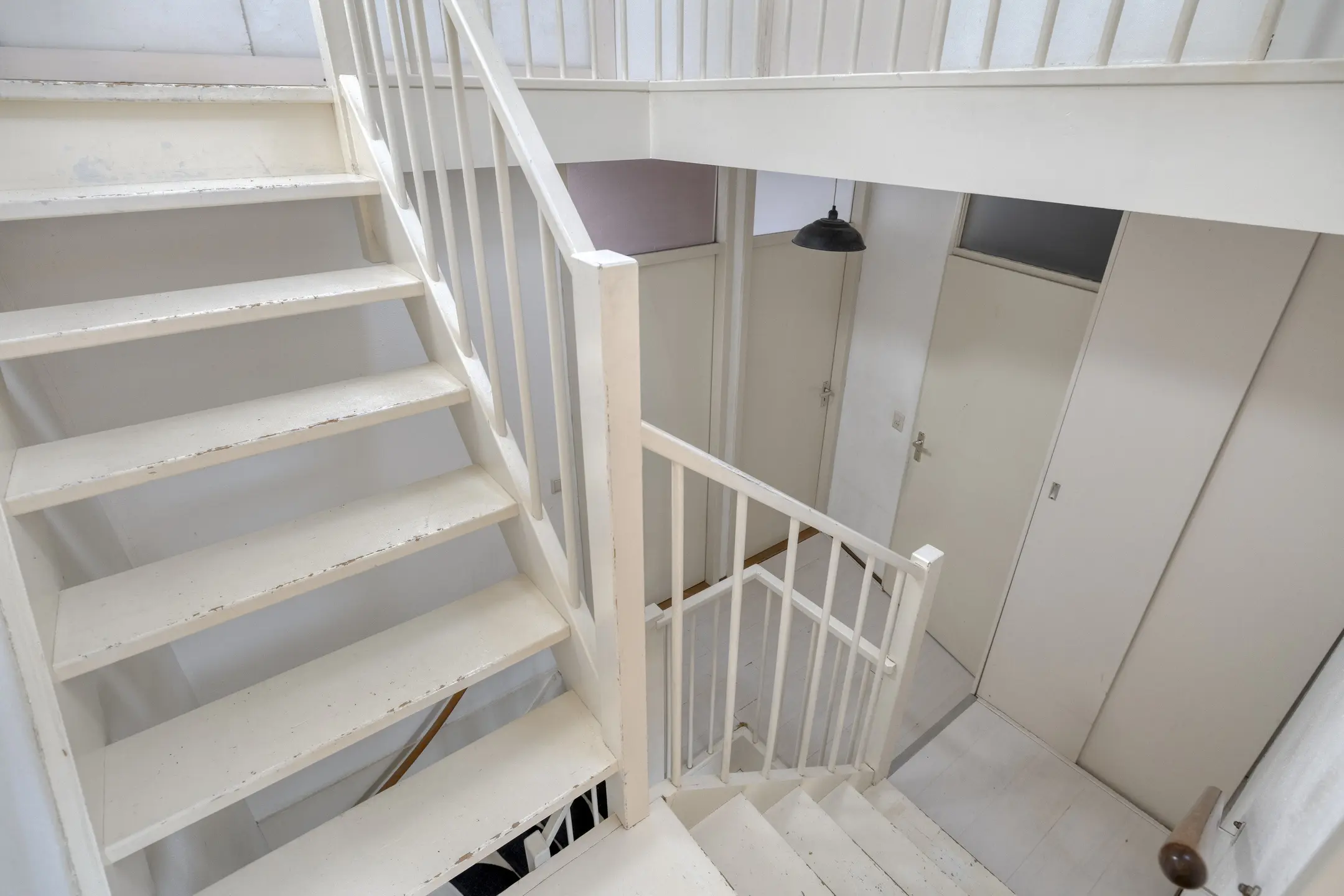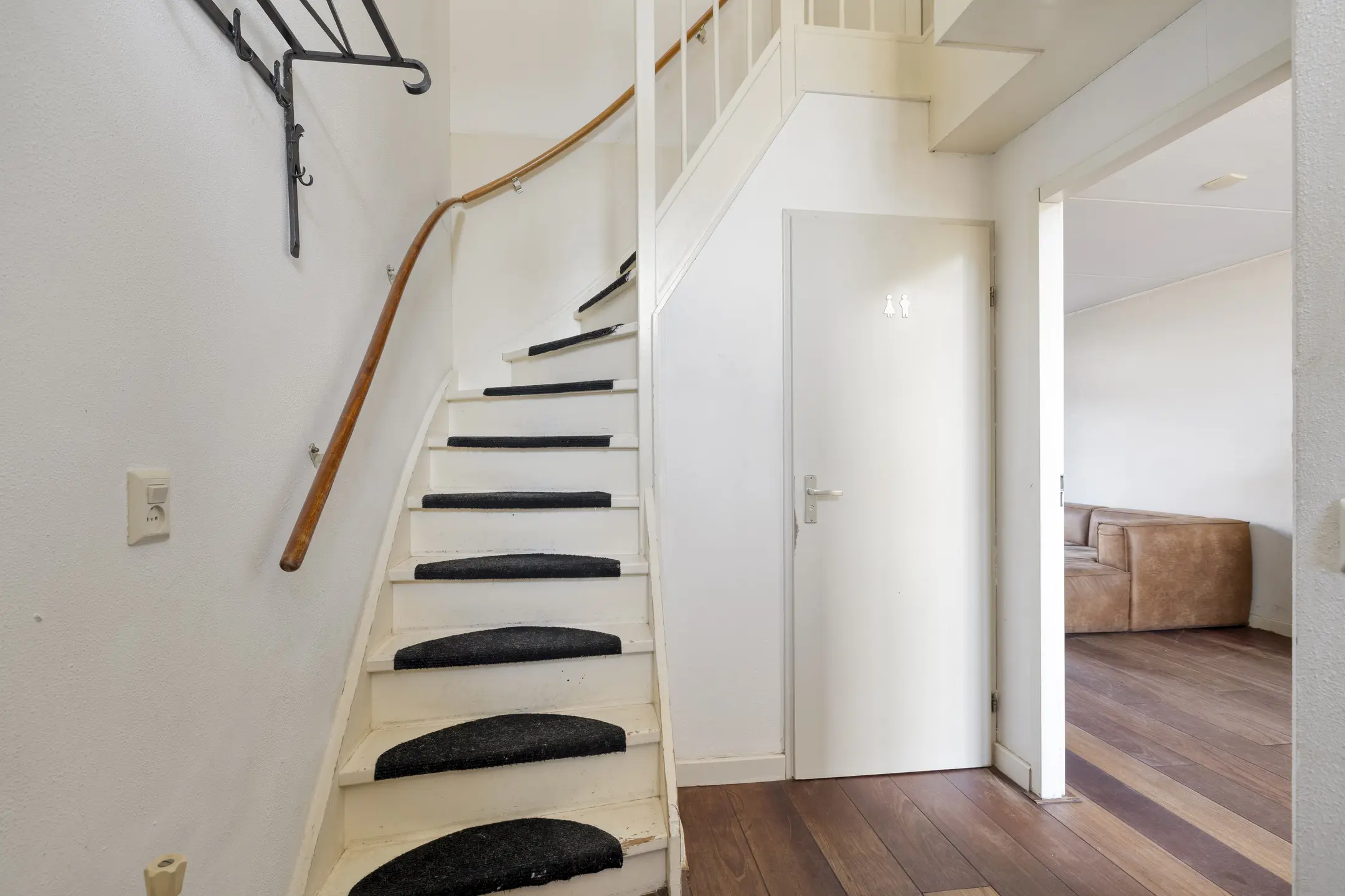 Via de entree kom je in de hal met meterkast en toiletruimte. Het karakteristieke, hoge trappenhuis vormt het hart van de woning en geeft toegang tot de verschillende woonniveaus. Vanuit de hal bereik je de royale, tuingerichte woonkamer met houten vloer, een praktische trapkast en een schuifpui naar de achtertuin.