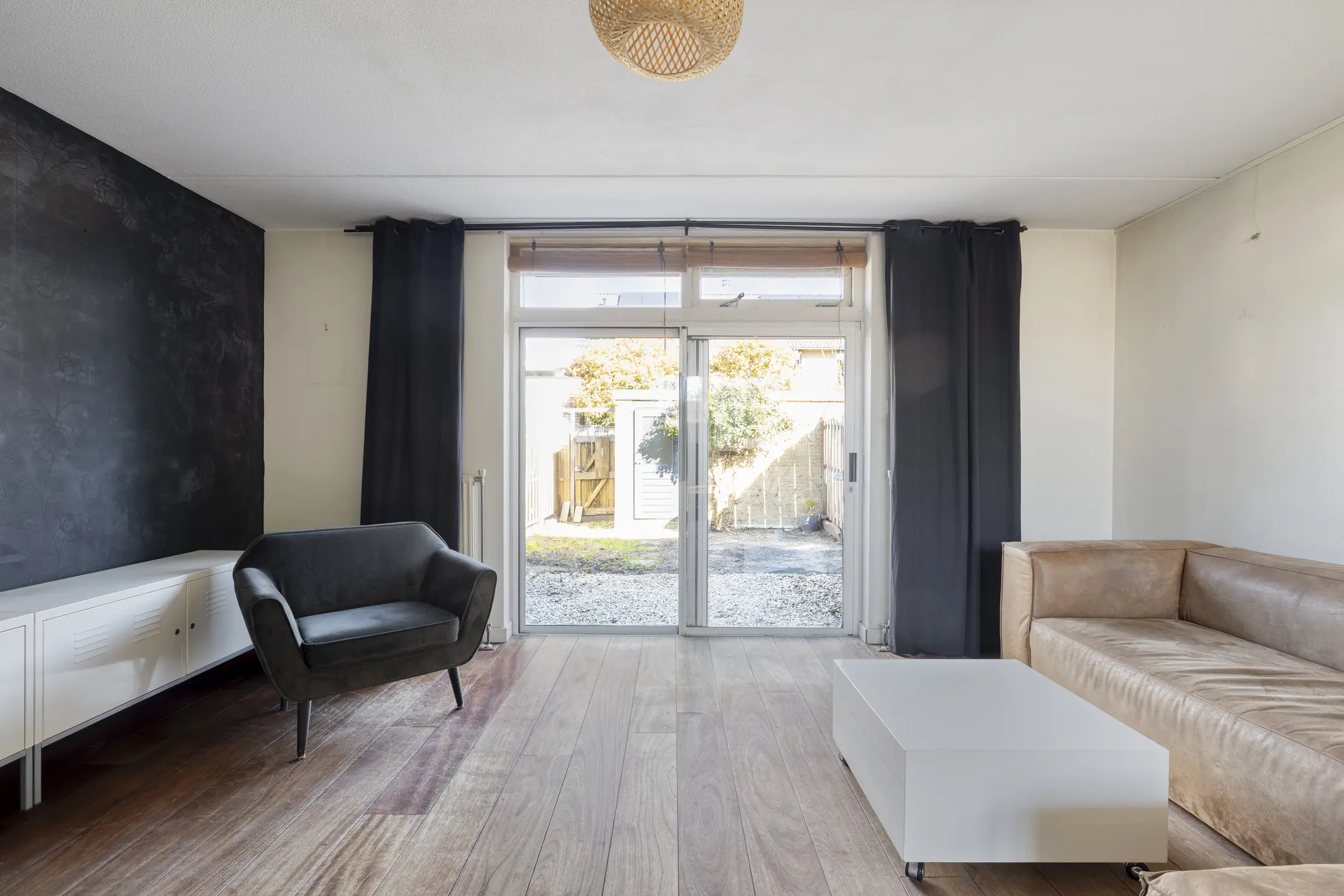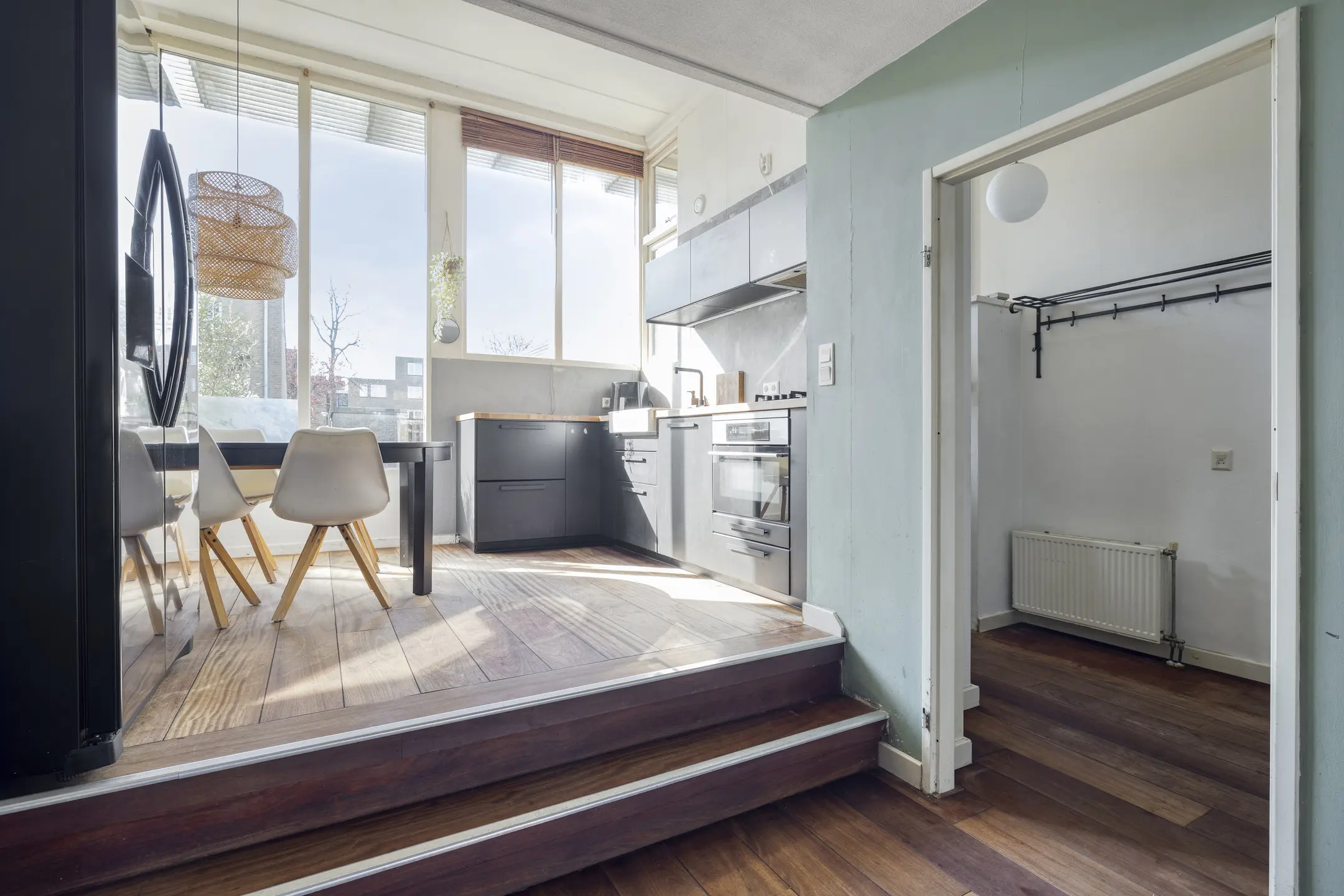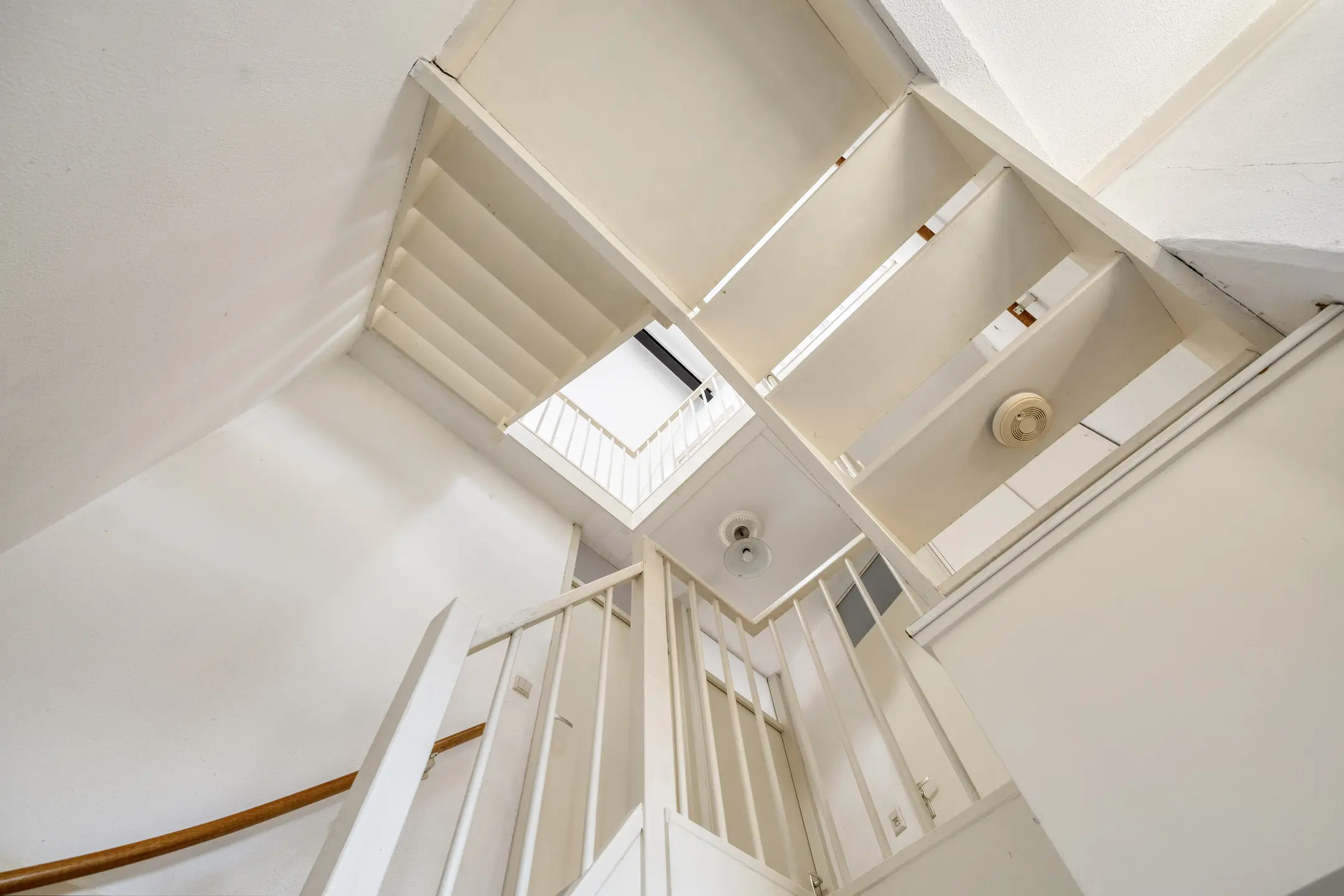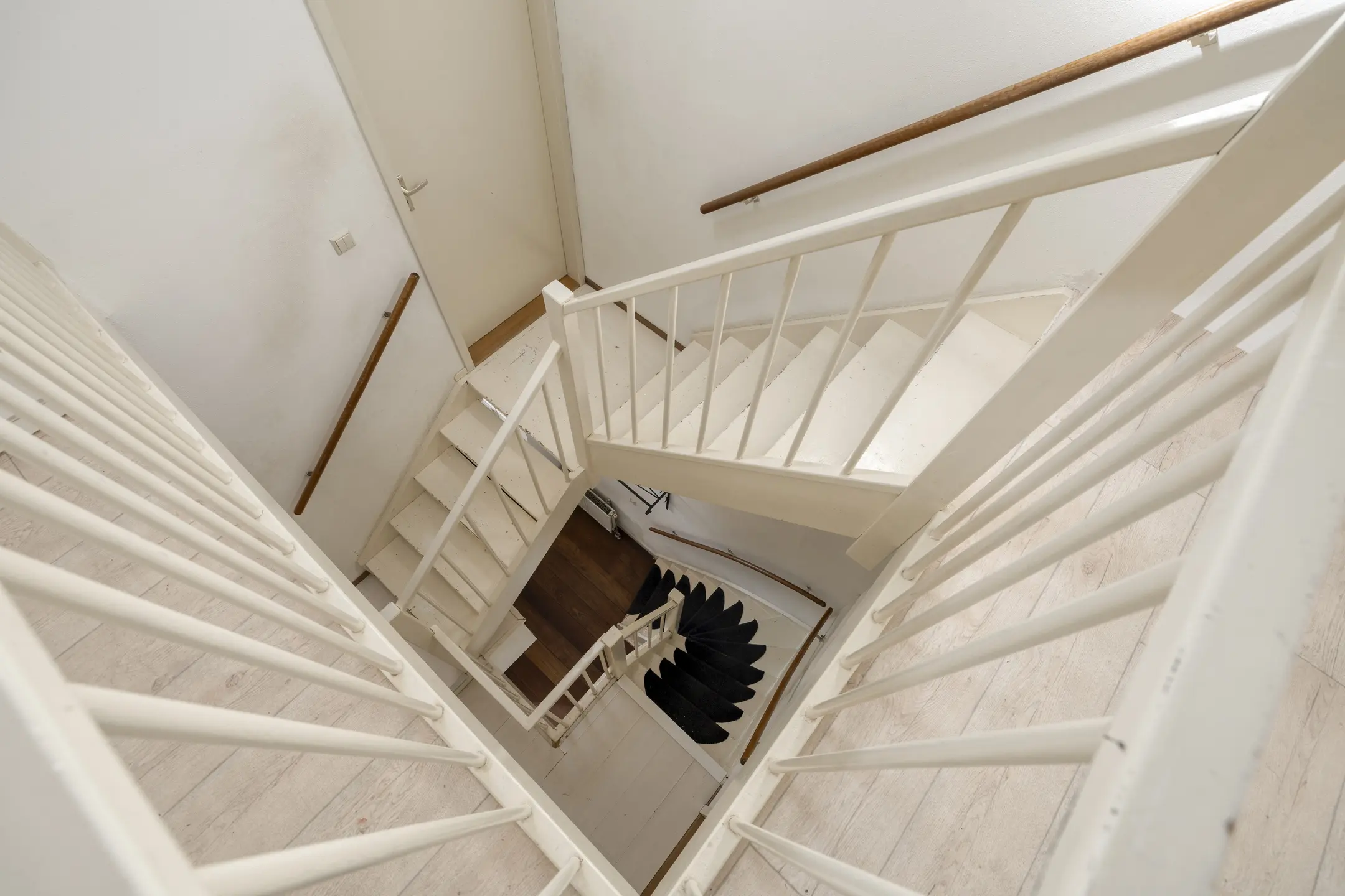 Via de entree kom je in de hal met meterkast en toiletruimte. Het karakteristieke, hoge trappenhuis vormt het hart van de woning en geeft toegang tot de verschillende woonniveaus. Vanuit de hal bereik je de royale, tuingerichte woonkamer met houten vloer, een praktische trapkast en een schuifpui naar de achtertuin.