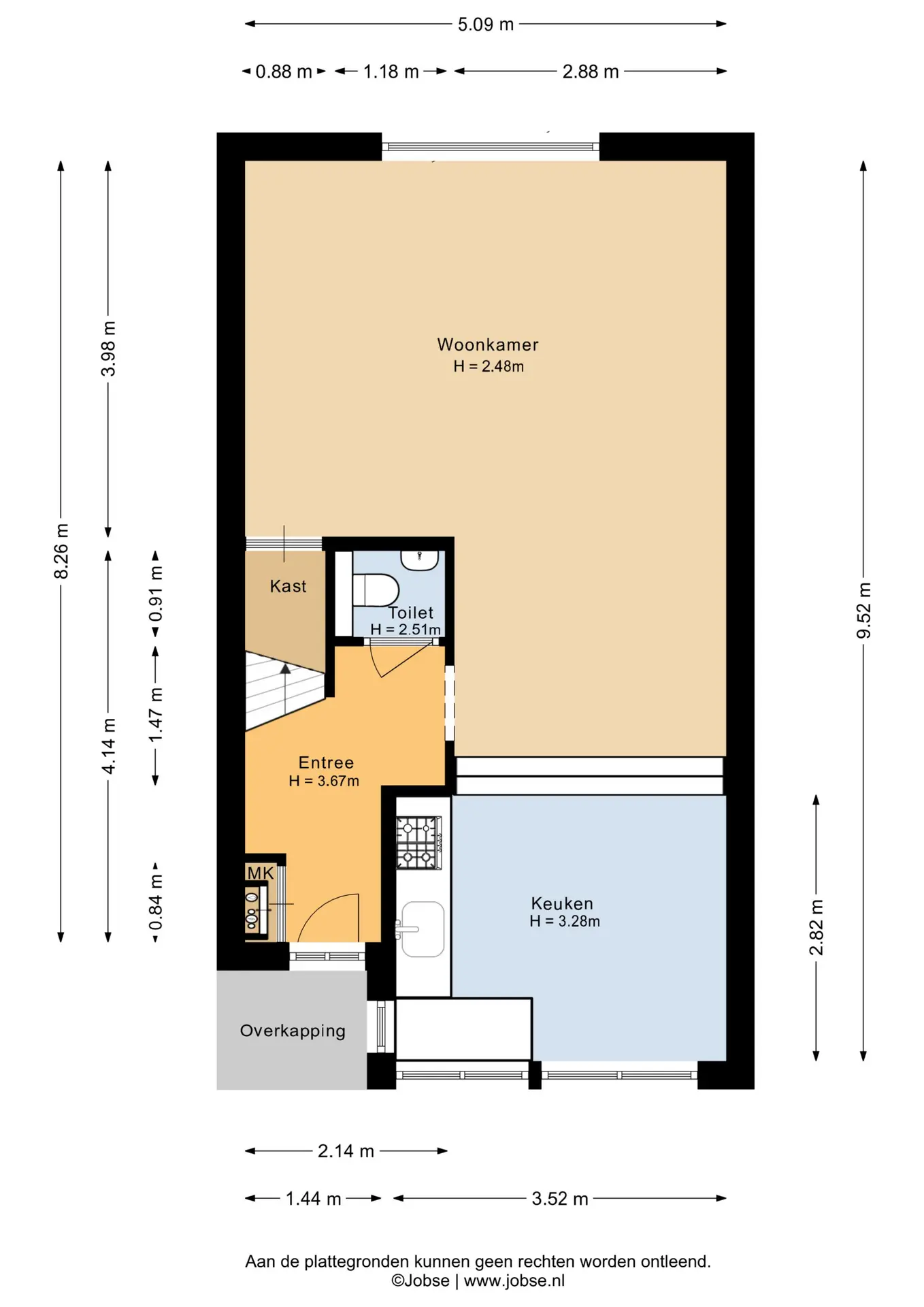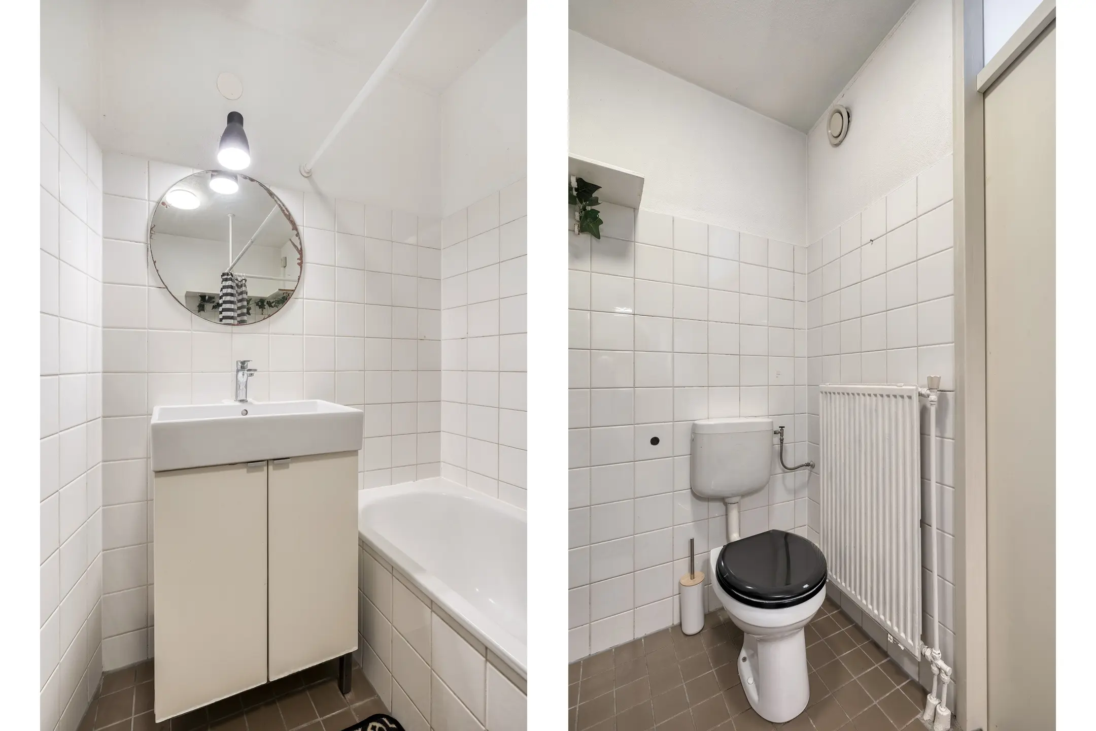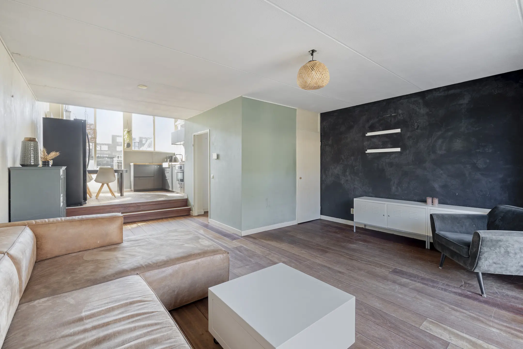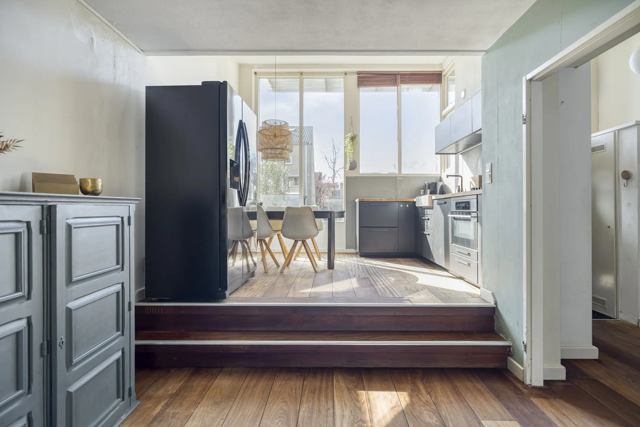 Via de entree kom je in de hal met meterkast en toiletruimte. Het karakteristieke, hoge trappenhuis vormt het hart van de woning en geeft toegang tot de verschillende woonniveaus. Vanuit de hal bereik je de royale, tuingerichte woonkamer met houten vloer, een praktische trapkast en een schuifpui naar de achtertuin.