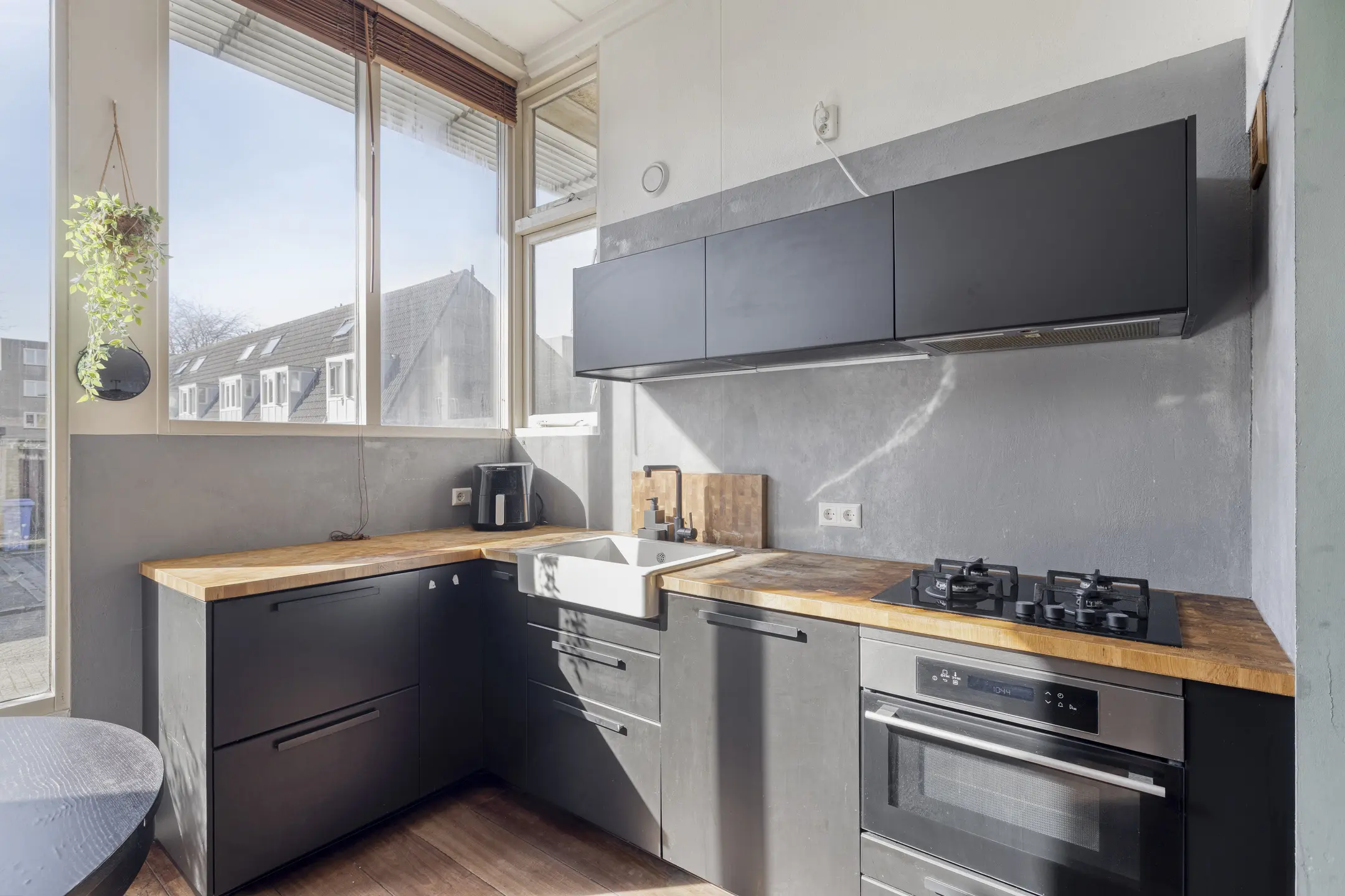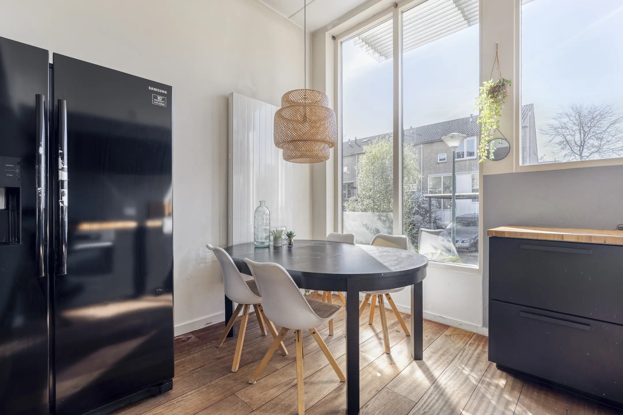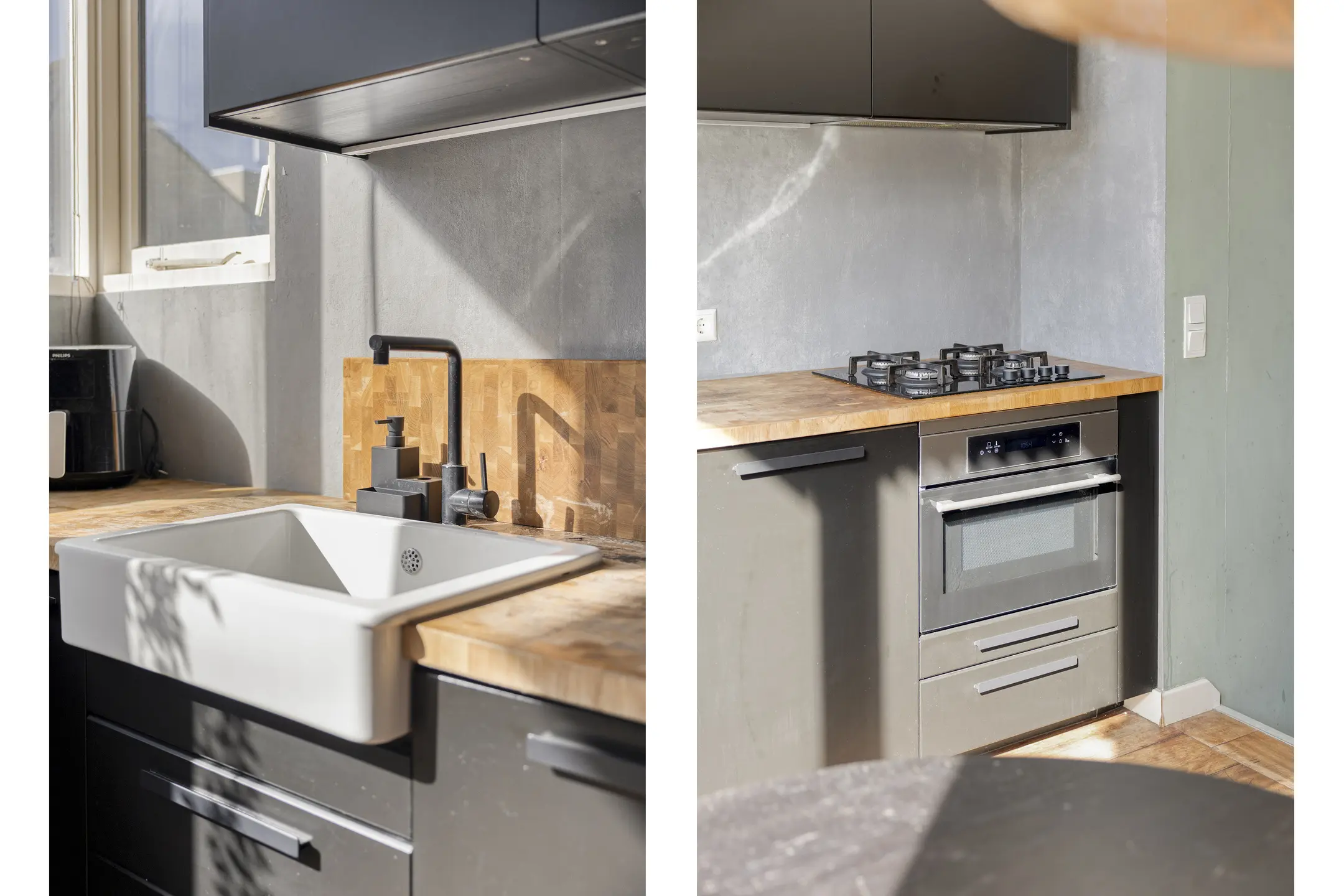 De moderne open keuken (2019) ligt op een speelse verhoging en is van alle gemakken voorzien, waaronder een 4-pits gaskookplaat, combi-oven, vaatwasser en afzuigsysteem. De woonkamer is slim ingedeeld met een eetgedeelte aan de voorzijde en een sfeervol zitgedeelte aan de tuinzijde.