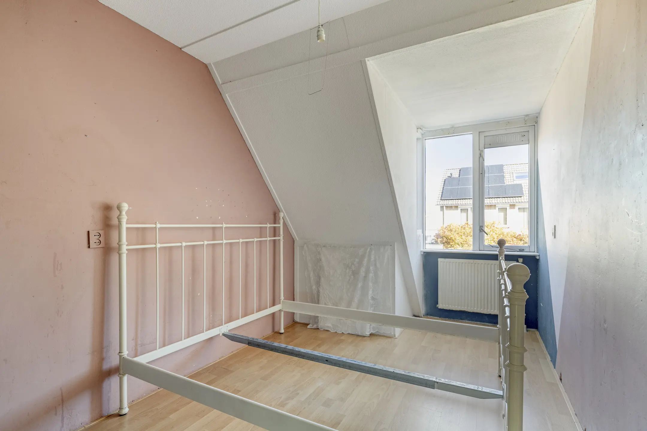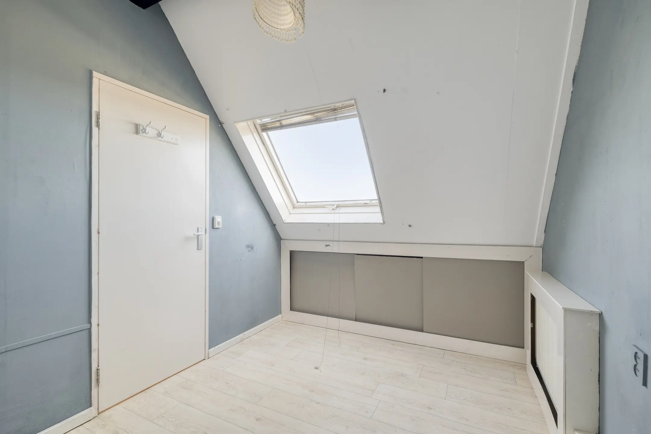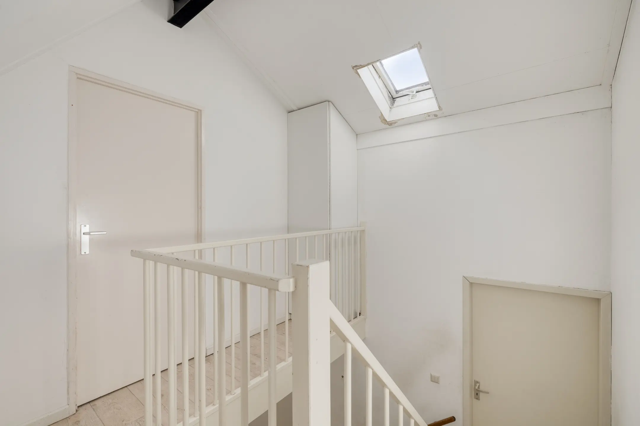 Overloop met opstelplaats voor de cv-installatie en een wasmachineaansluiting. Vanaf hier bereik je de vierde slaapkamer, voorzien van een laminaatvloer, dakraam en praktische bergruimte achter de knieschotten.