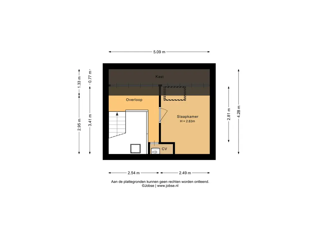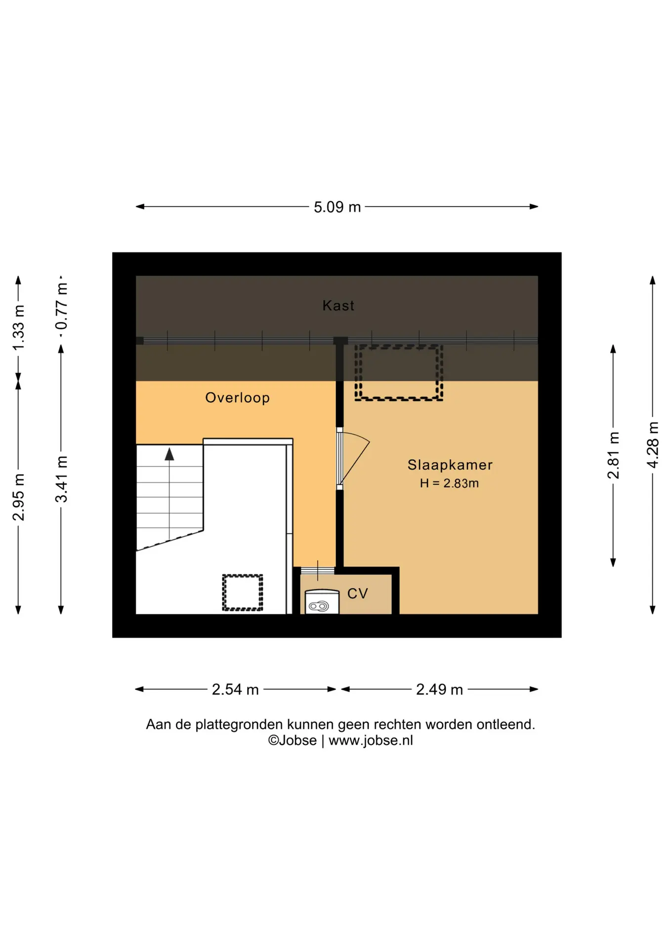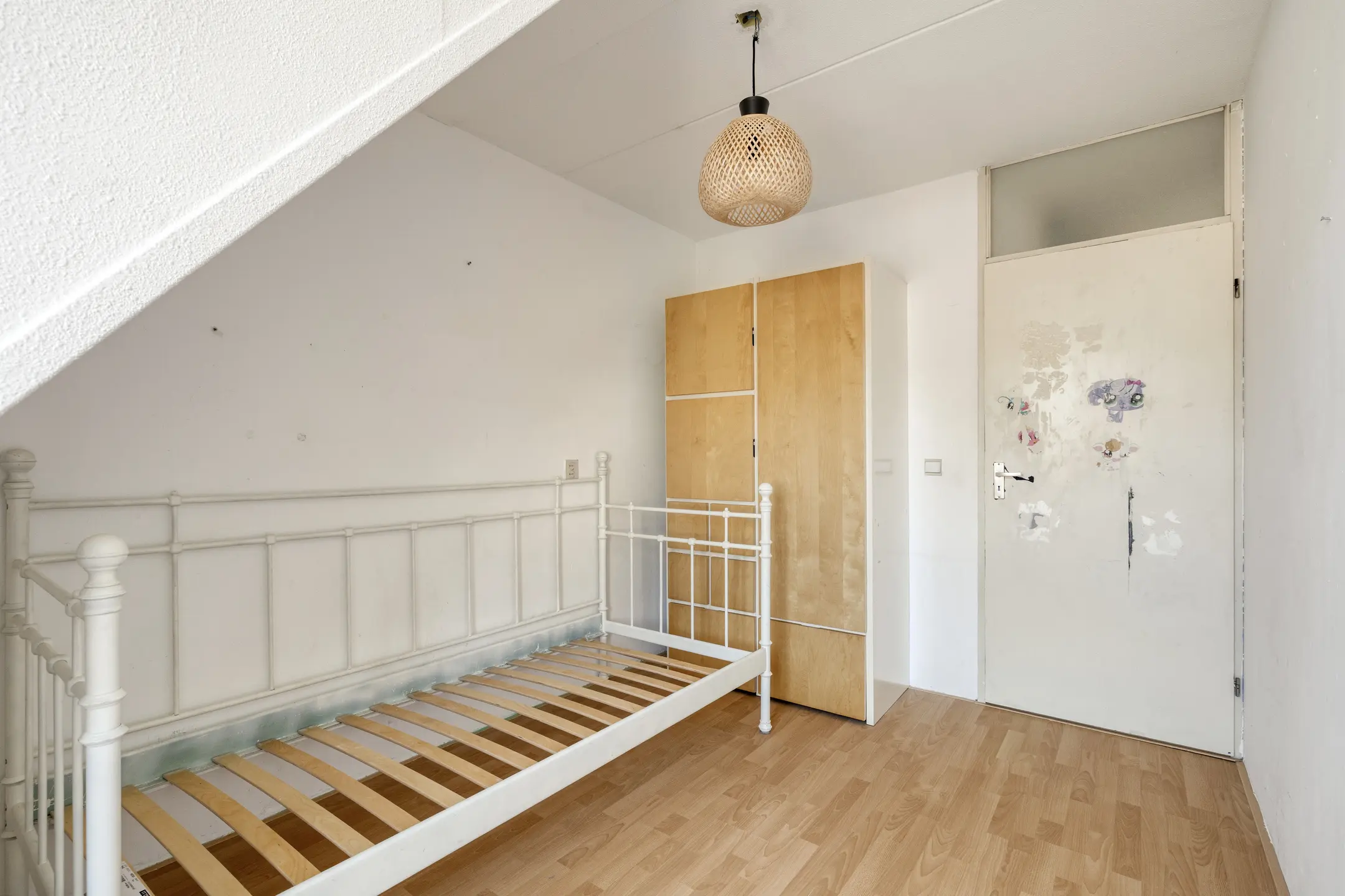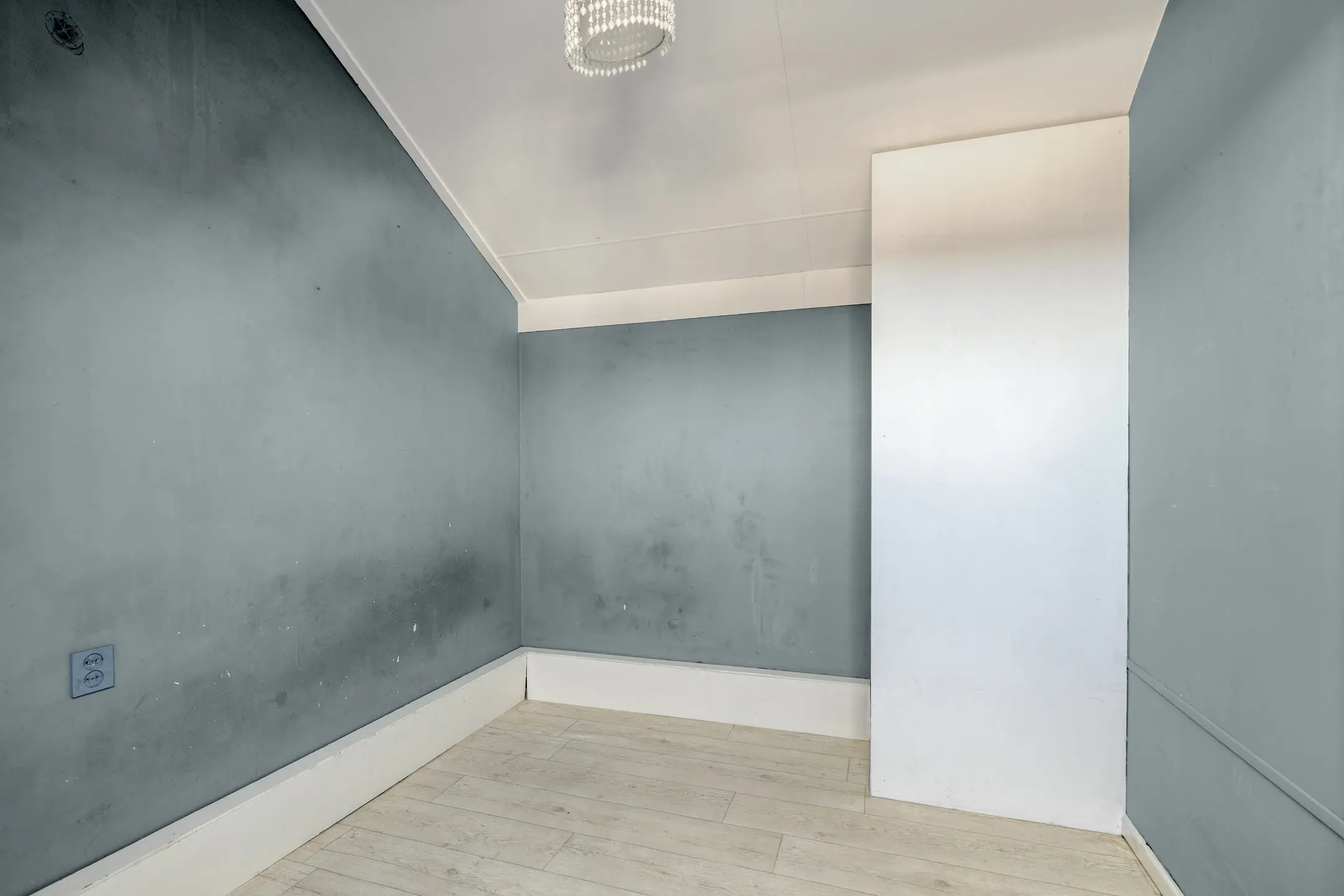 Overloop met opstelplaats voor de cv-installatie en een wasmachineaansluiting. Vanaf hier bereik je de vierde slaapkamer, voorzien van een laminaatvloer, dakraam en praktische bergruimte achter de knieschotten.