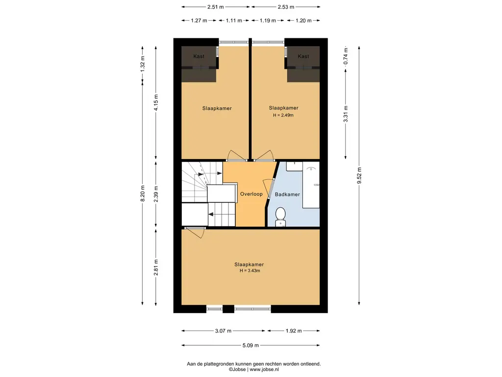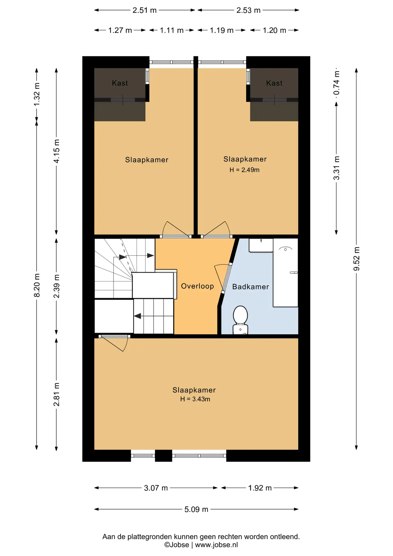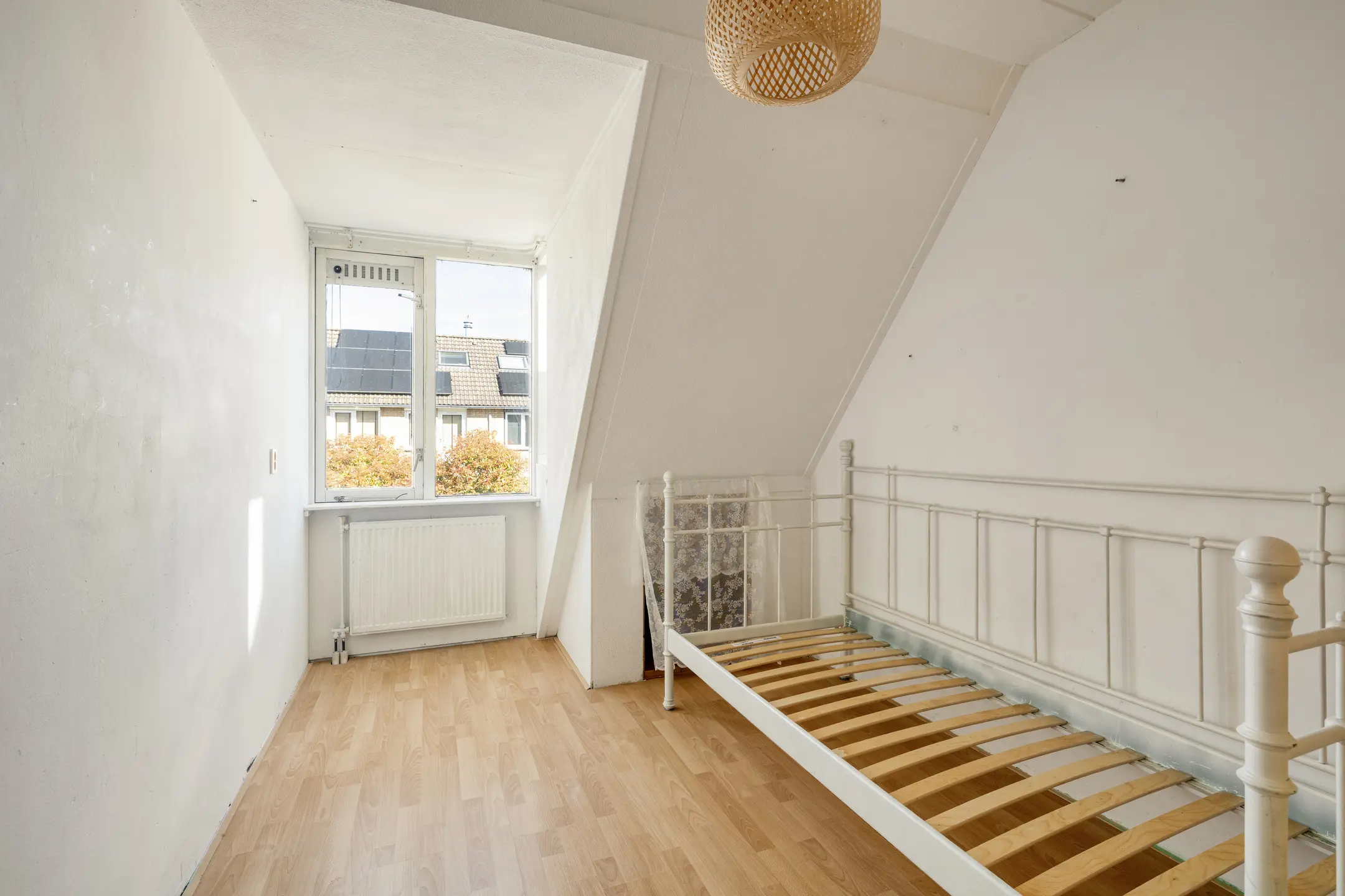 Overloop met vaste kast en toegang tot drie slaapkamers, allen voorzien van een laminaatvloer. De slaapkamers aan de achterzijde zijn extra ruim en licht dankzij de dakkapel. De badkamer is uitgevoerd met een ligbad/douchecombinatie, wastafelmeubel en een tweede toilet.
