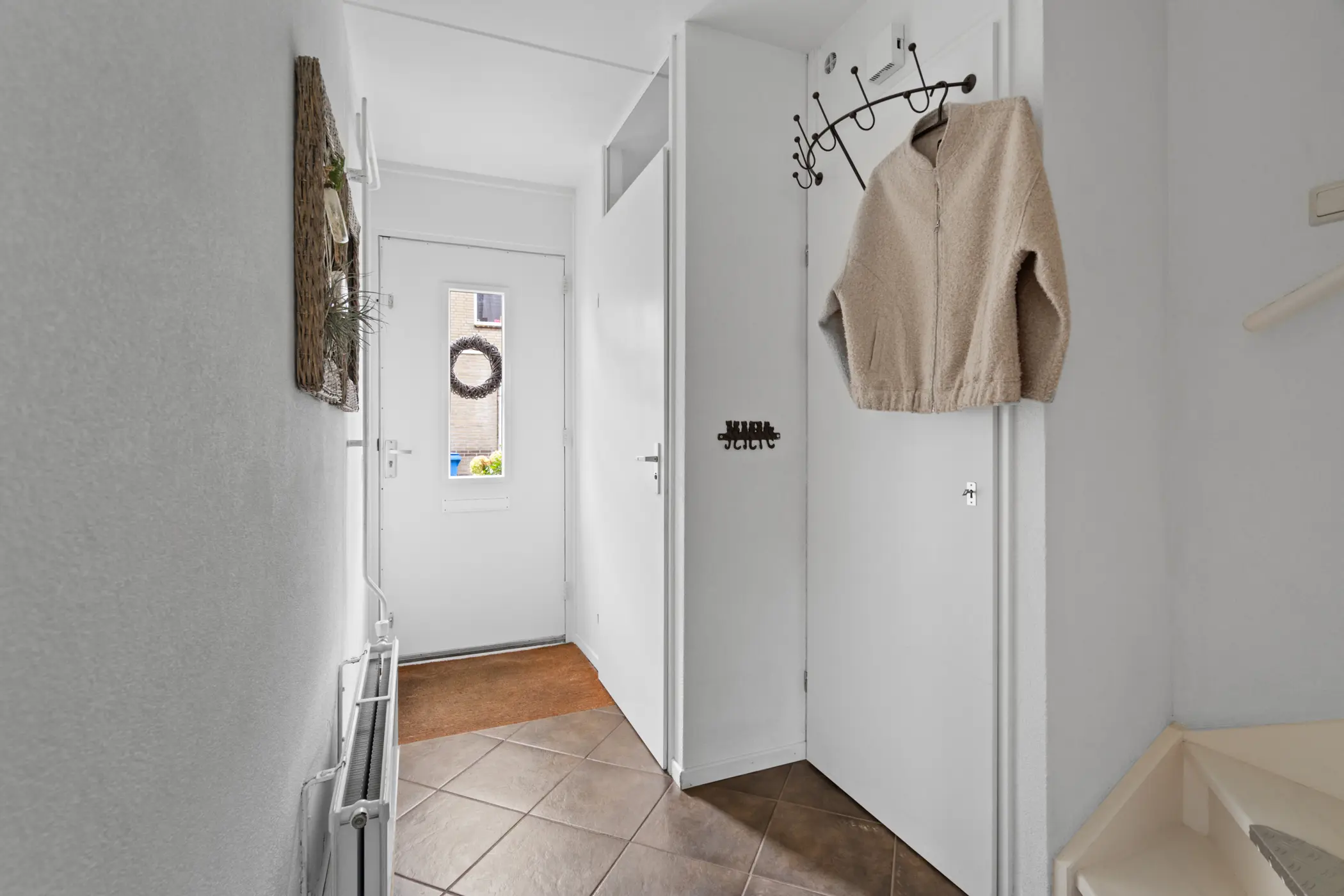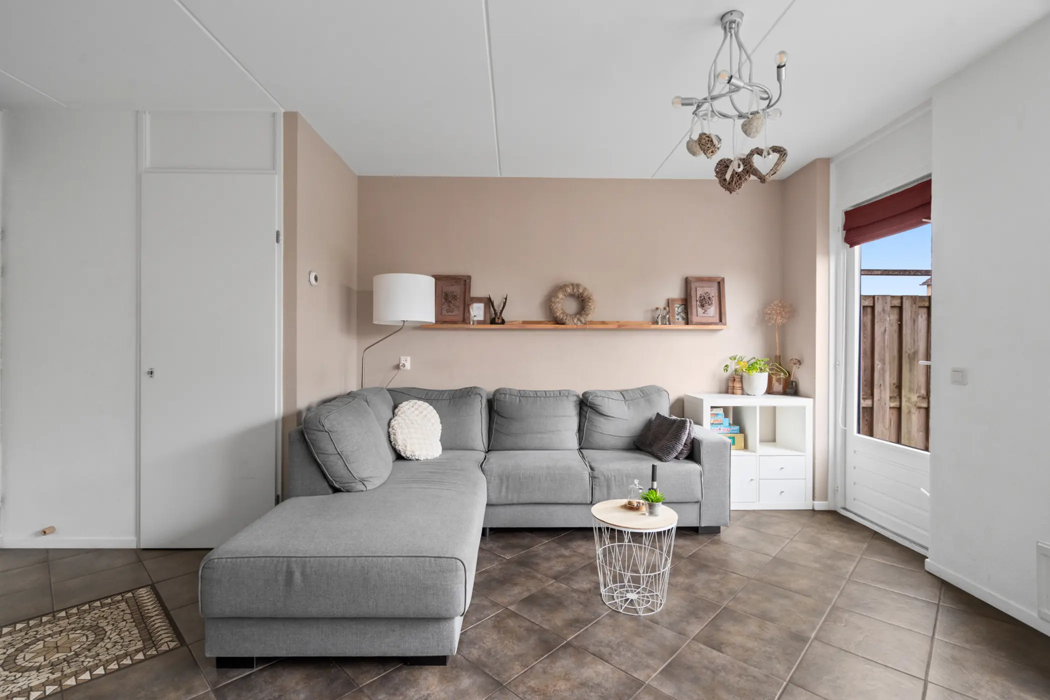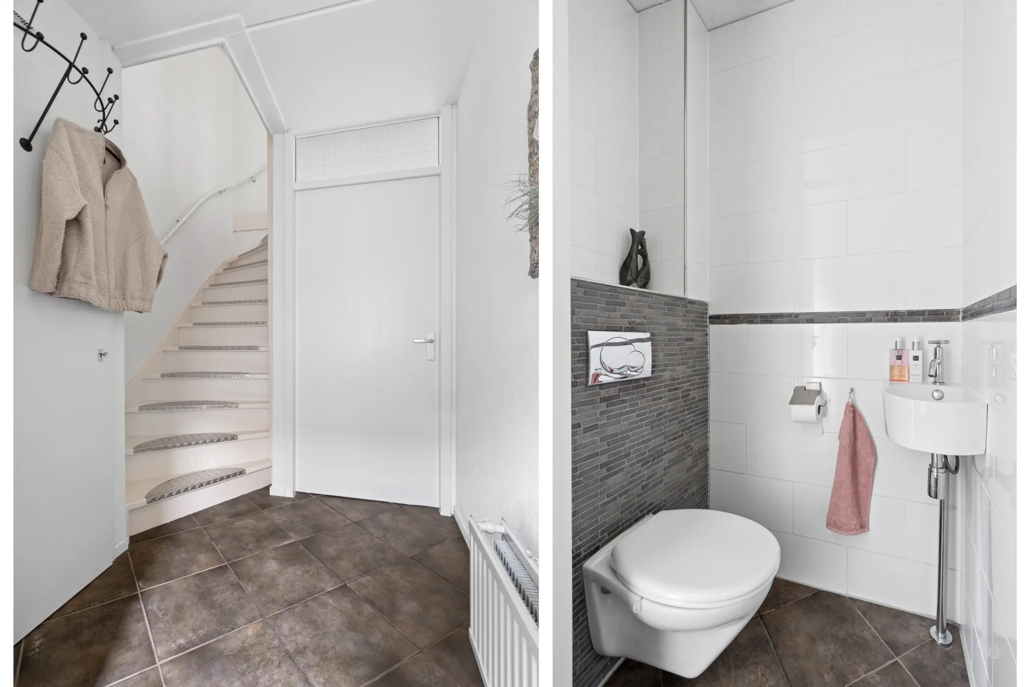 Via de voortuin met peren leibomen stap je binnen in de hal. Hier vind je de meterkast, het toilet met wandcloset en fonteintje, de trap naar boven én toegang tot de lichte en sfeervolle woonkamer.