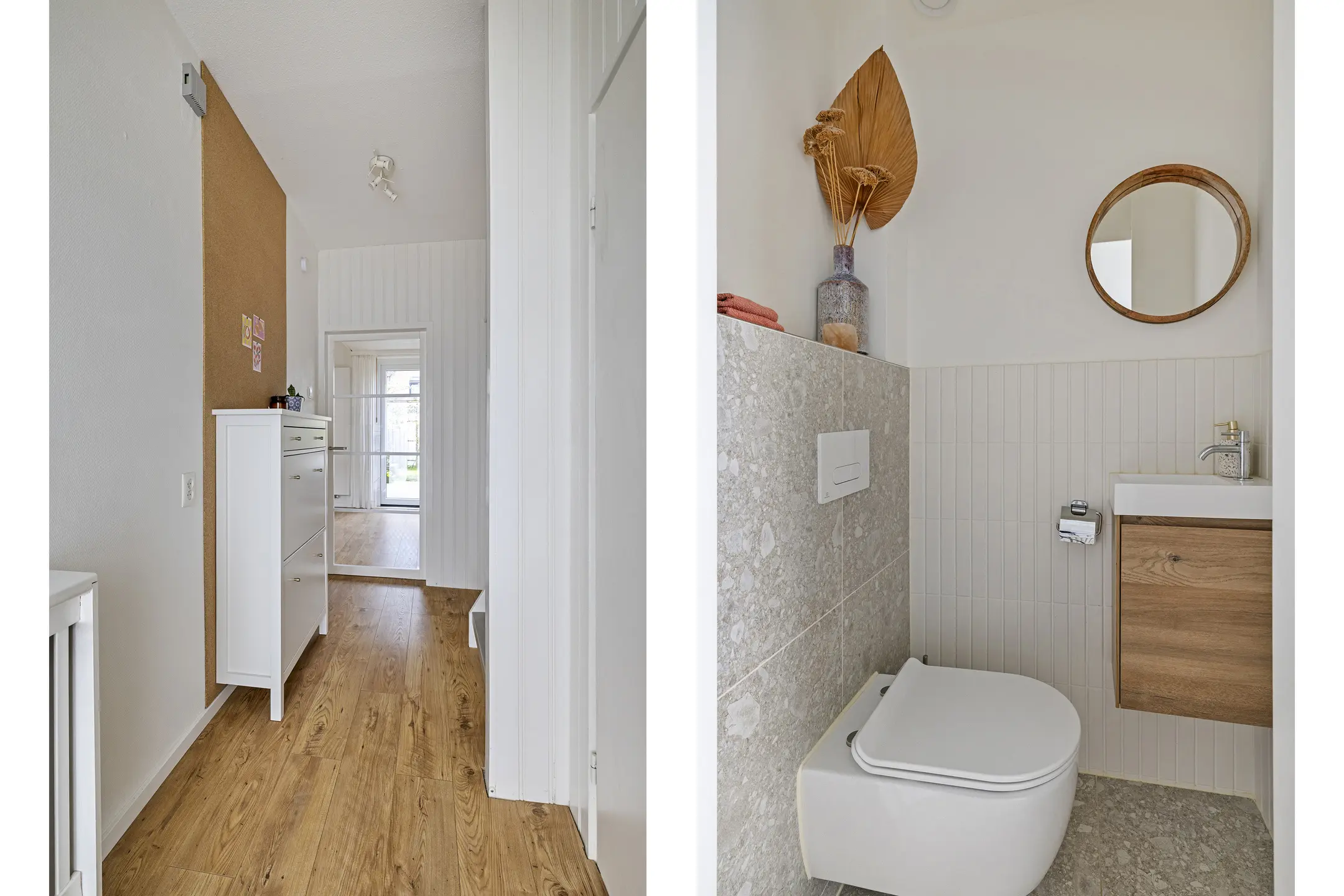 Bij aankomst valt direct de ruime voortuin met eigen parkeerplaats op. Via de entree kom je in de hal met meterkast, trapkast, een moderne toiletruimte met wandcloset en fontein, en de trap naar boven.