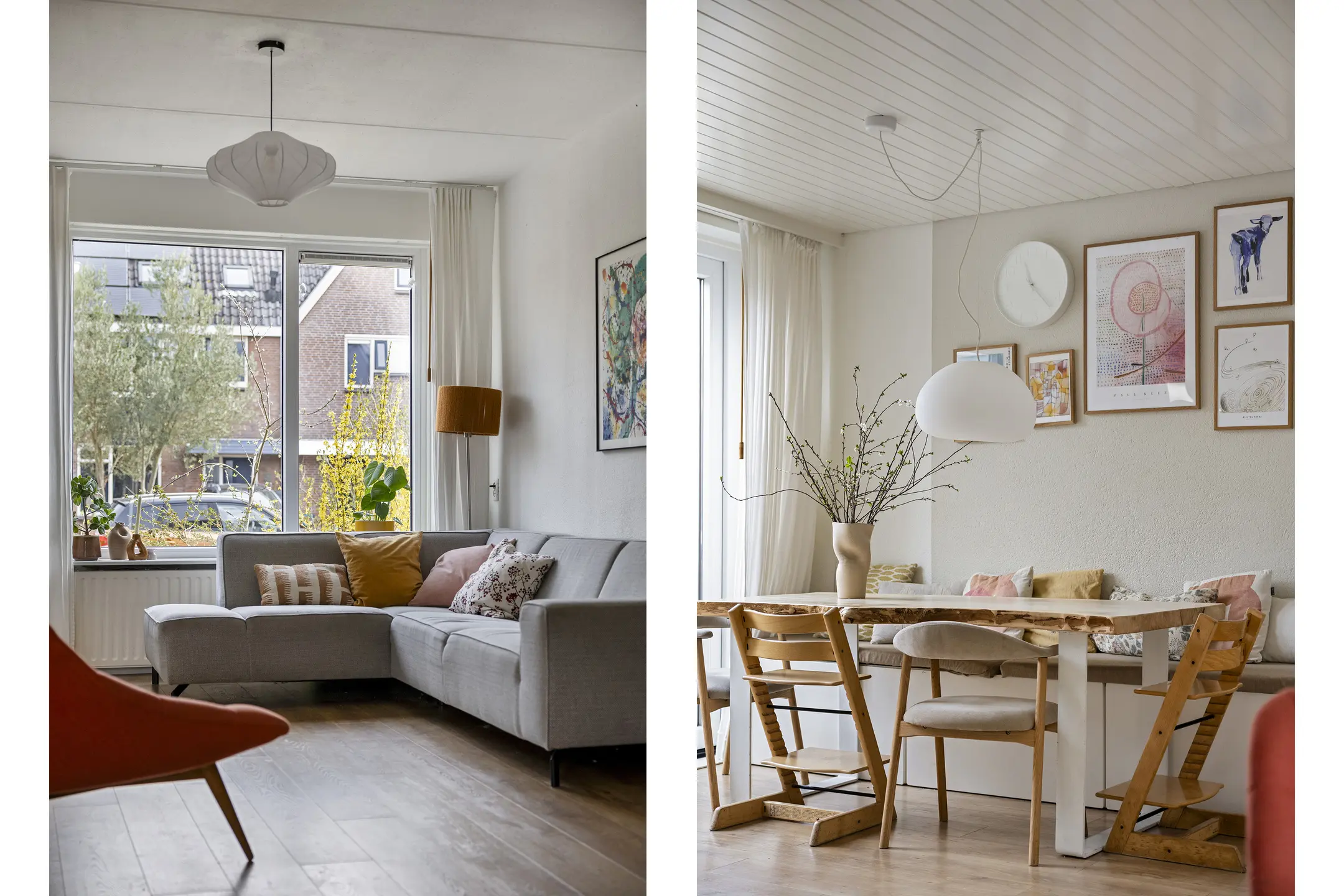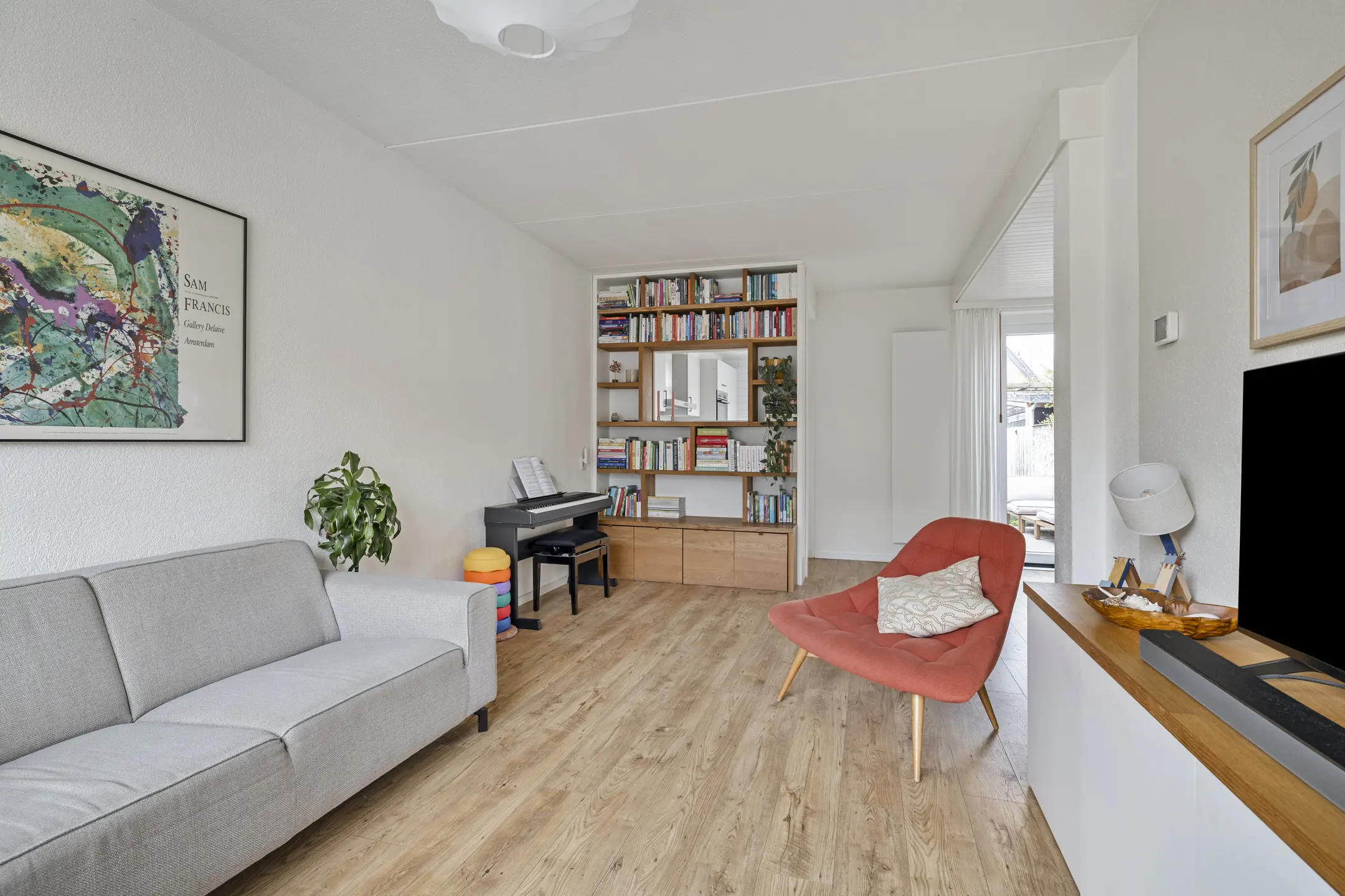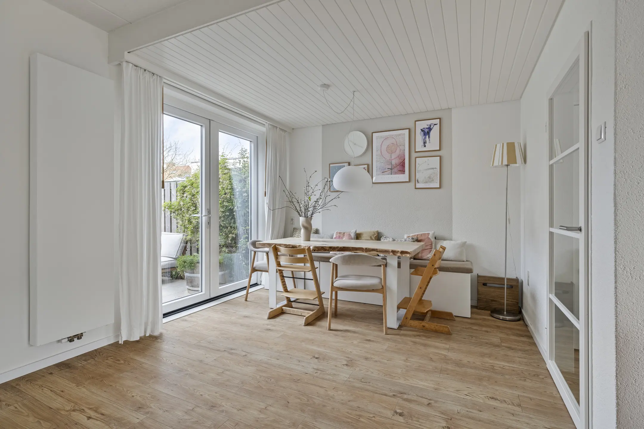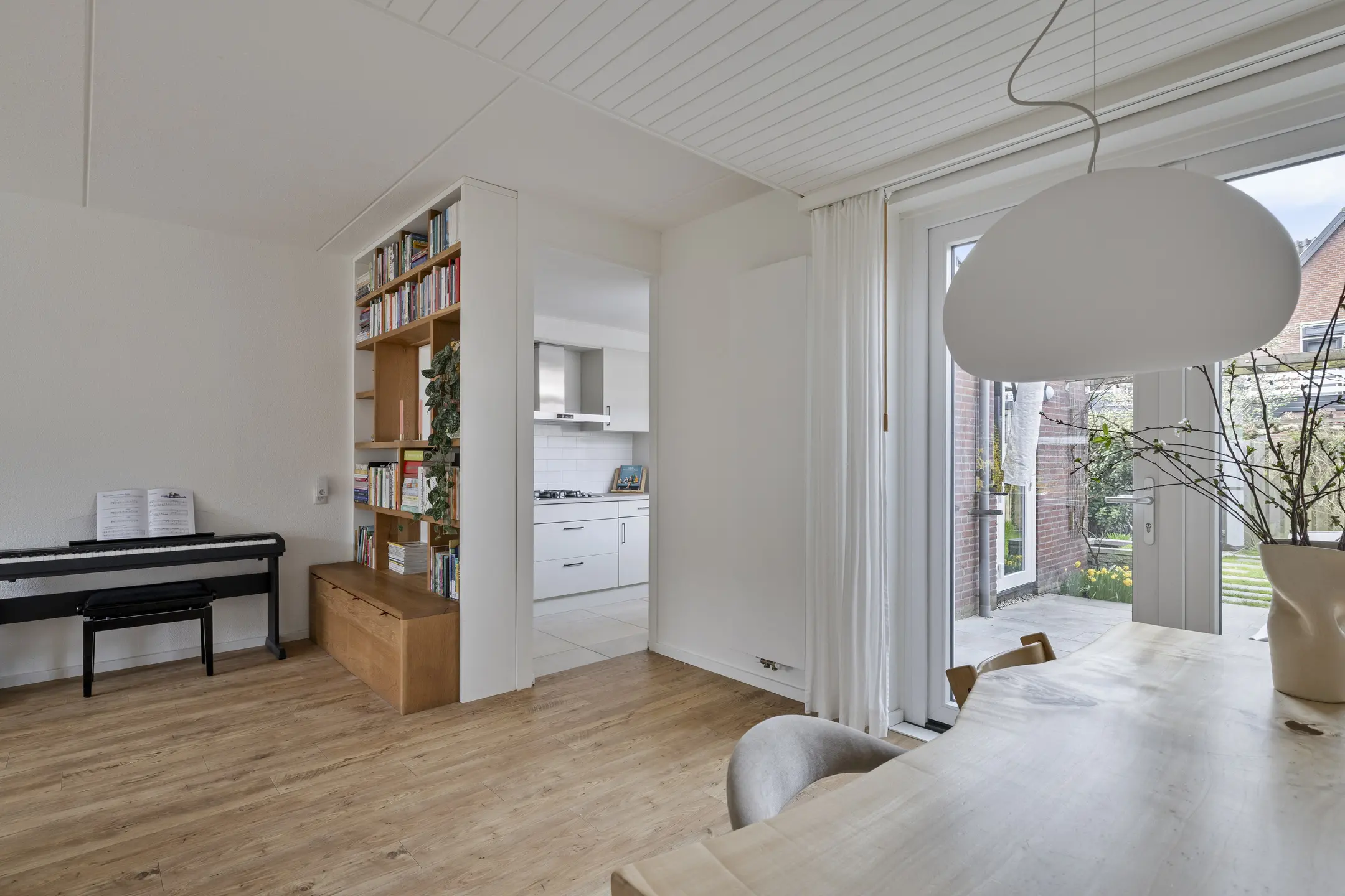 De woonkamer is heerlijk licht en speels ingedeeld, met een comfortabel zitgedeelte aan de voorzijde. Aan de achterzijde bevindt zich de ruime eethoek, waar grote raampartijen zorgen voor een prachtige lichtinval. De openslaande deuren verbinden binnen moeiteloos met buiten, perfect voor lange zomeravonden in de tuin.