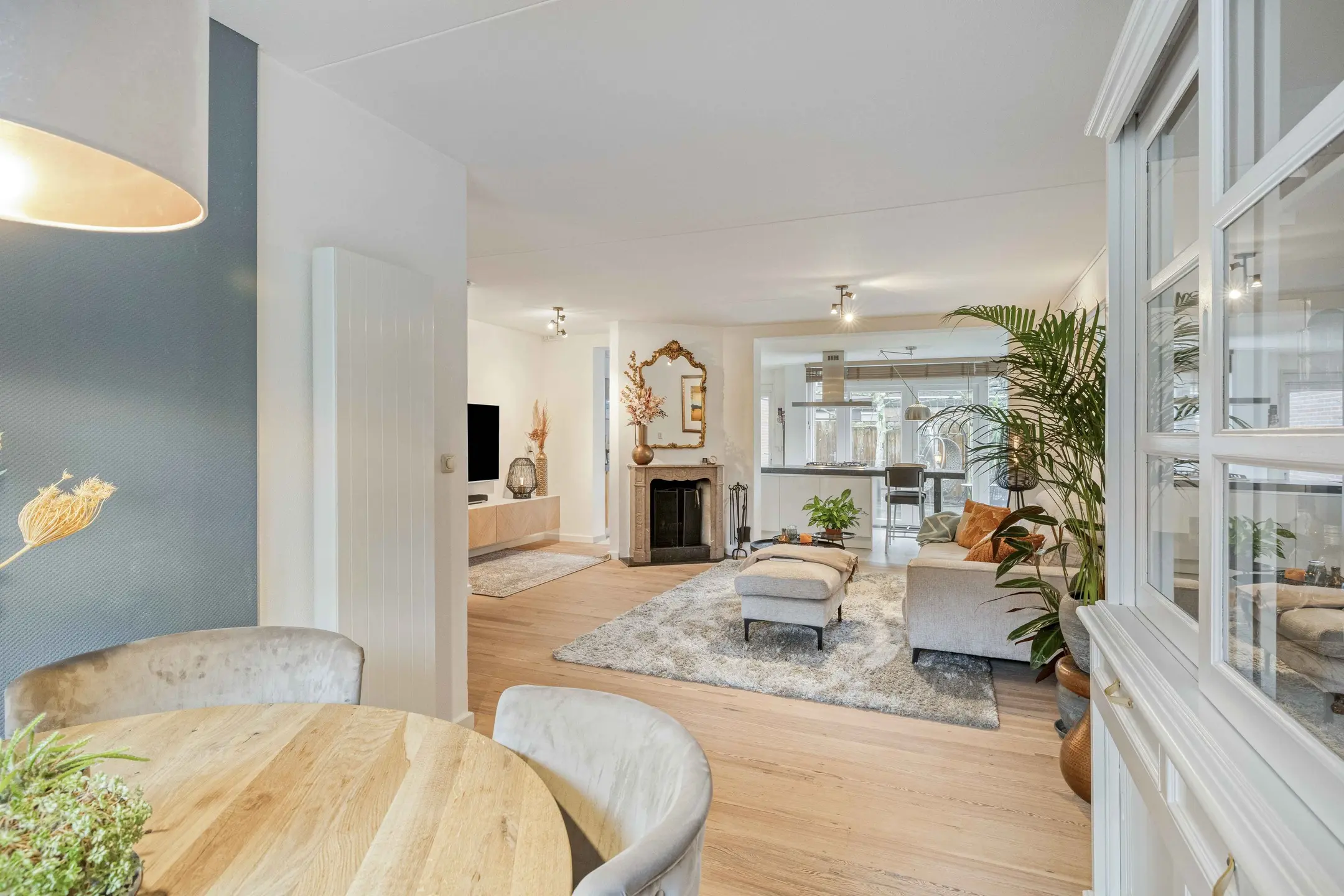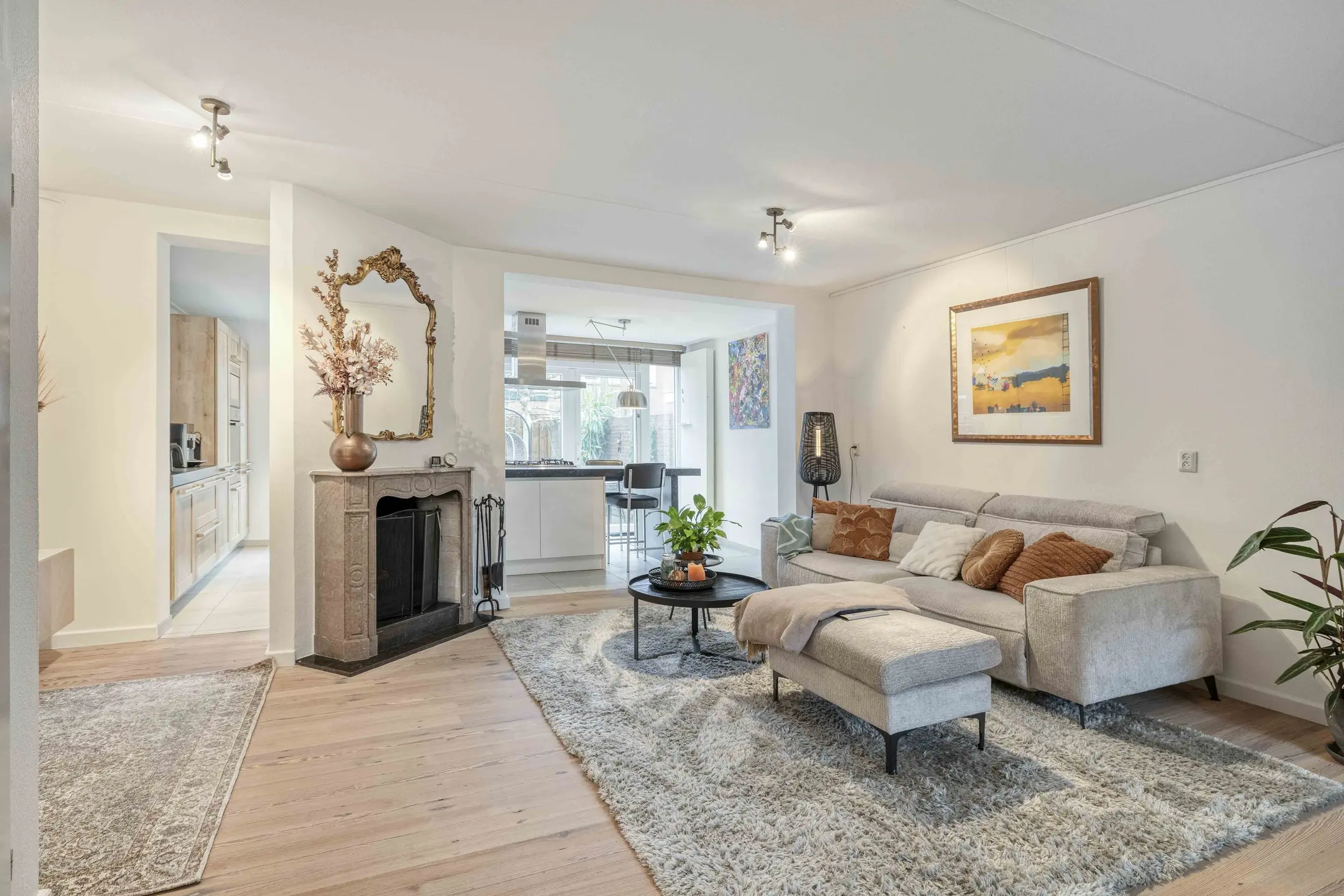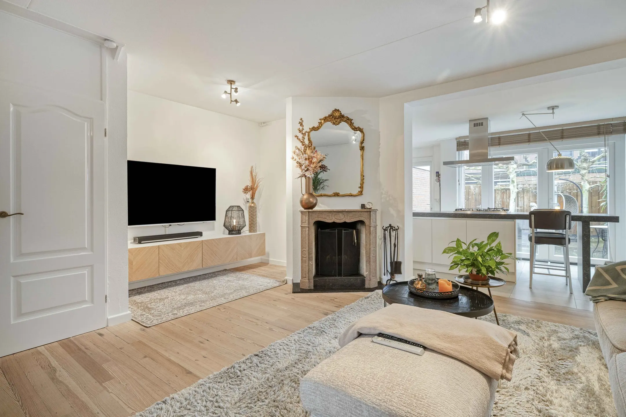 Bij binnenkomst treft u een verzorgde hal met modern toilet (voorzien van wandcloset en fontein) en de meterkast. Vanuit de hal bereikt u de sfeervolle woonkamer. Deze is voorzien van een gezellige open haard, airconditioning, een warme houten vloer en een praktische trapkast, een fijne plek om samen te ontspannen en te genieten.