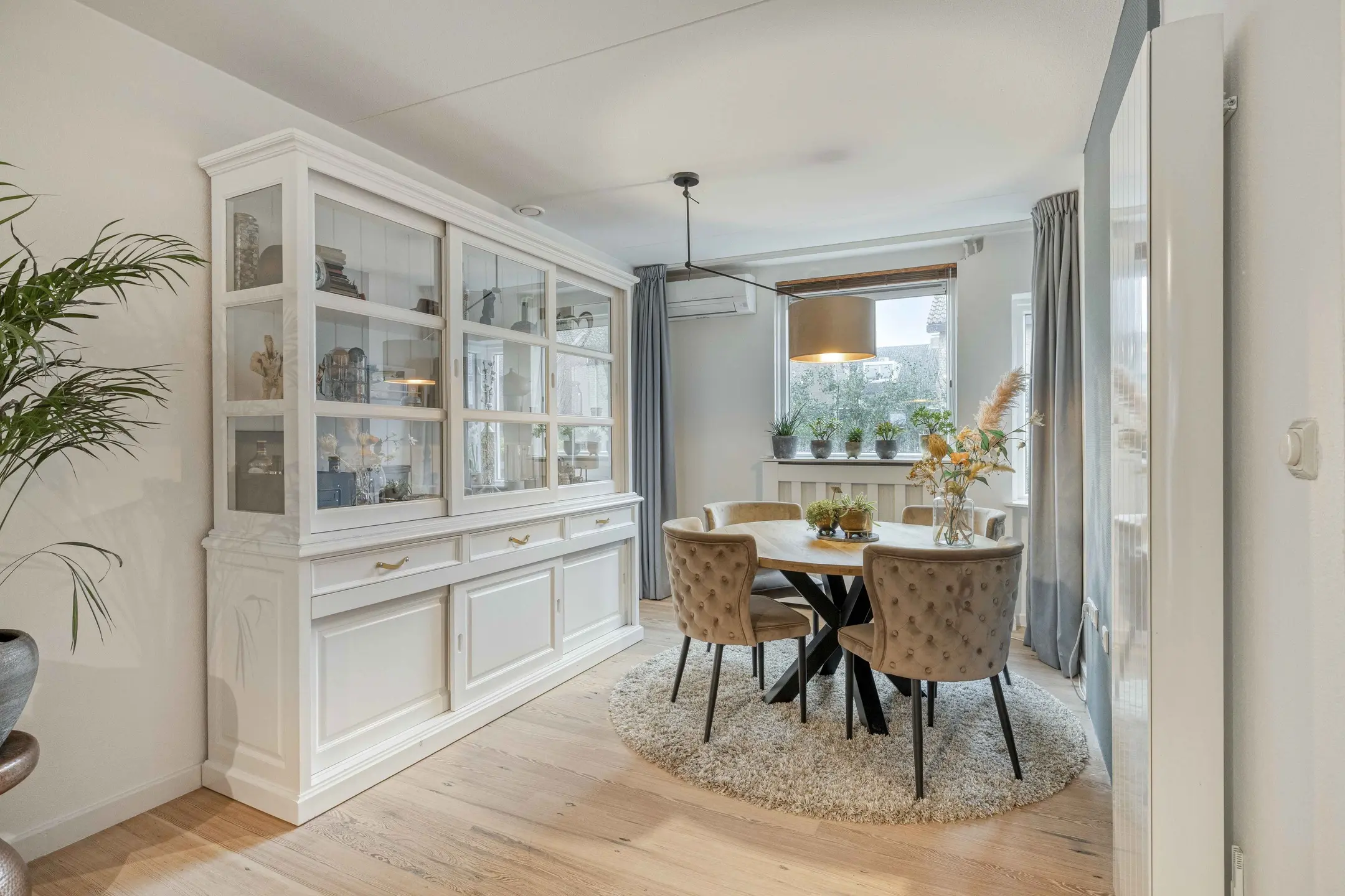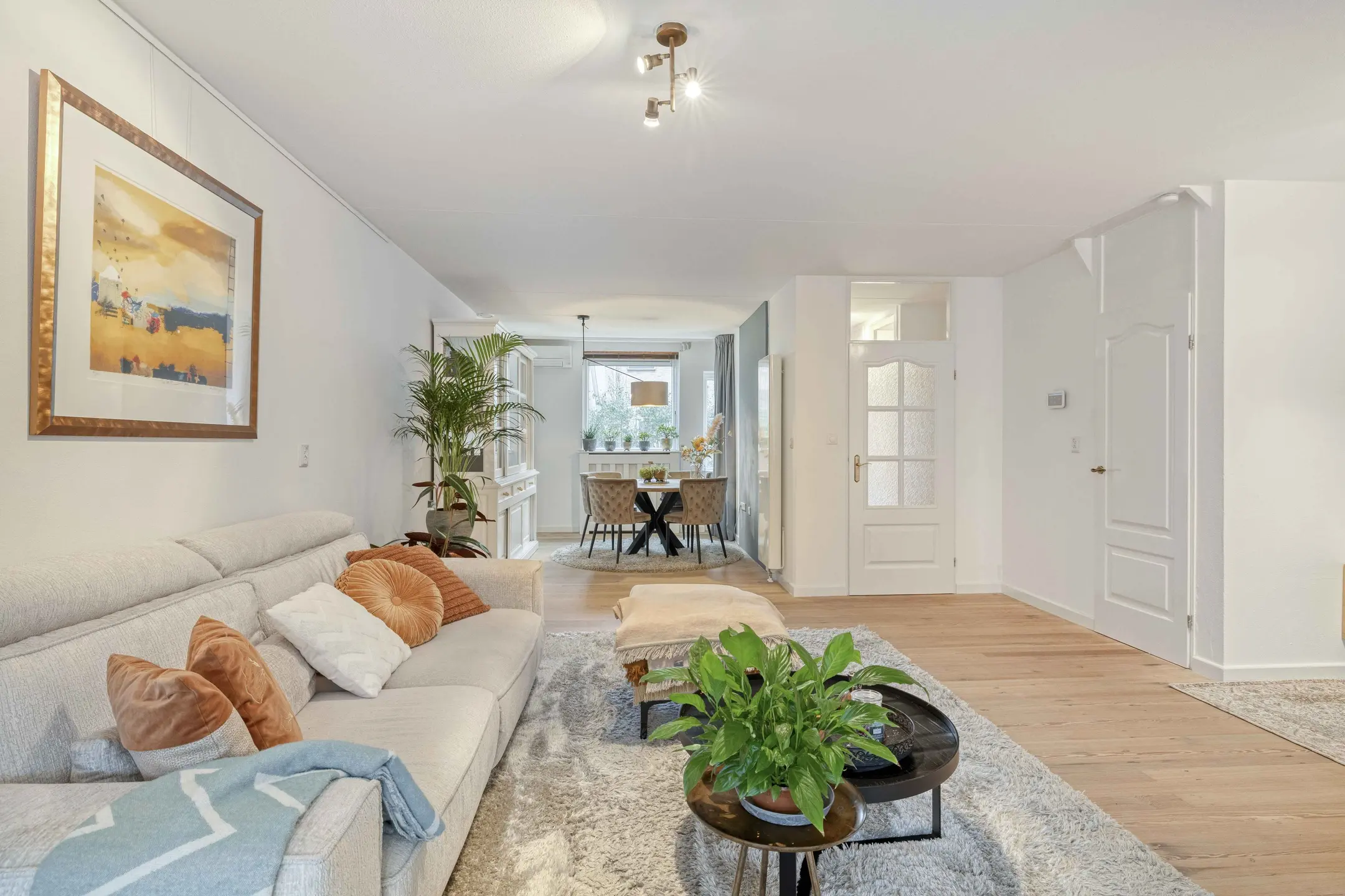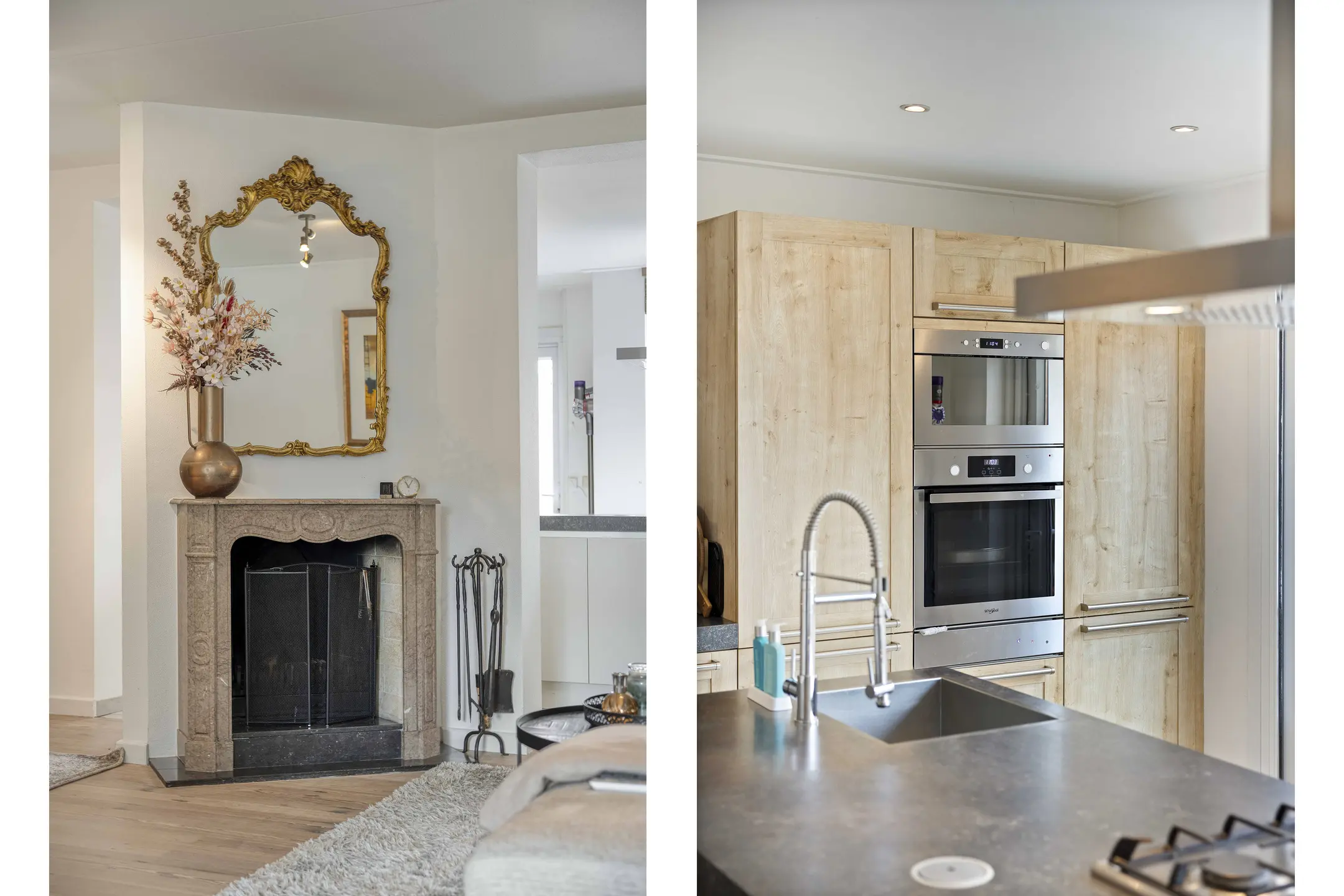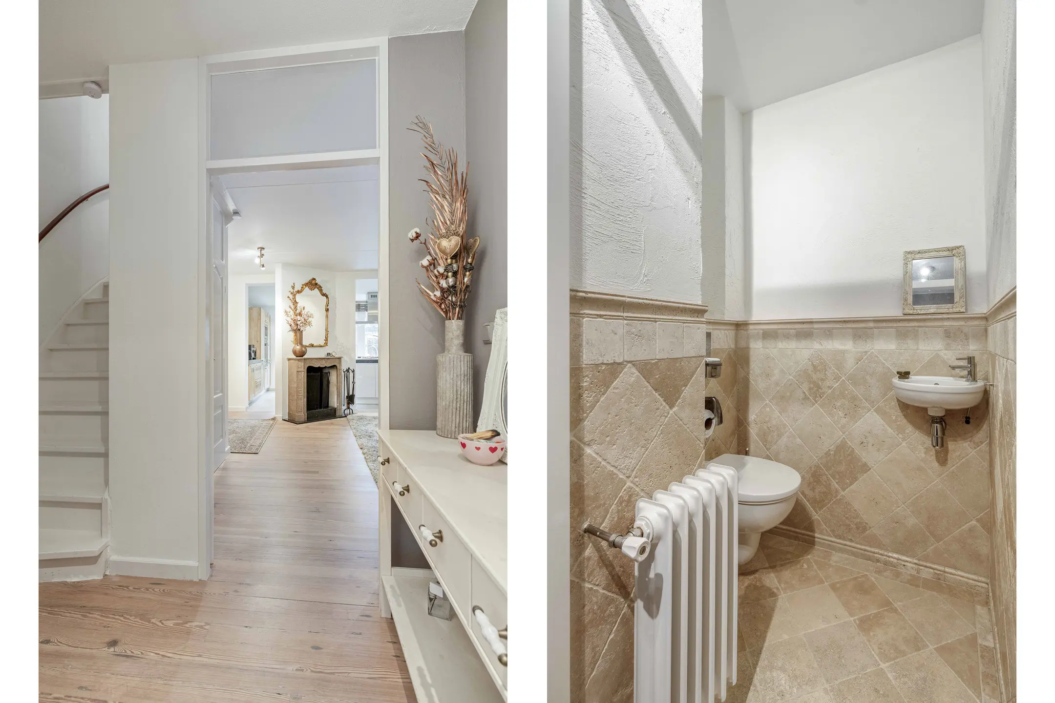 Bij binnenkomst treft u een verzorgde hal met modern toilet (voorzien van wandcloset en fontein) en de meterkast. Vanuit de hal bereikt u de sfeervolle woonkamer. Deze is voorzien van een gezellige open haard, airconditioning, een warme houten vloer en een praktische trapkast, een fijne plek om samen te ontspannen en te genieten.