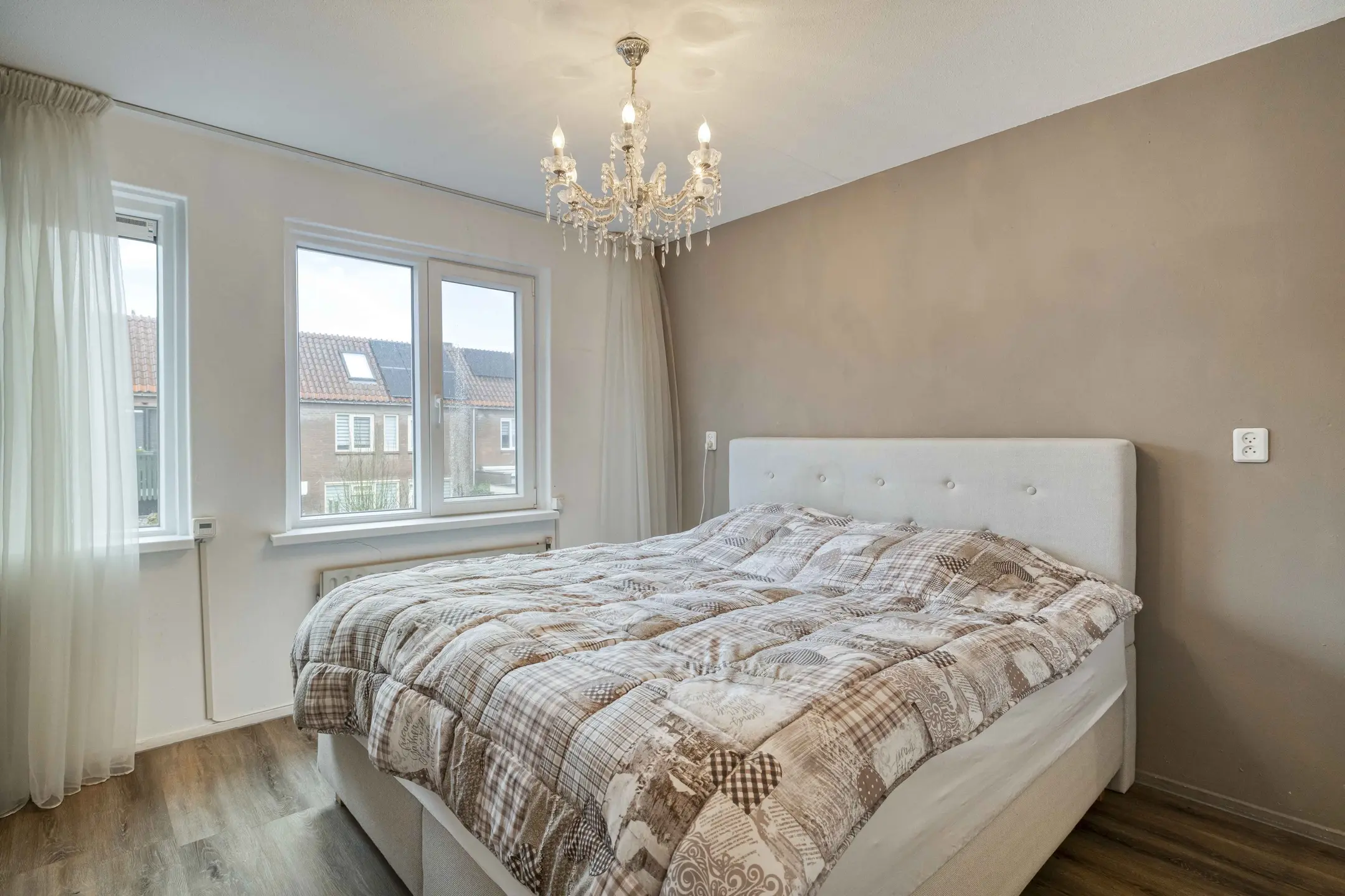 Op de eerste verdieping bevinden zich drie comfortabele slaapkamers. Aan de voorzijde van de woning ligt de master bedroom, voorzien van een praktische vaste kast, airconditioning en rolluiken met timer, een rustige en aangename plek om de dag te beginnen of af te sluiten. De overige slaapkamers aan de achterzijde van de woning zijn ook uitgerust met rolluiken met timer, wat zorgt voor optimale privacy en lichtregeling. Overal ligt een nette PVC-vloer, die bijdraagt aan de moderne en verzorgde uitstraling van deze verdieping.