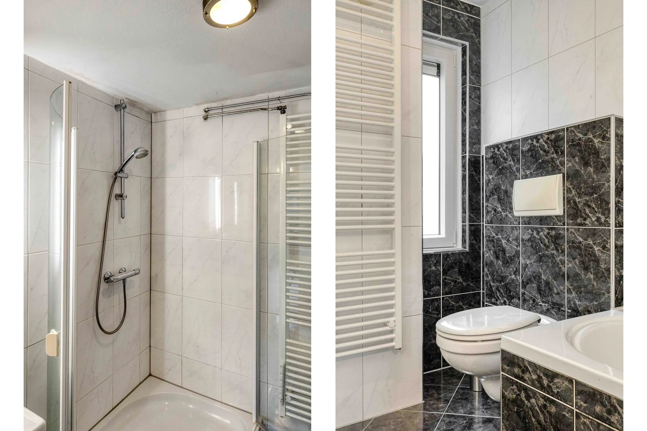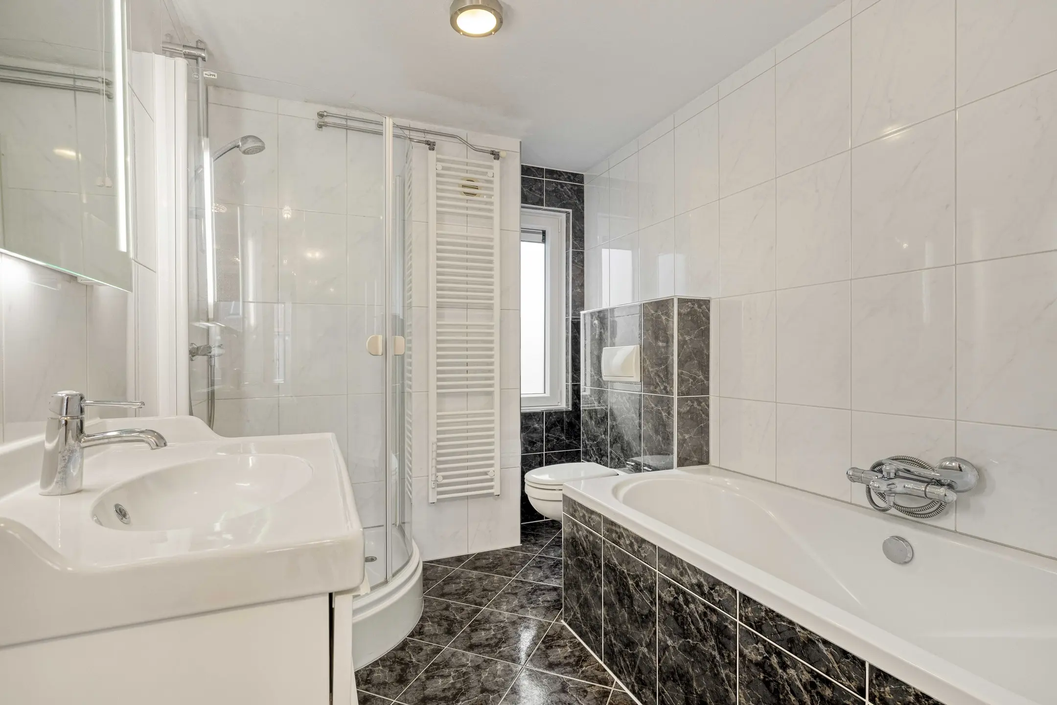 De badkamer is compleet ingericht met een wastafelmeubel, douchecabine met thermostaatkraan, ligbad met thermostaatkraan, toilet en een designradiator.