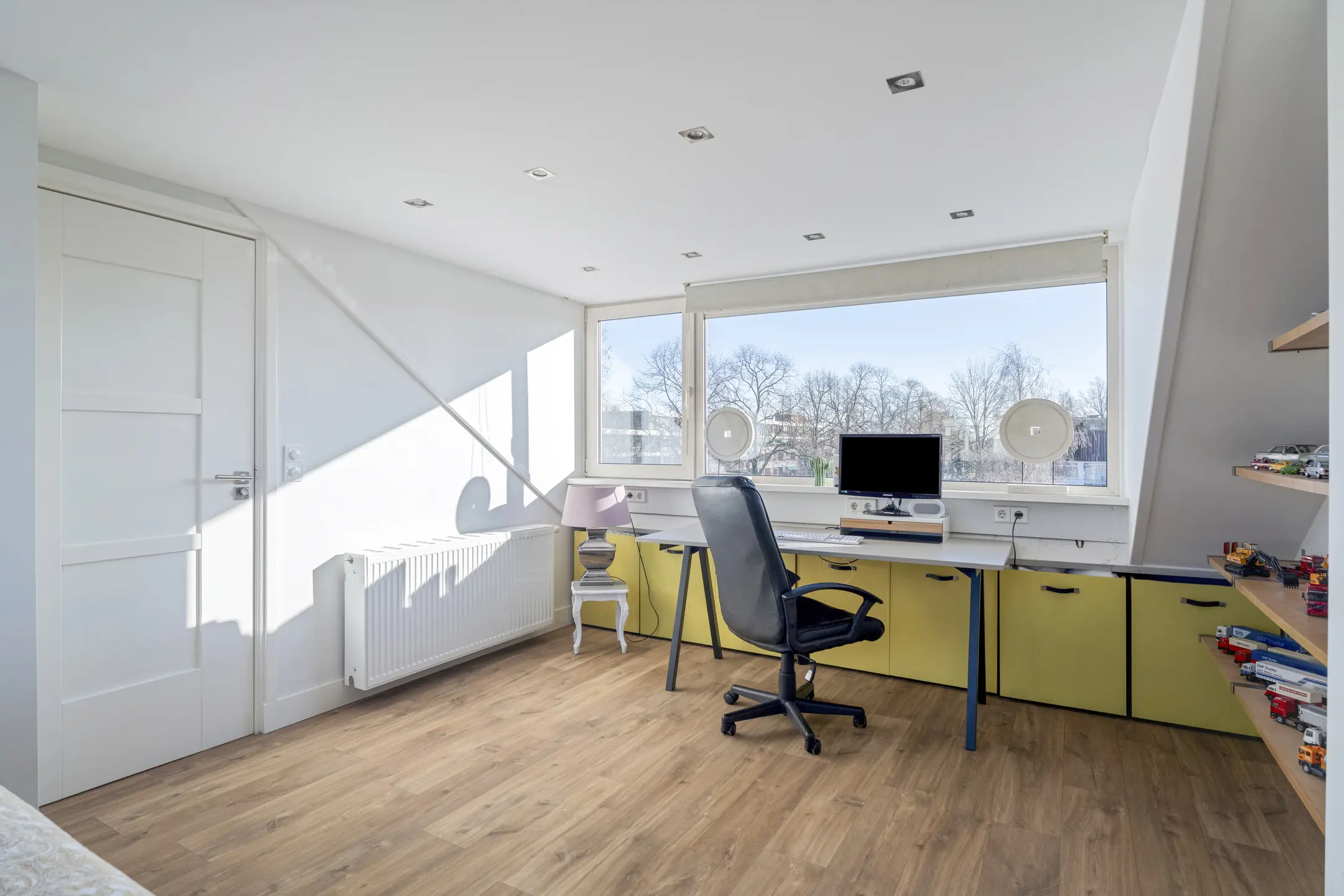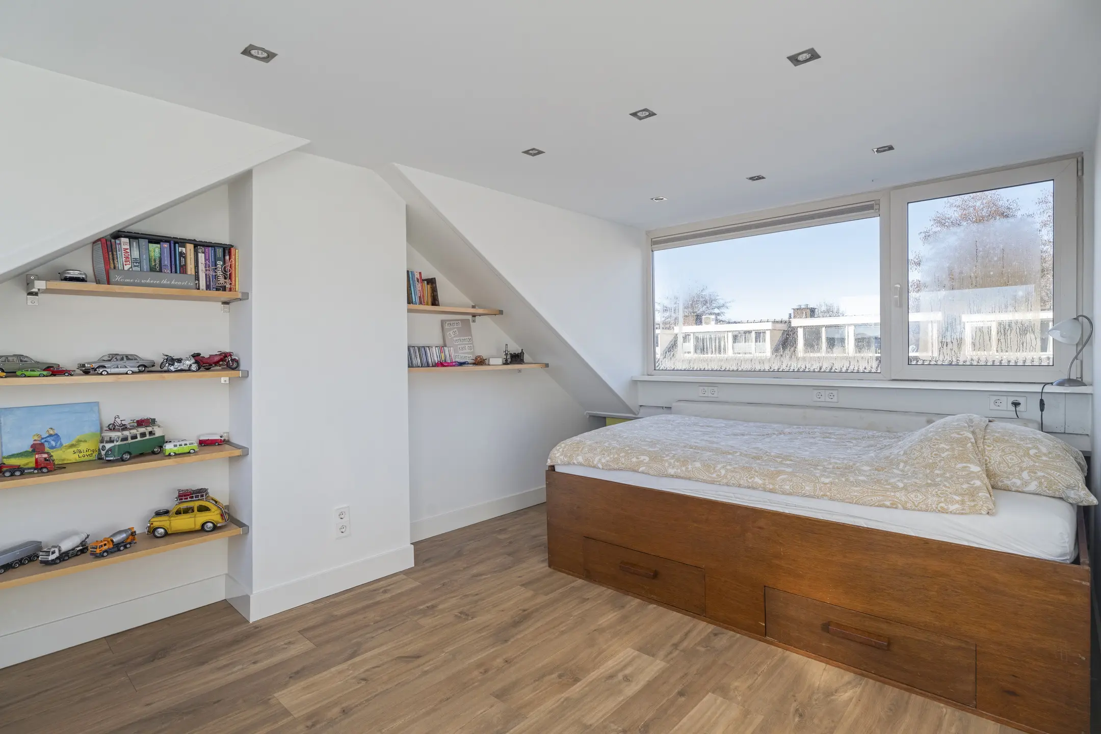 De overloop beschikt over veel opbergruimte en de opstelplaats van de cv-ketel. Hier bevindt zich een ruime derde slaapkamer met dakkapellen aan zowel de voor- als achterzijde, waardoor de kamer heerlijk licht is. Ook hier is voldoende bergruimte aanwezig. Doordat er zowel aan de voor- als achterzijde een dakkapel is geplaatst, is het ook mogelijk om op deze verdieping een extra slaapkamer te realiseren, of op de voorzolder een werkhoek.