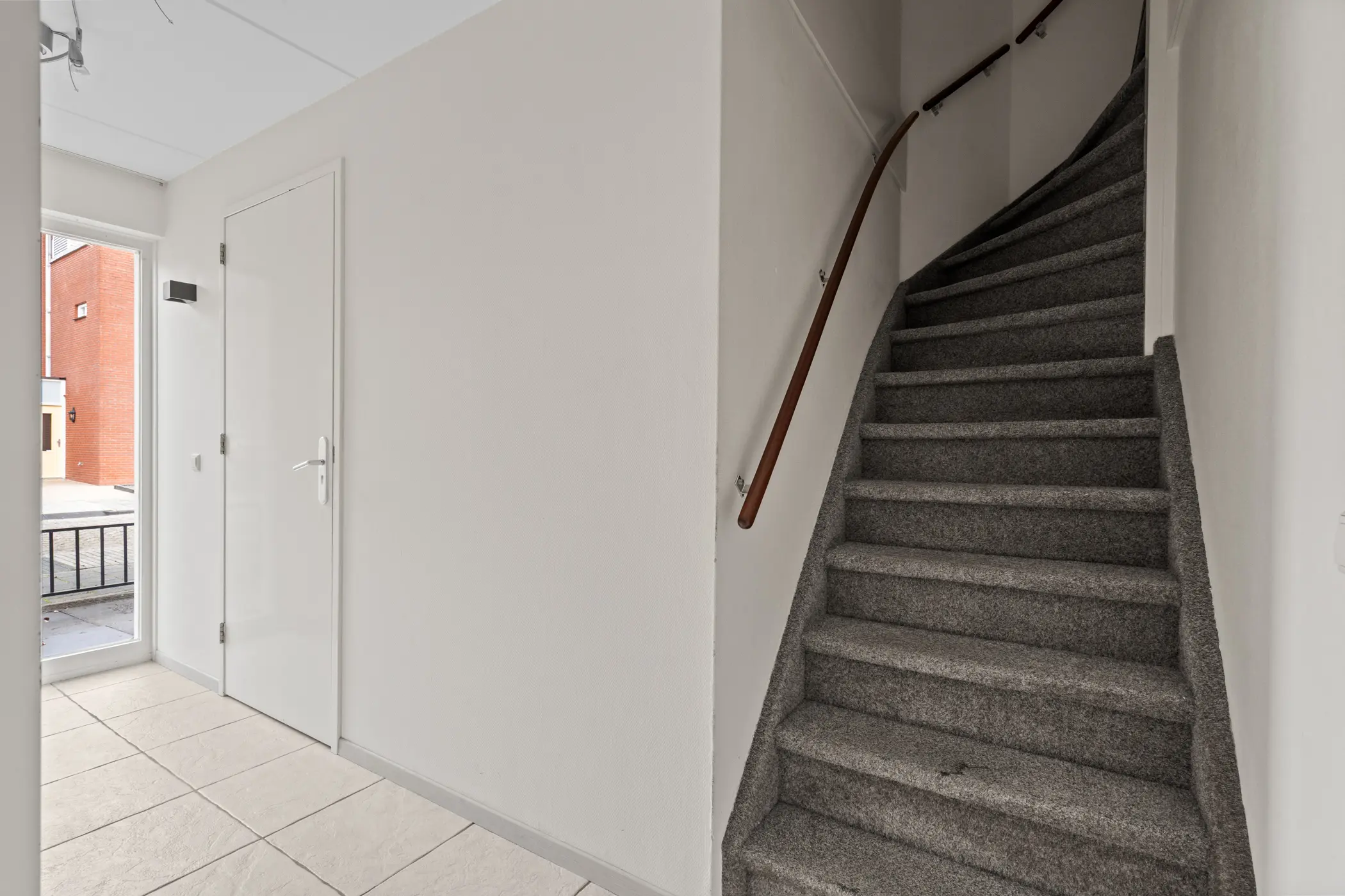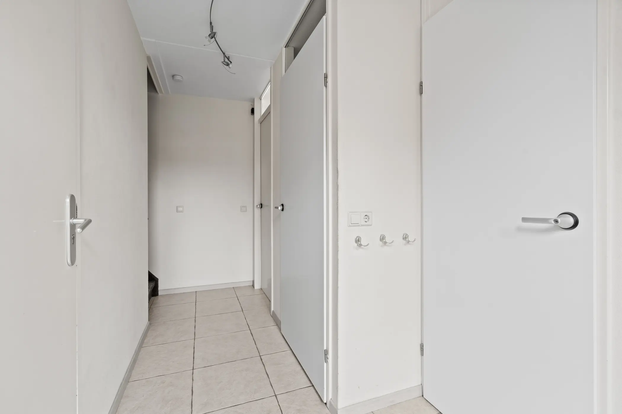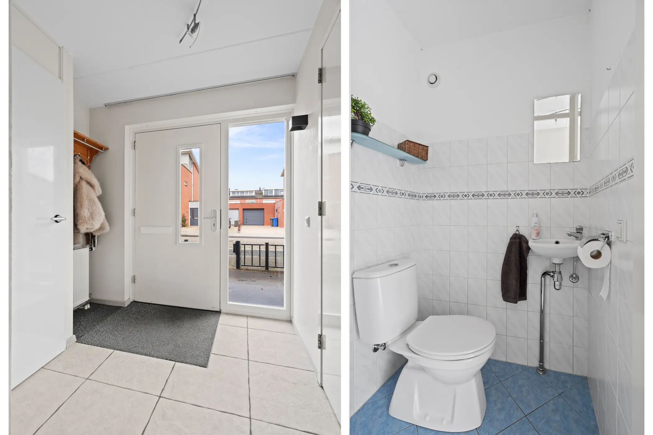 De entree bestaat uit een ruime hal met meterkast, garderobenis, een toiletruimte met toilet en fonteintje, de trapopgang naar de eerste verdieping en de doorgang naar de woonkamer.