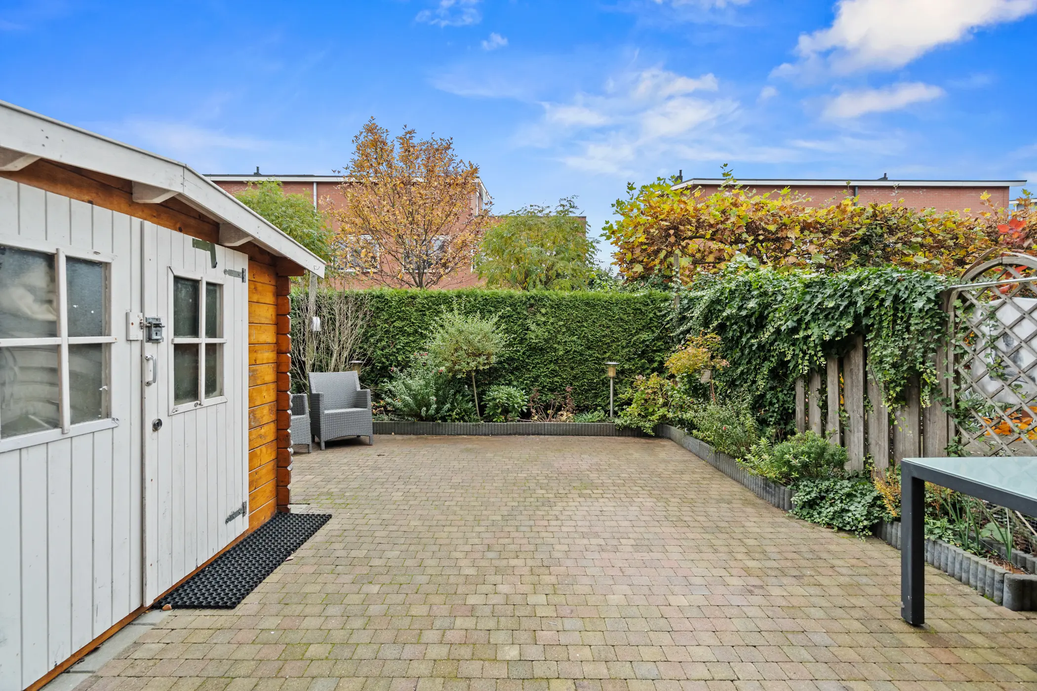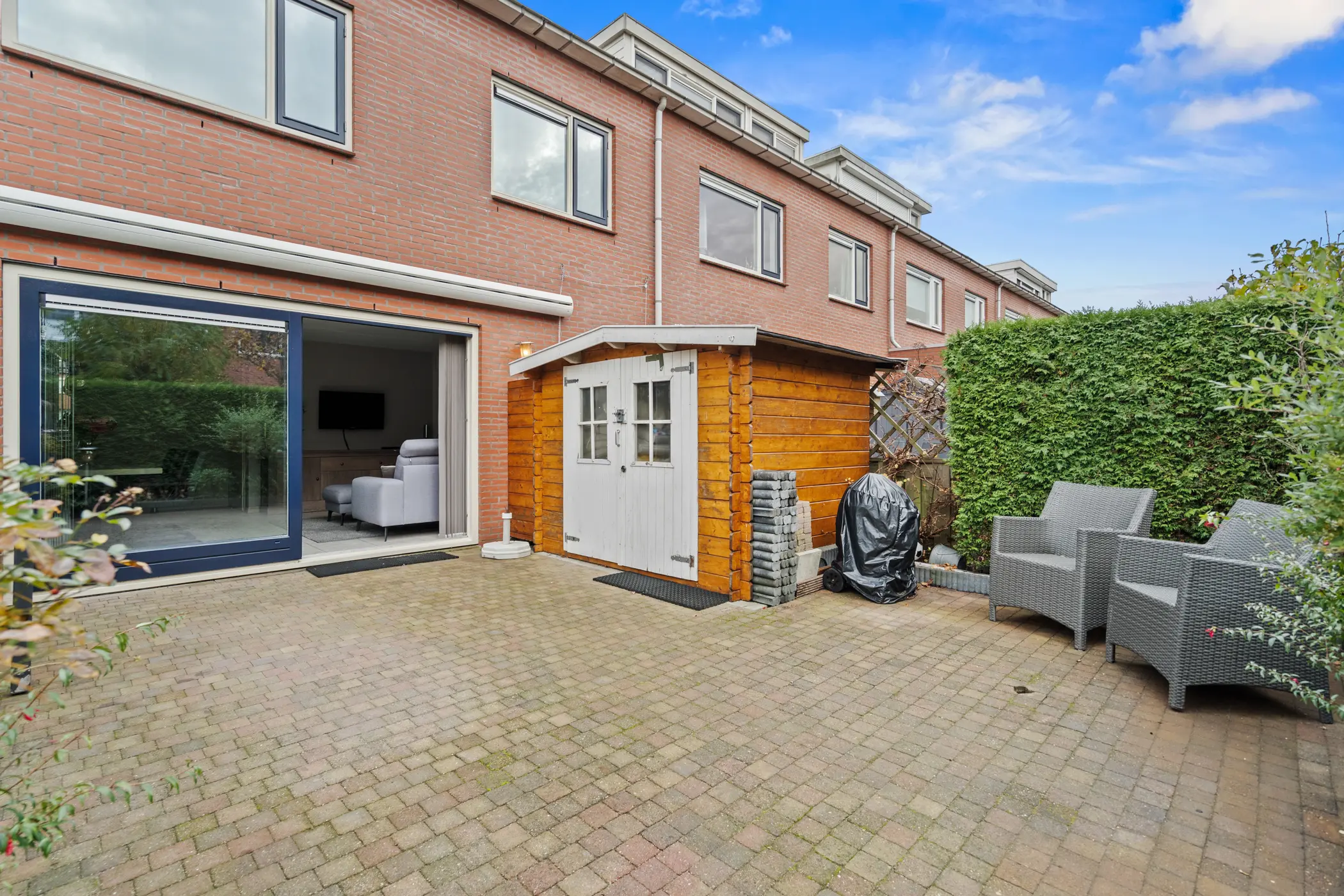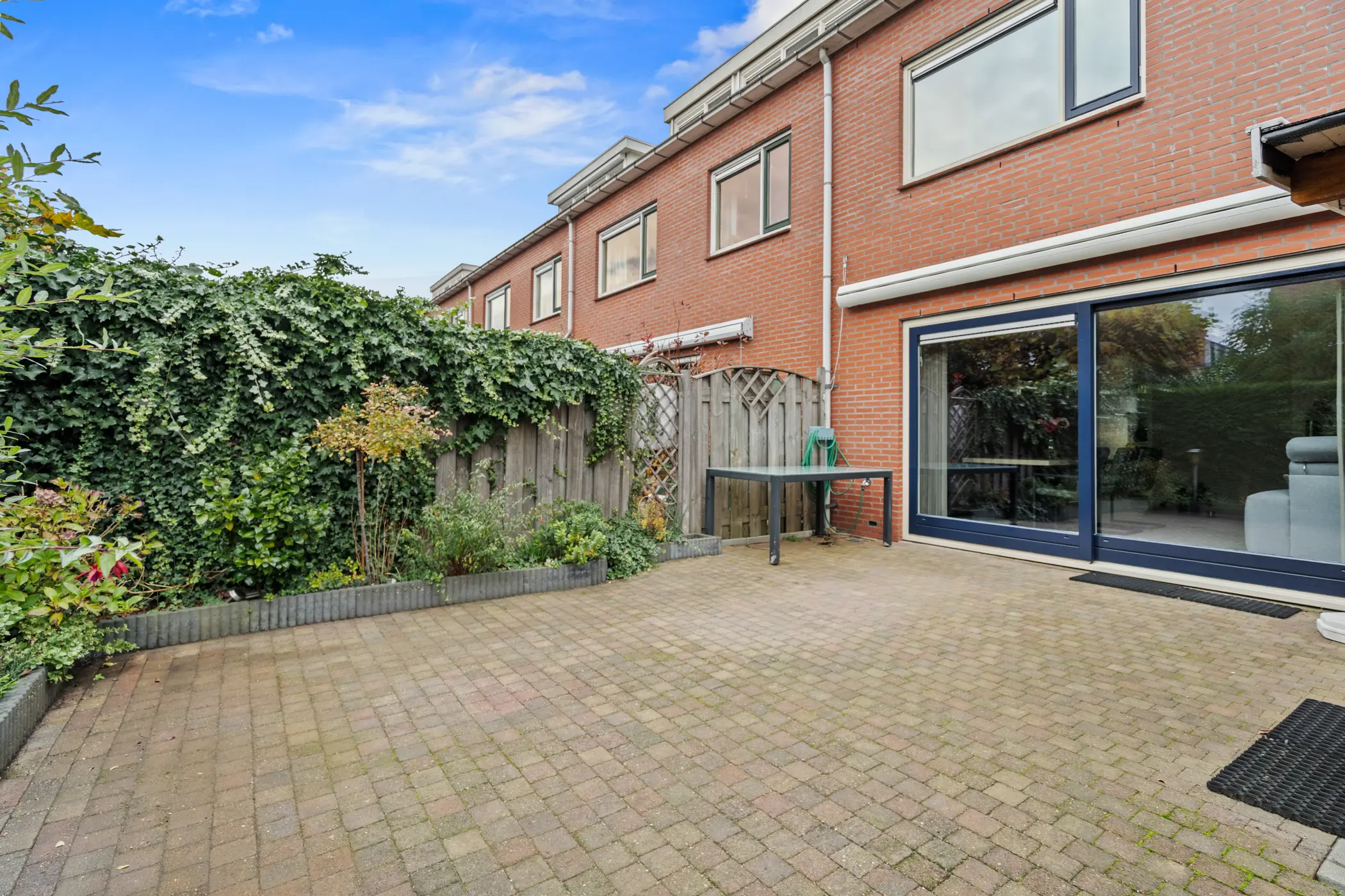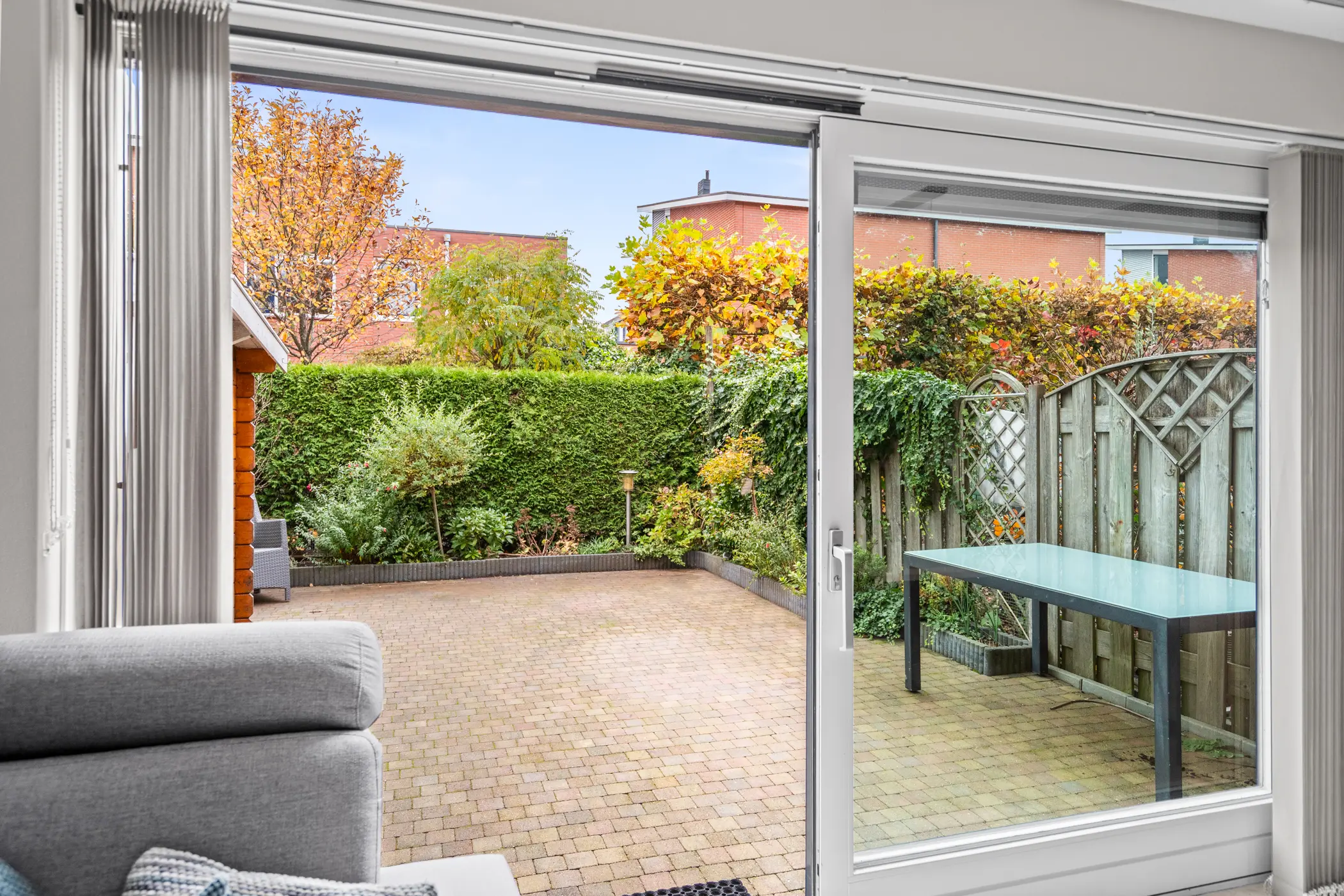 De verzorgde achtertuin op het zuidwesten is een heerlijke plek om te genieten van de zon. In 2023 is de tuin opgehoogd en voorzien van sfeervolle tuinverlichting en een praktisch buitenstopcontact. Het grote zonnescherm aan de achtergevel zorgt ervoor dat je op warme dagen eenvoudig een fijne, schaduwrijke zitplek creëert.