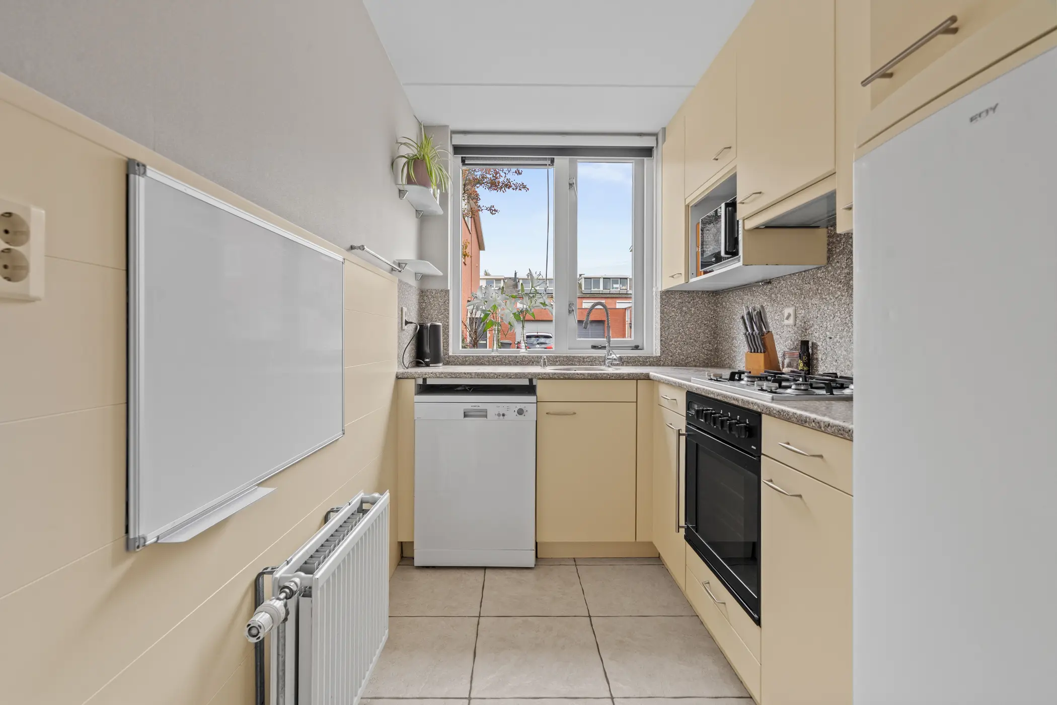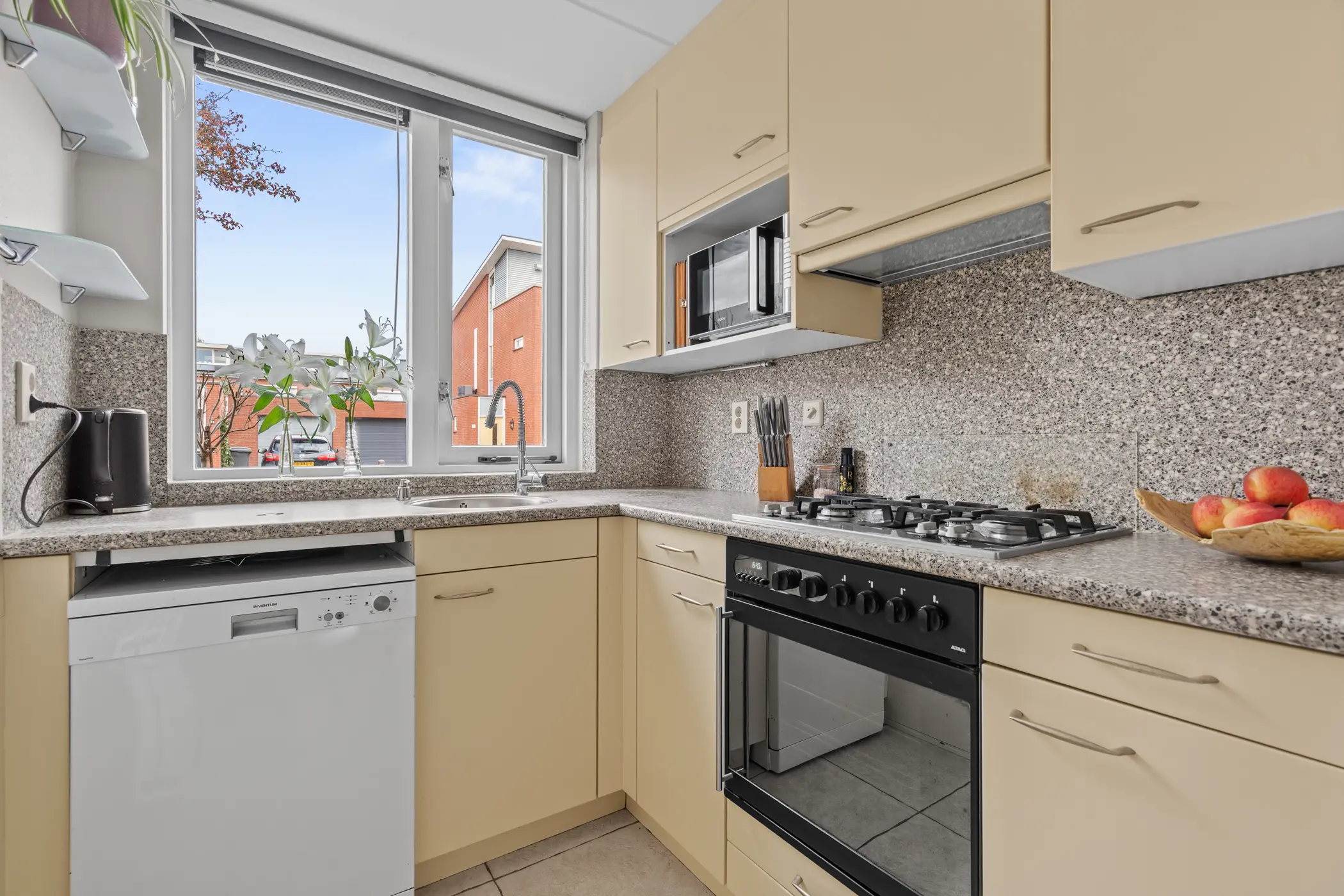 De L-vormige keuken bevindt zich aan de voorzijde van de woning en is uitgerust met diverse inbouwapparatuur, waaronder een 4-pits gasfornuis en oven. Daarnaast is er een losse koelkast en een losse vaatwasser geplaatst.