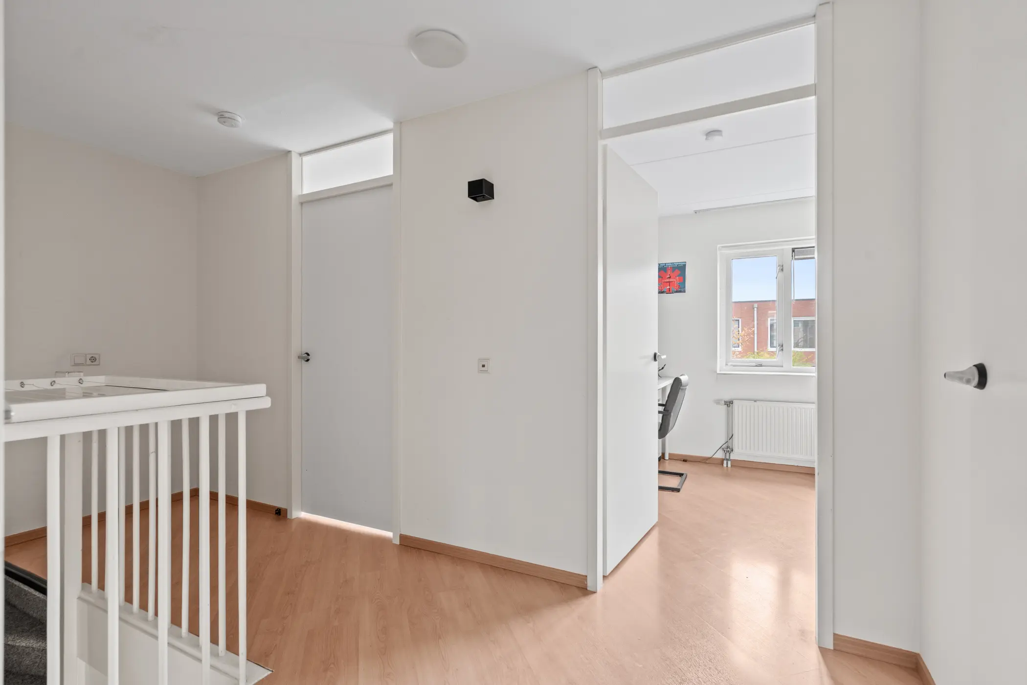 De brede overloop geeft toegang tot vier goed bemeten slaapkamers, allemaal met veel lichtinval. De badkamer is compleet uitgevoerd en voorzien van een douche, ligbad, toilet en wastafel.