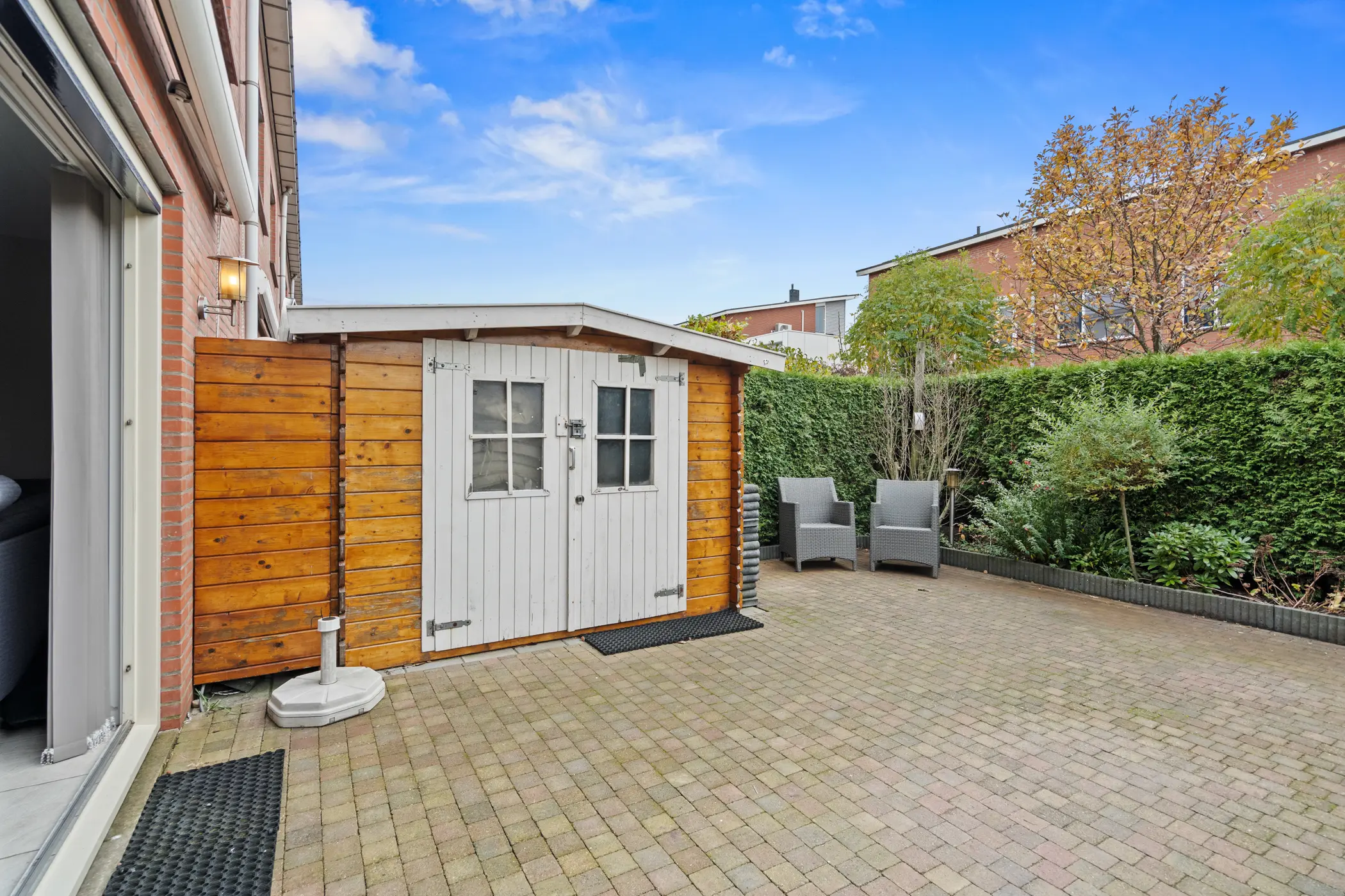 In de tuin staat een houten berging met elektra en meerdere stopcontacten, ideaal voor bijvoorbeeld een extra koelkast of vriezer. Ook bevindt zich hier de schakelaar voor de buitenverlichting, waardoor alles gemakkelijk te bedienen is.