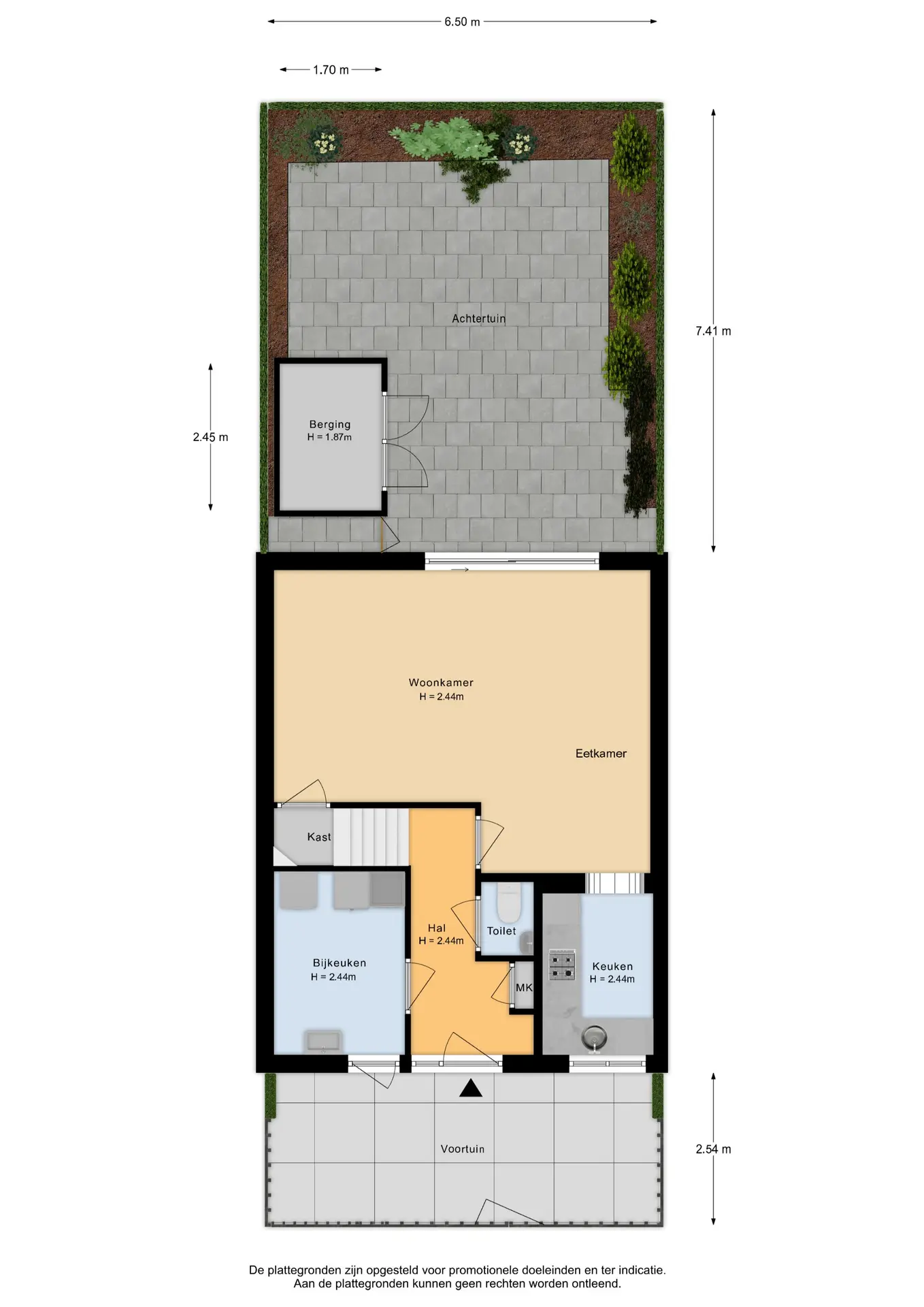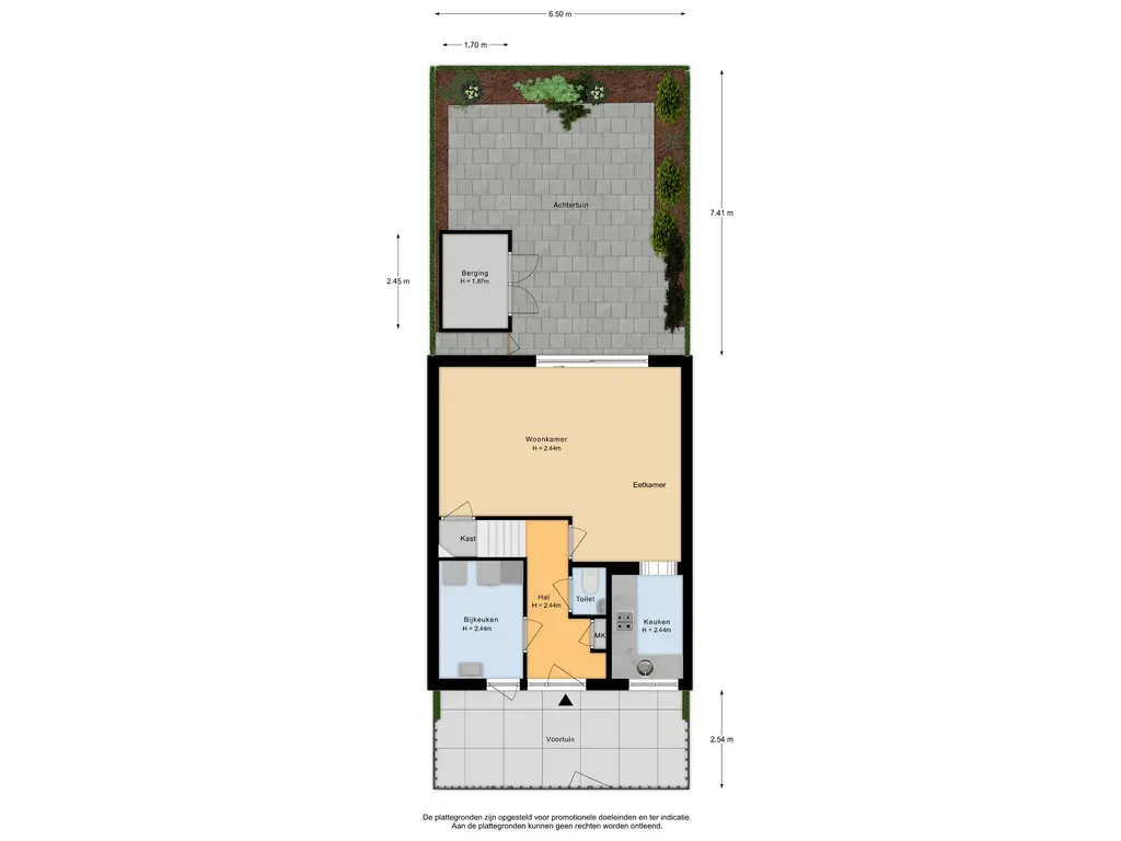 Je bereikt de woning via een brede voortuin. Vanuit hier is ook de inpandige fietsenberging toegankelijk; deze berging is voorzien van elektra, stopcontacten en biedt ruimte voor de wasmachine en droger. Daarnaast vind je hier een wasbak met thermostaatkraan, vloerverwarming en een radiator, waardoor het een fijne, droge bergruimte of praktische klusplek is.