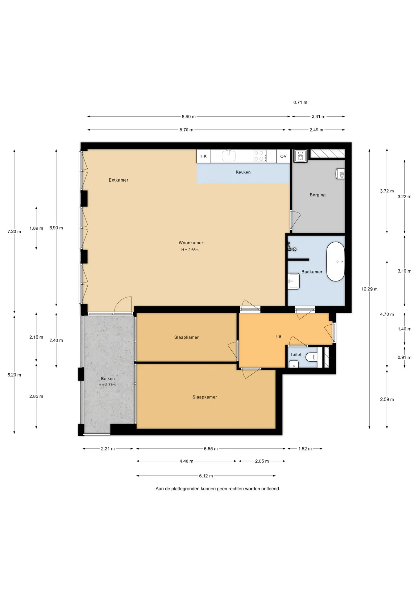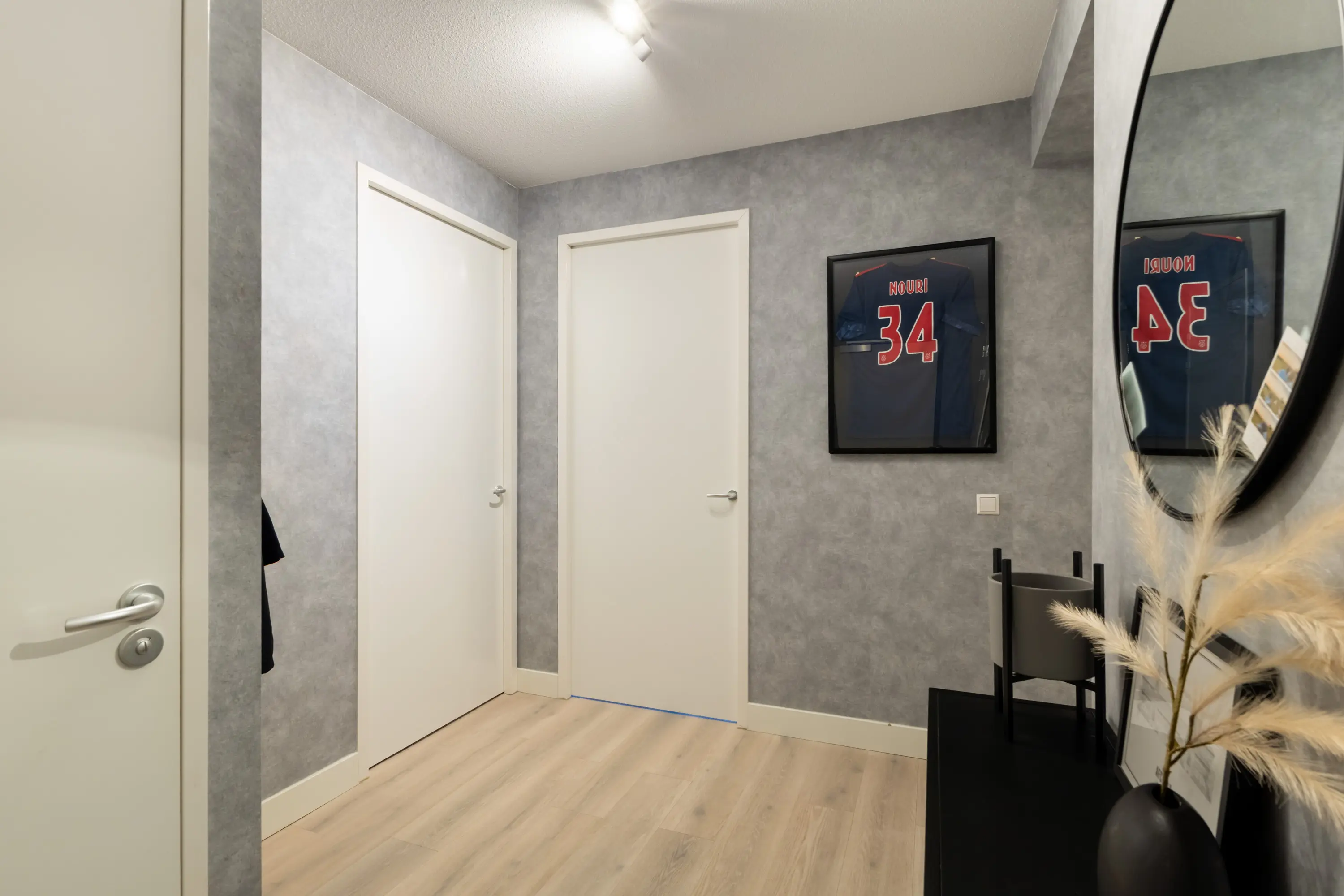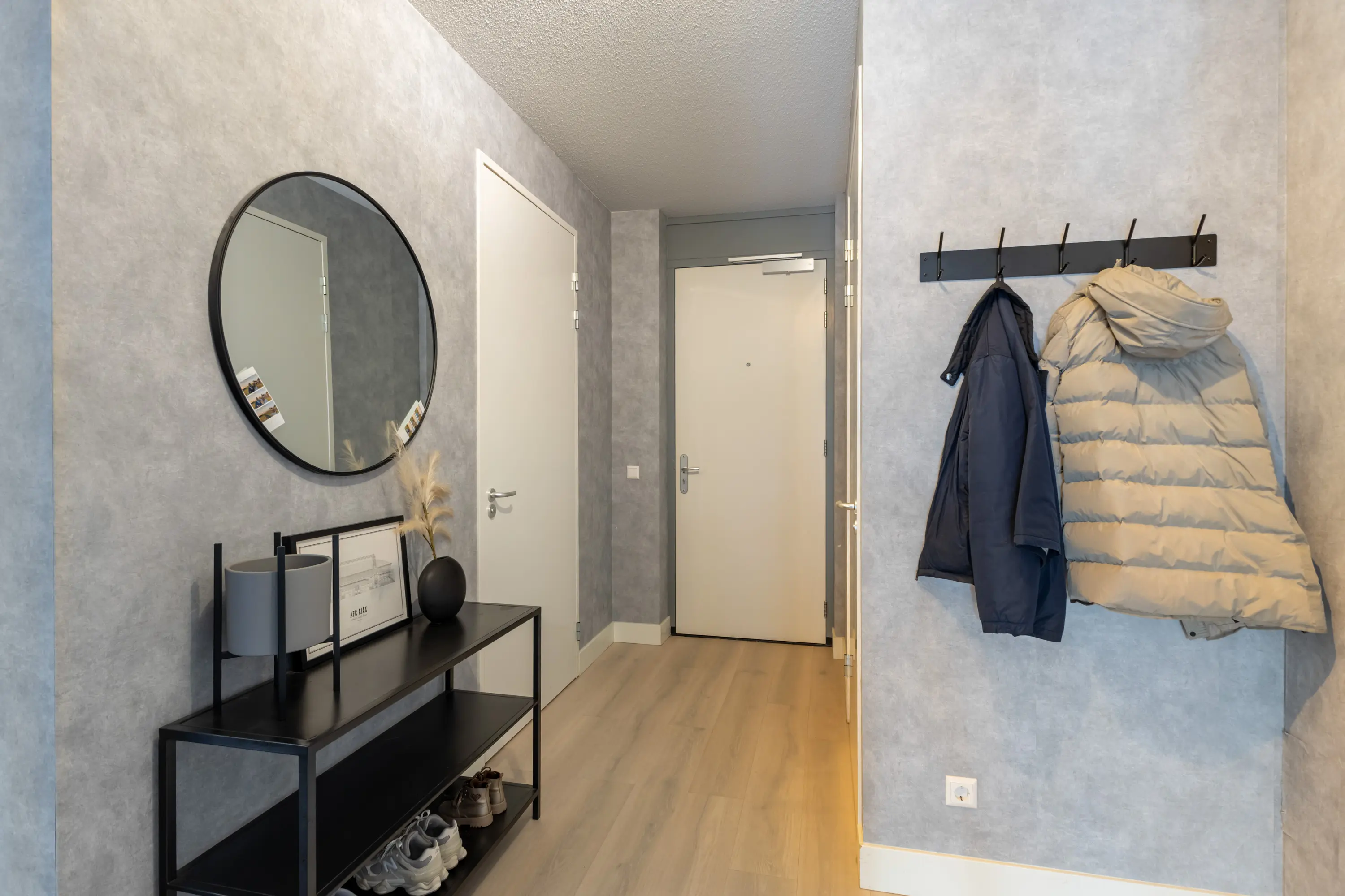 Appartementsentree. Entree, ruime hal met toiletruimte. Vanuit de hal is er toegang tot de ruime woonkamer, twee slaapkamers en de badkamer.