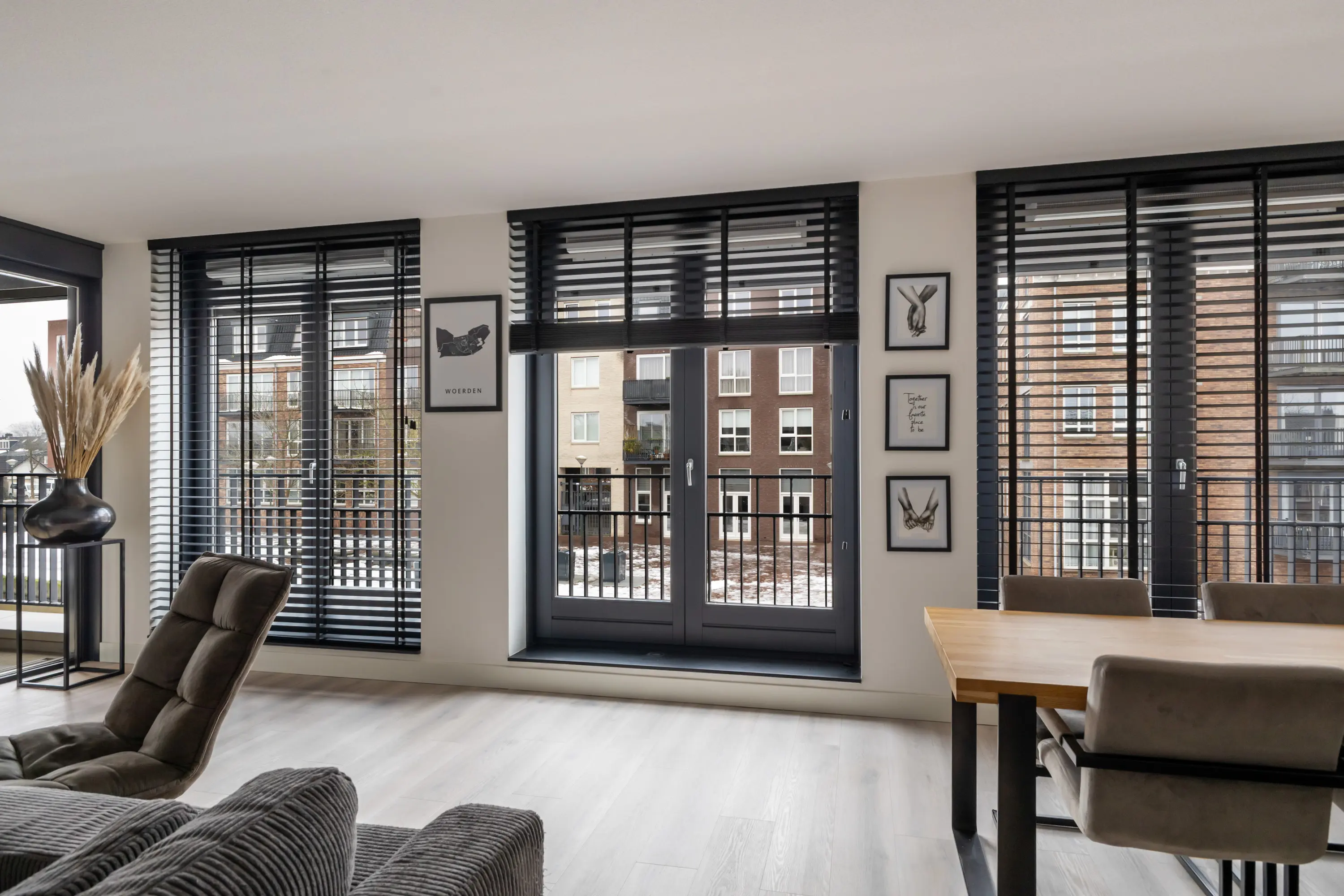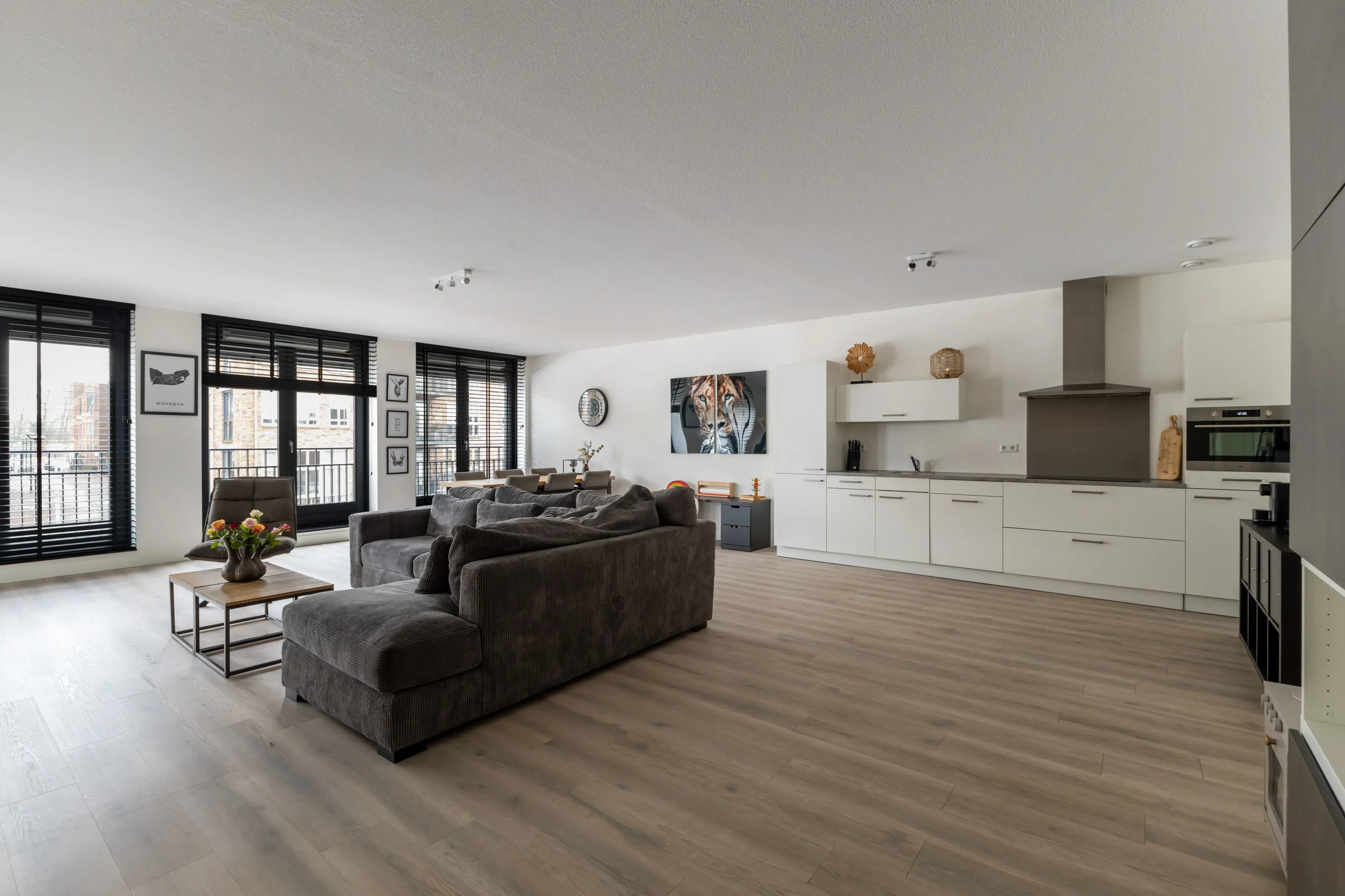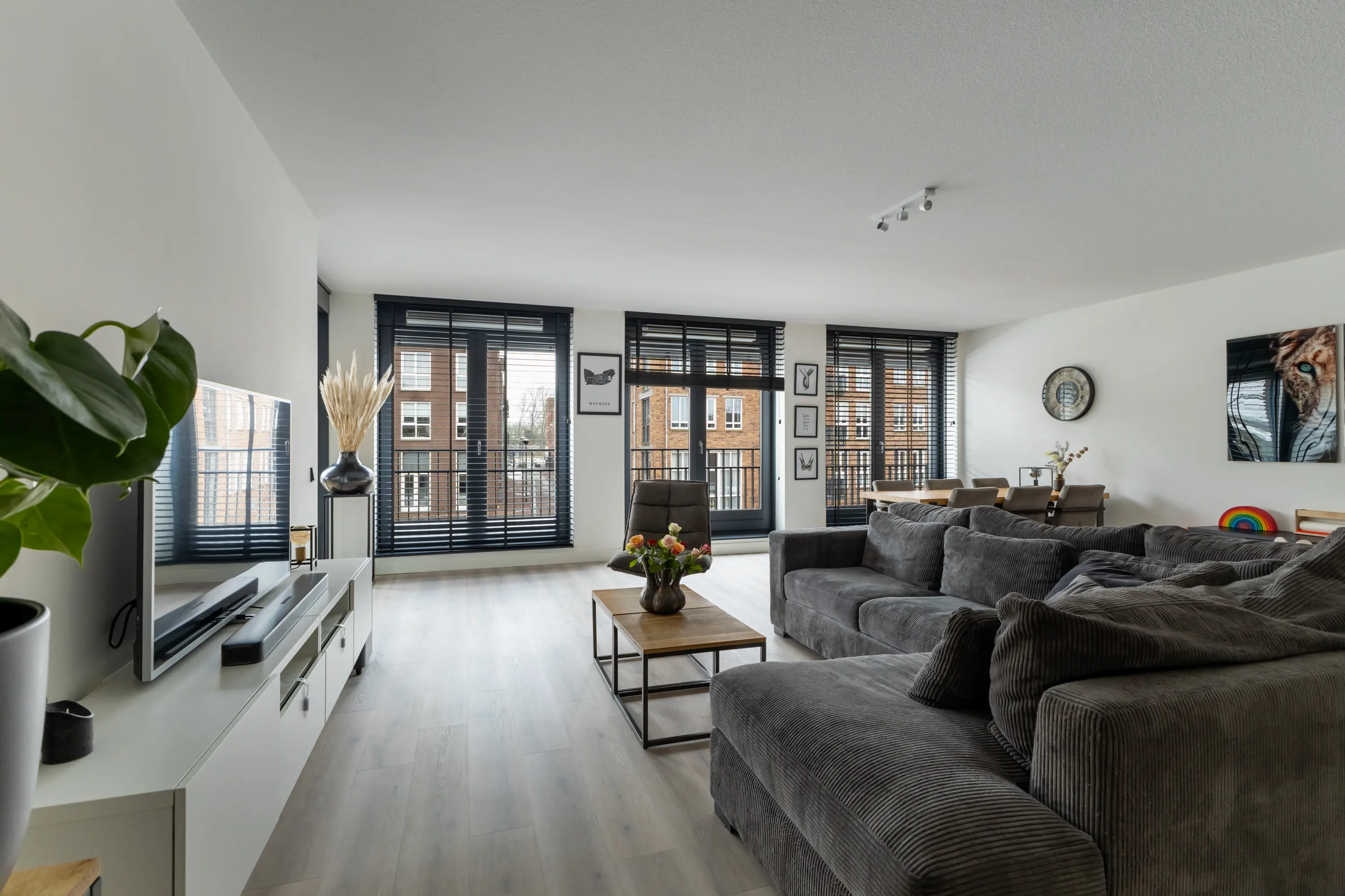 Royale en lichte woonkamer met 3 dubbele openslaande deuren en Franse balkons. Al deze ramen zijn voorzien van screens aan de buitenzijde.