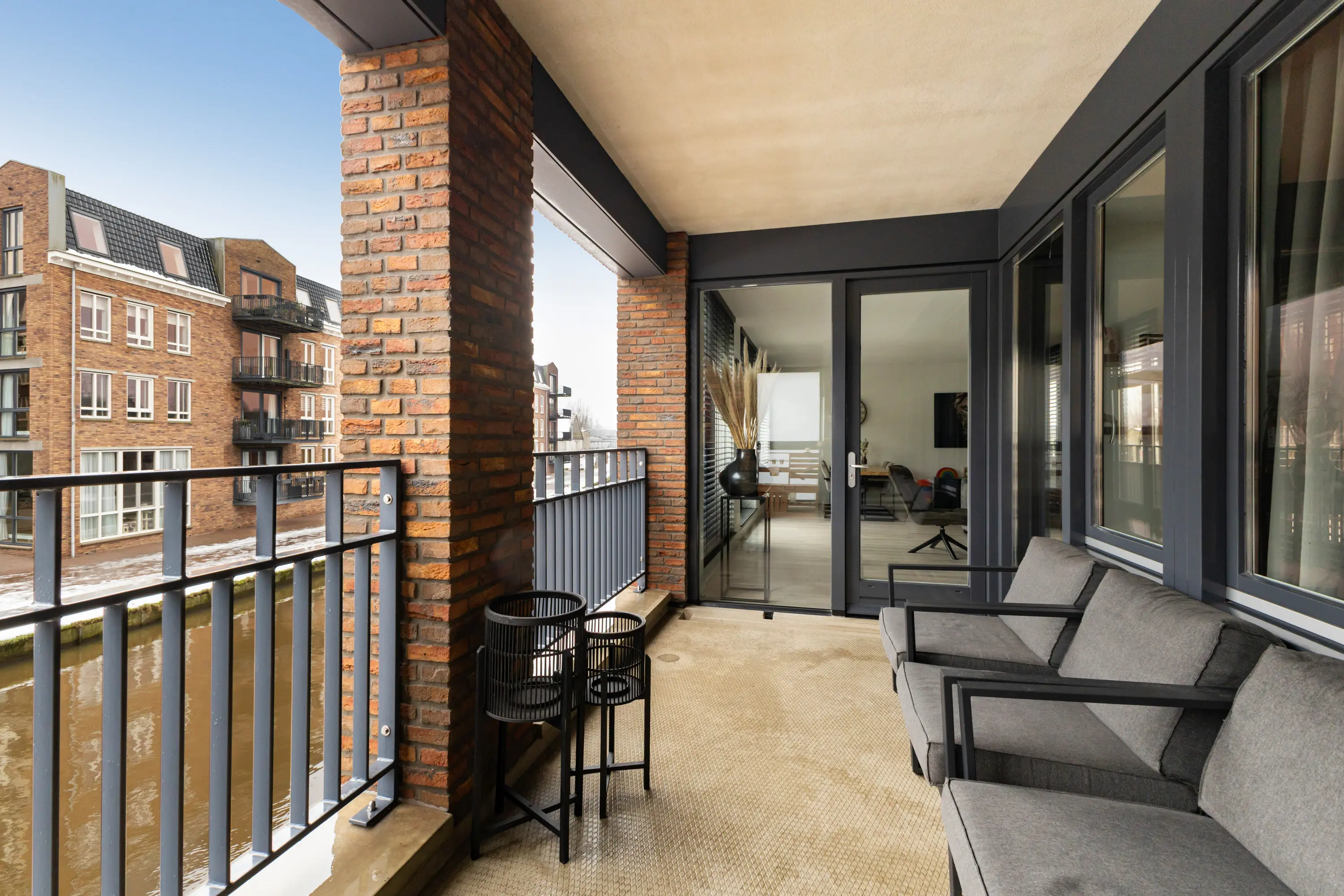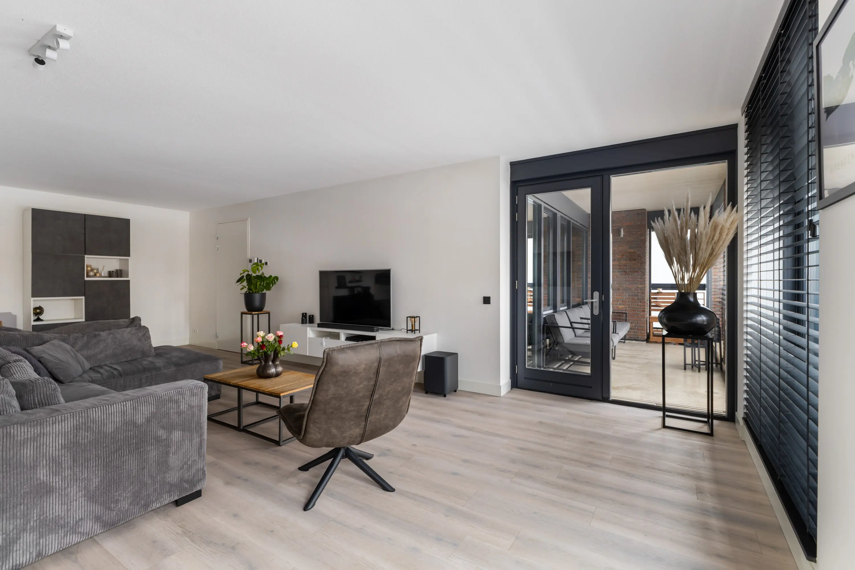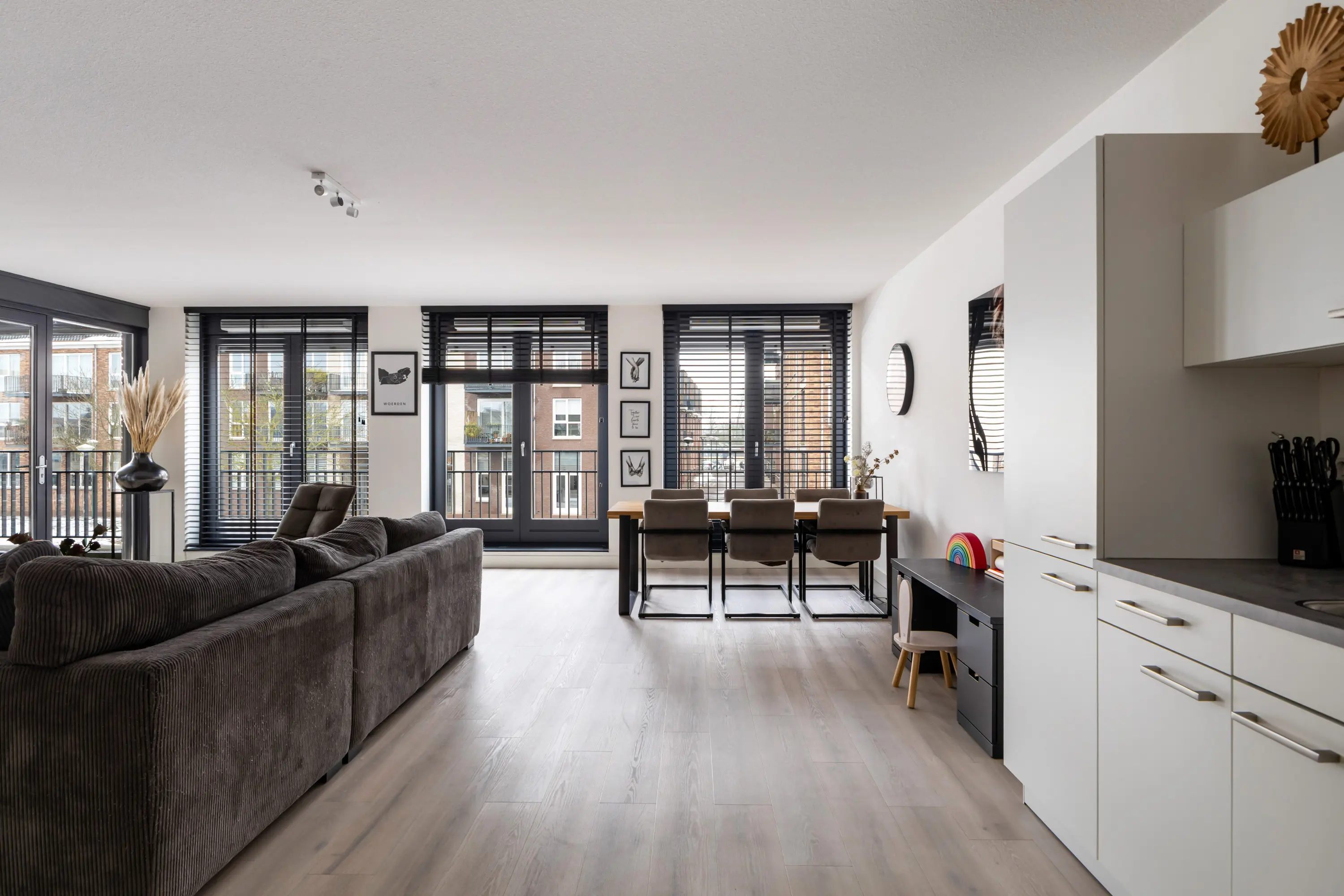 Royale en lichte woonkamer met 3 dubbele openslaande deuren en Franse balkons. Al deze ramen zijn voorzien van screens aan de buitenzijde.