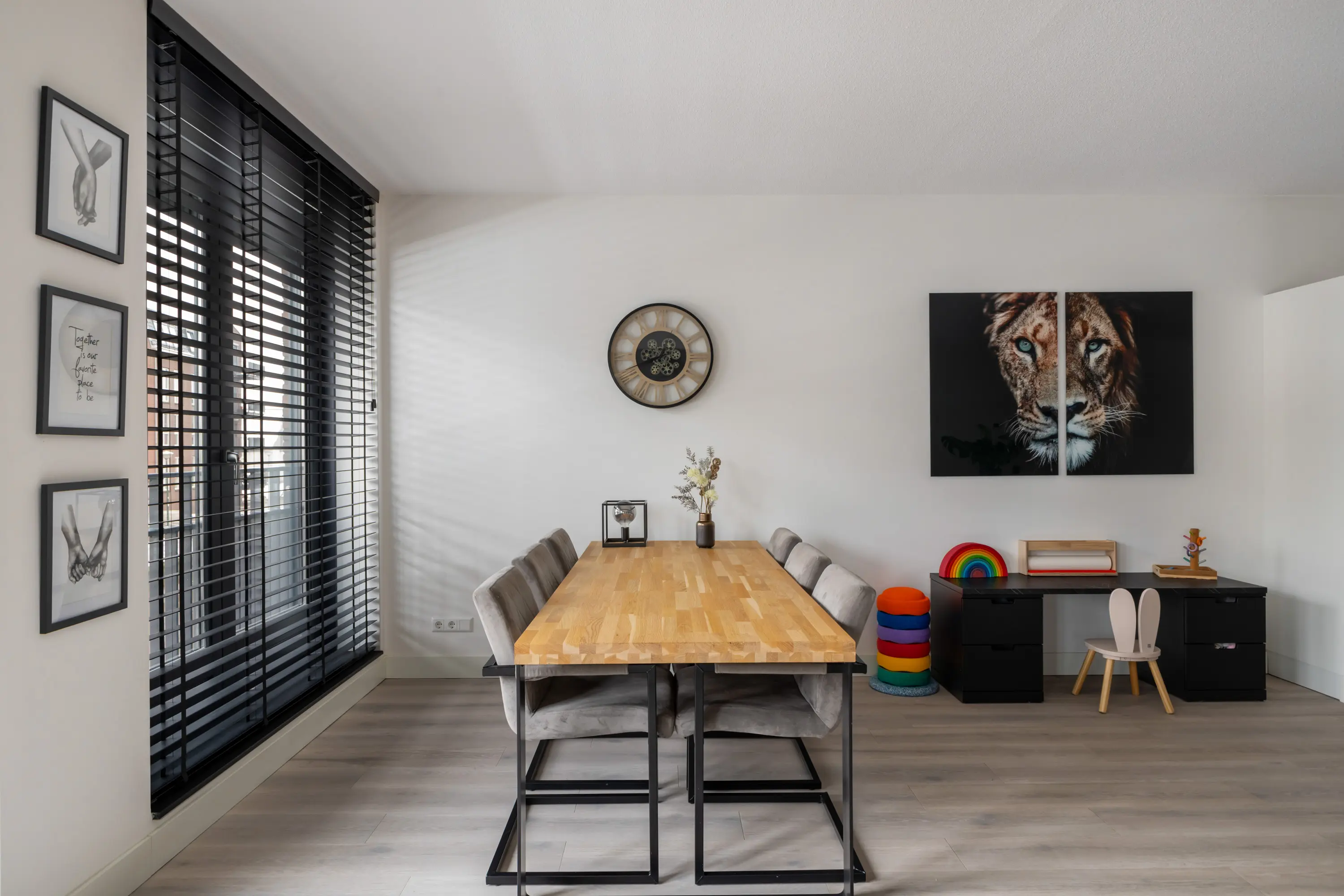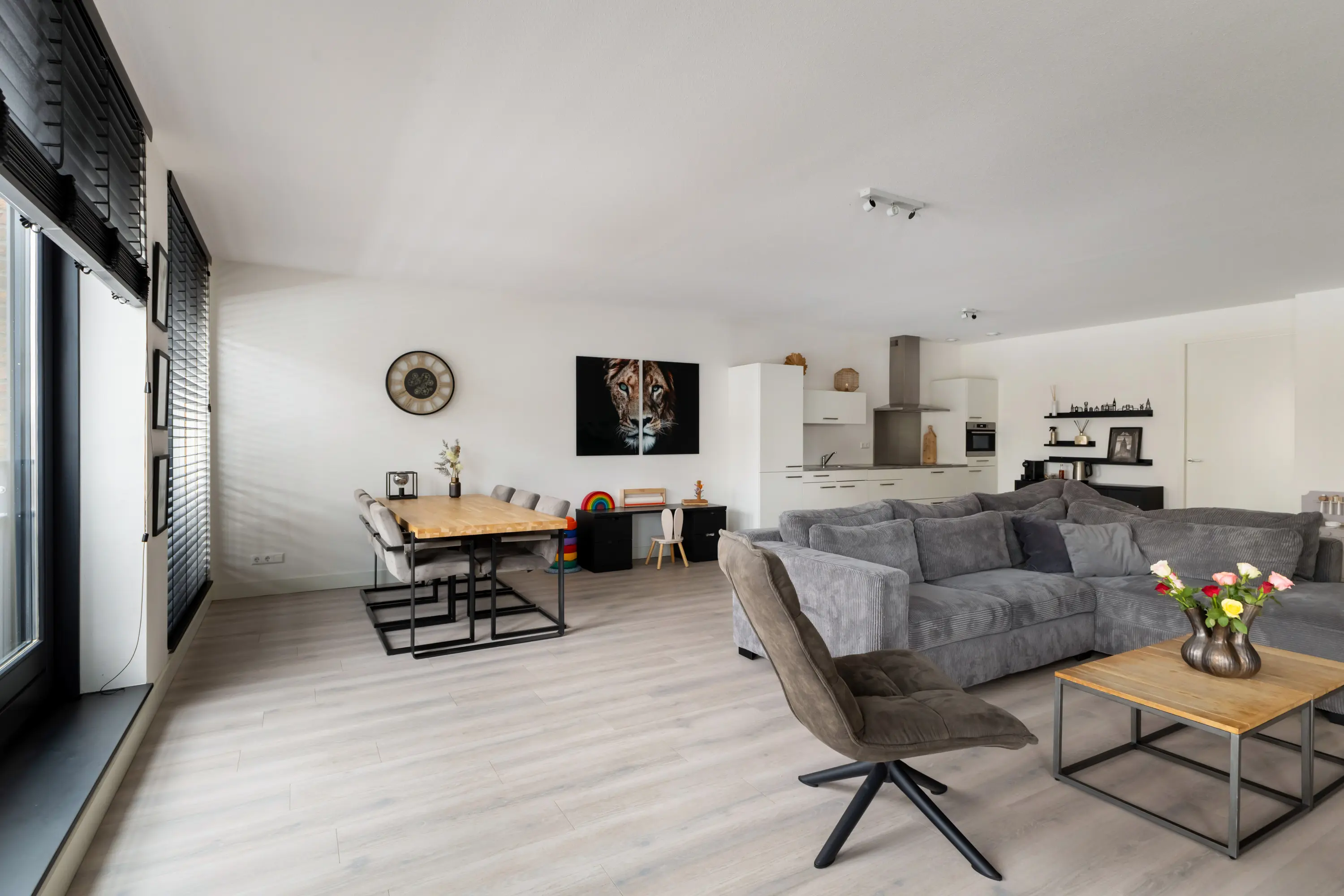 De gehele woonkamer is afgewerkt met een PVC-vloer en vloerverwarming.