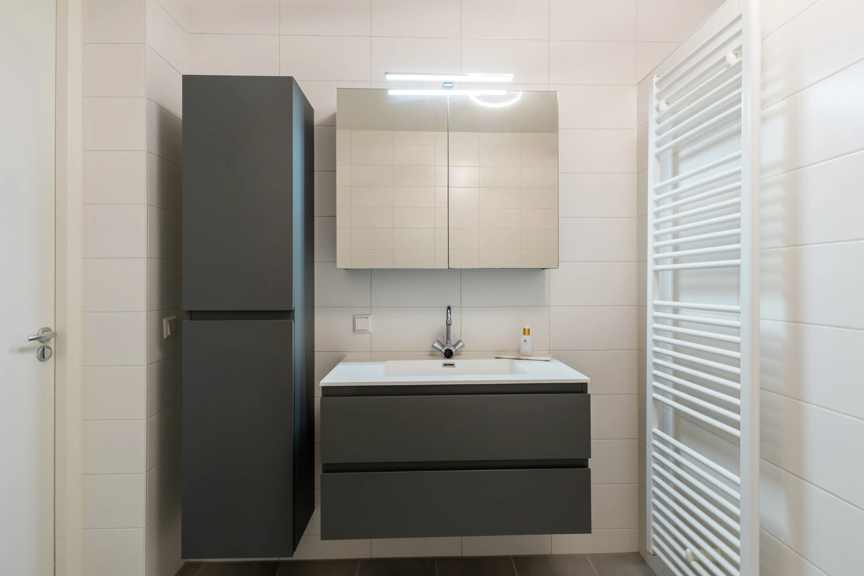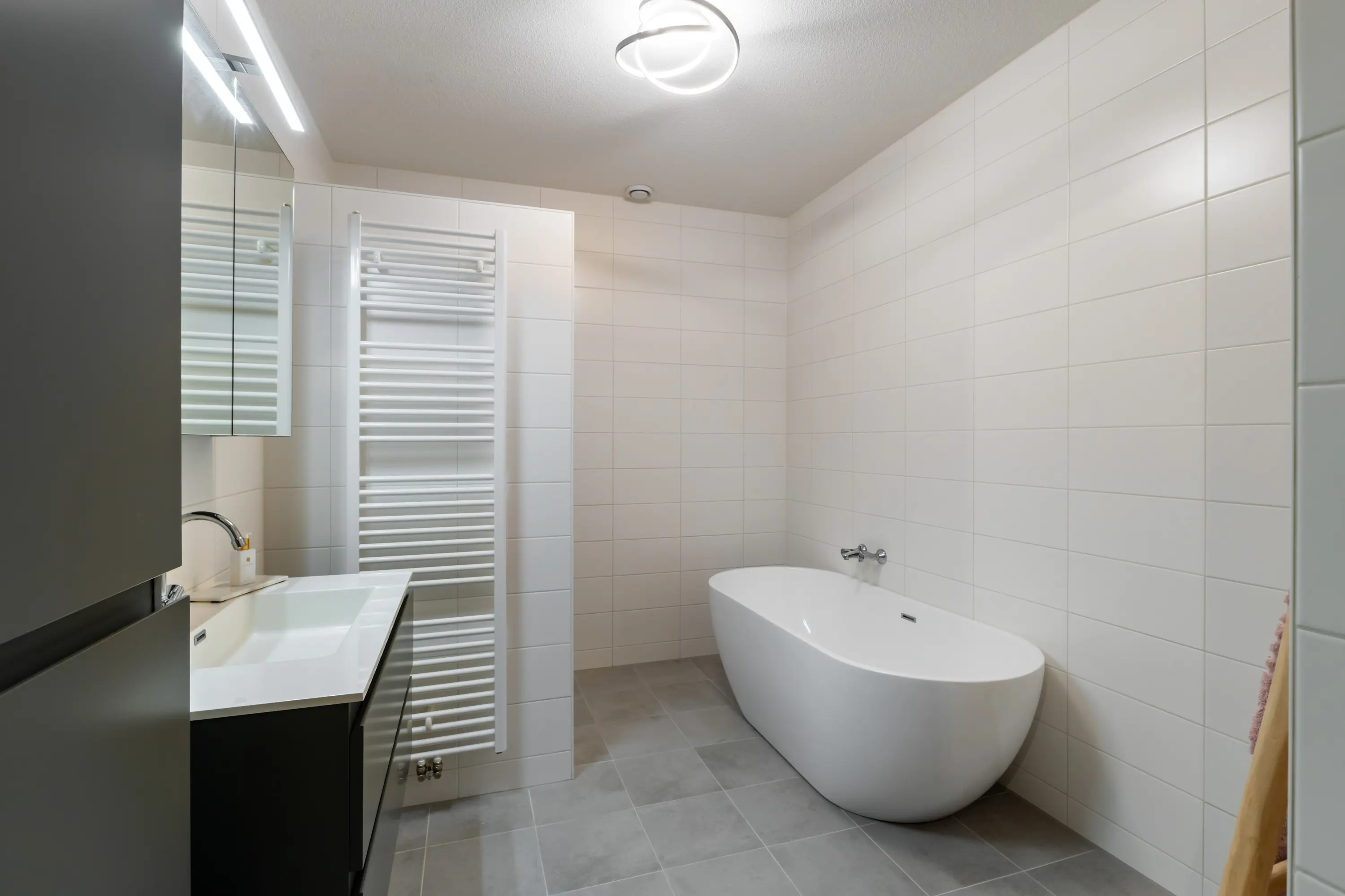 De badkamer is geheel betegeld en is voorzien van een inloopdouche, wastafelmeubel, ligbad en design radiator.