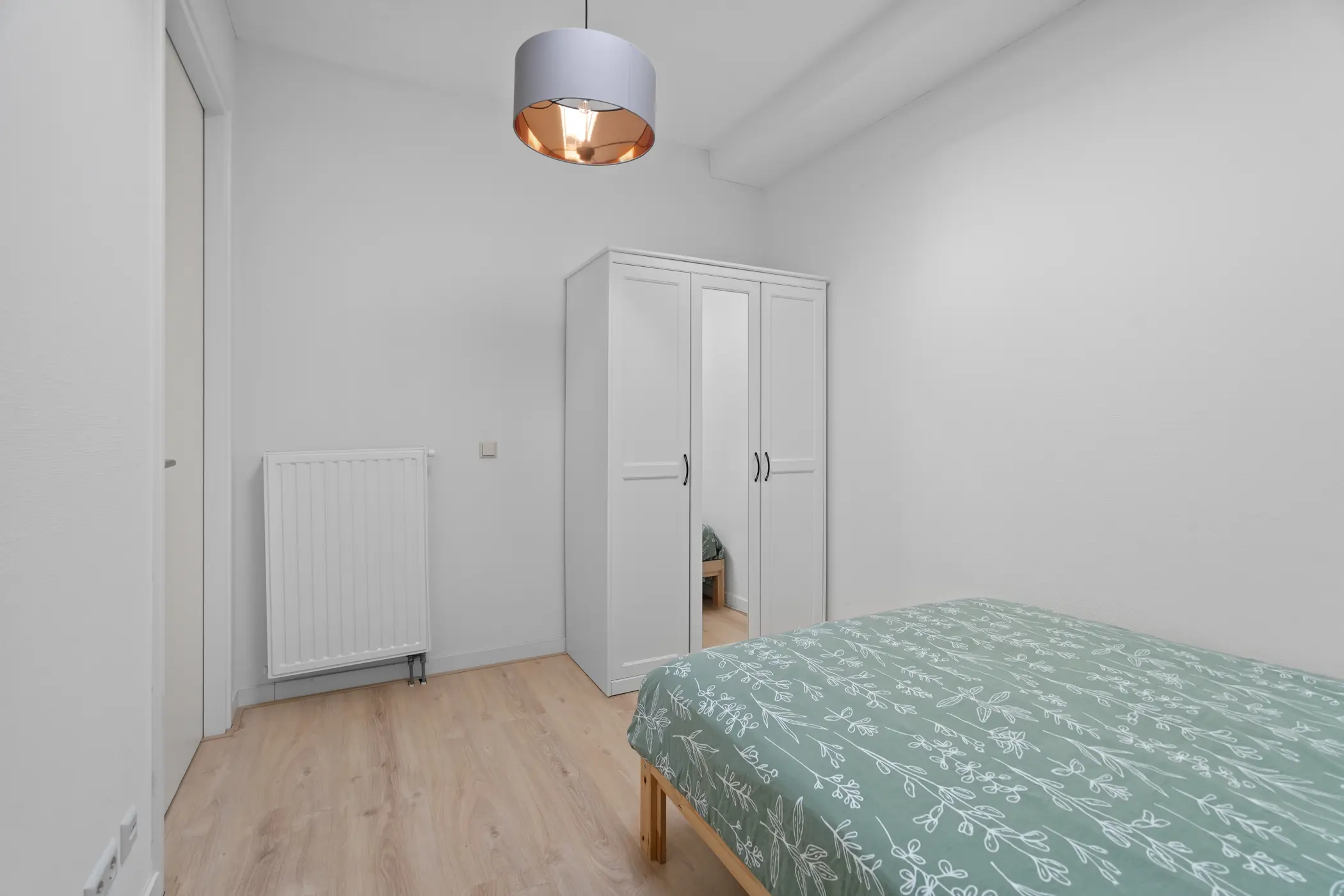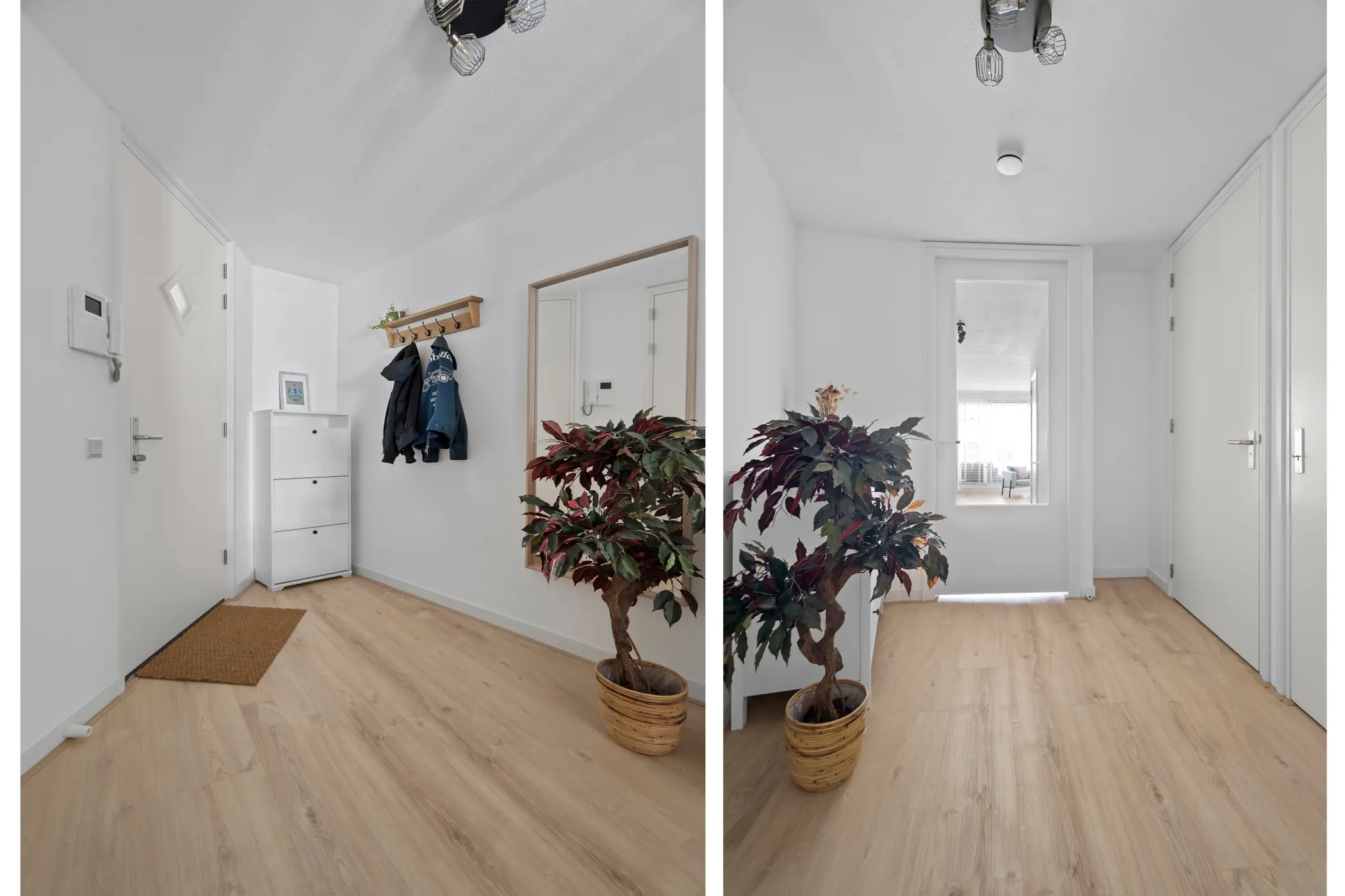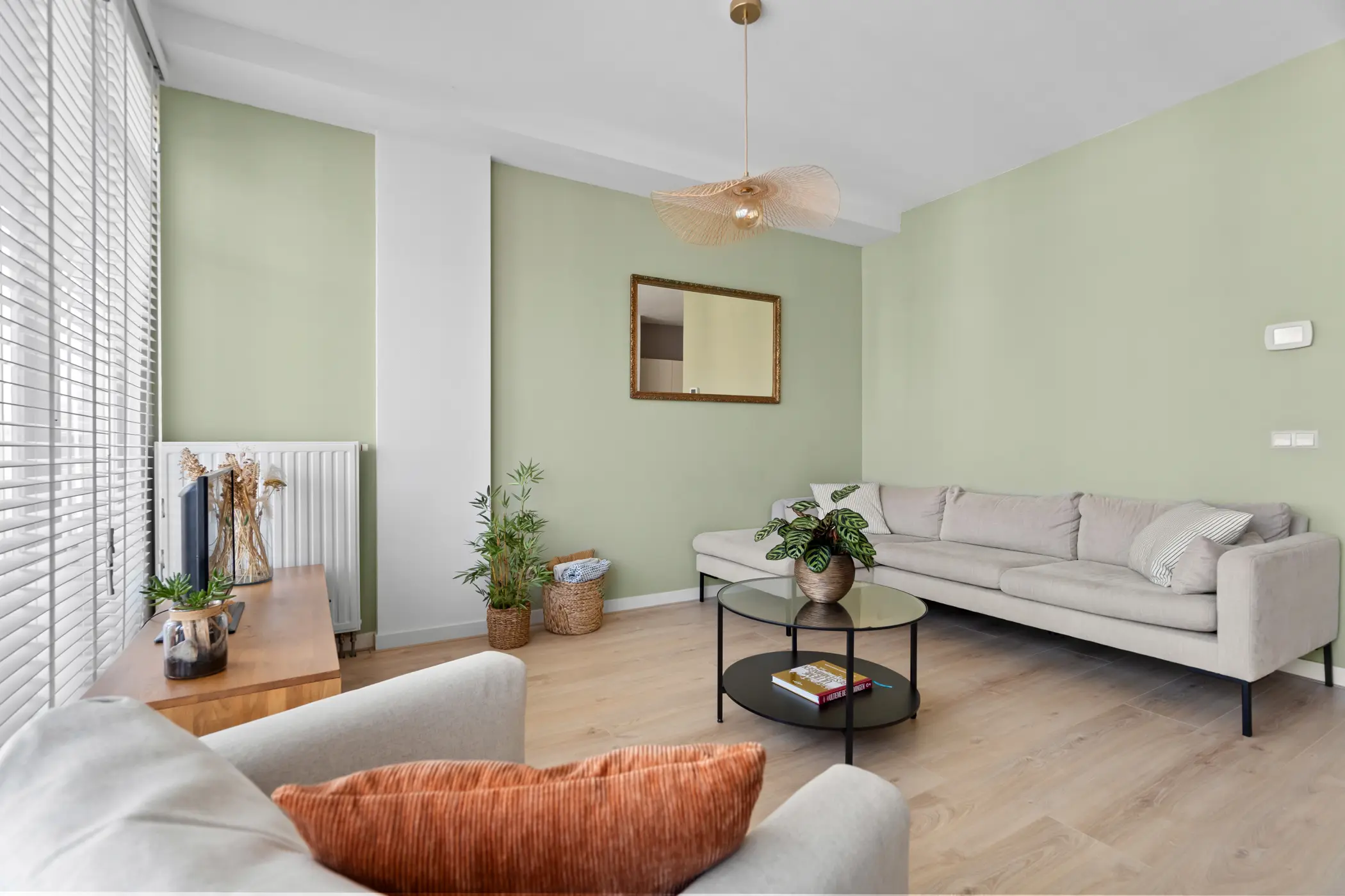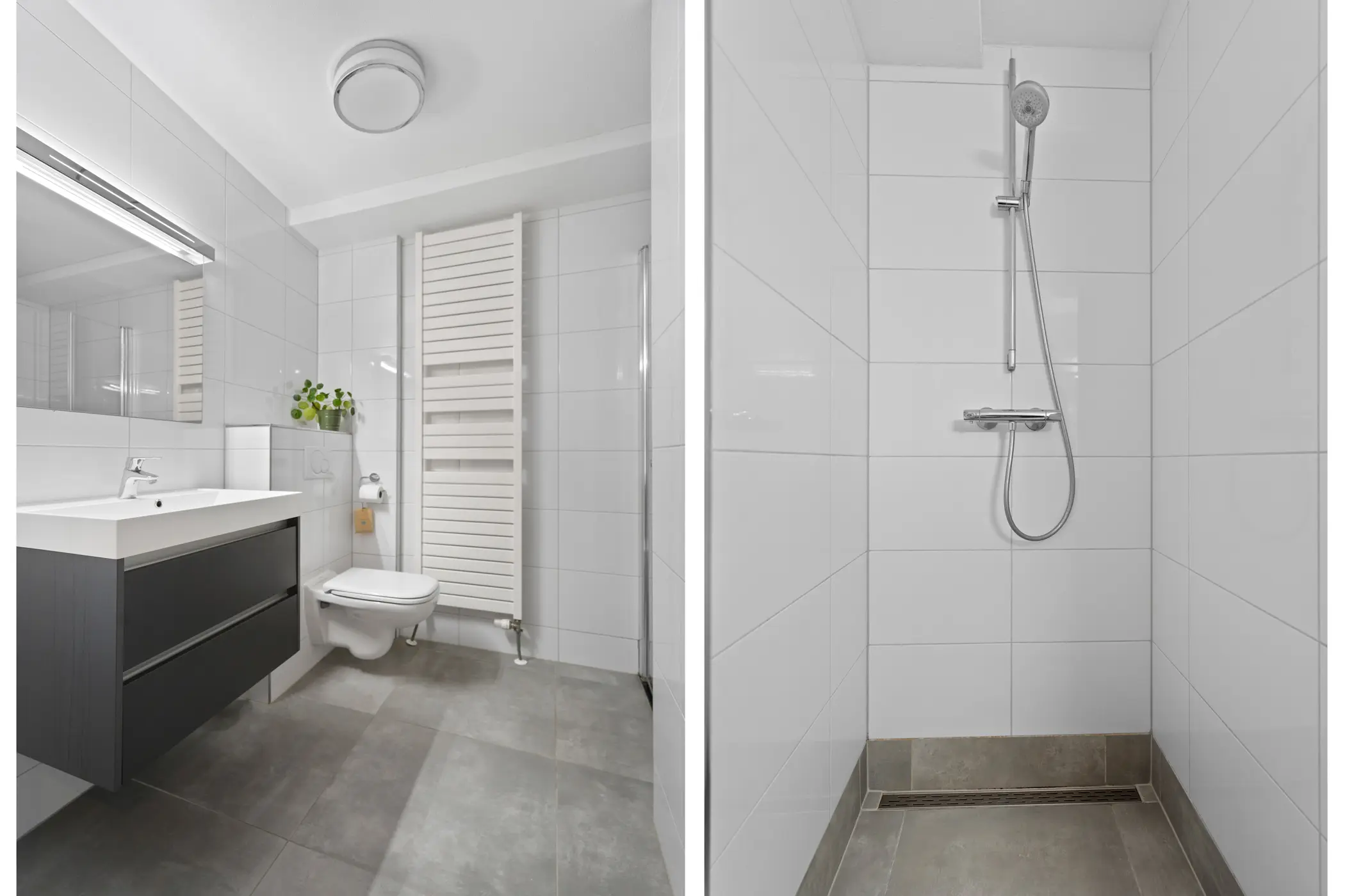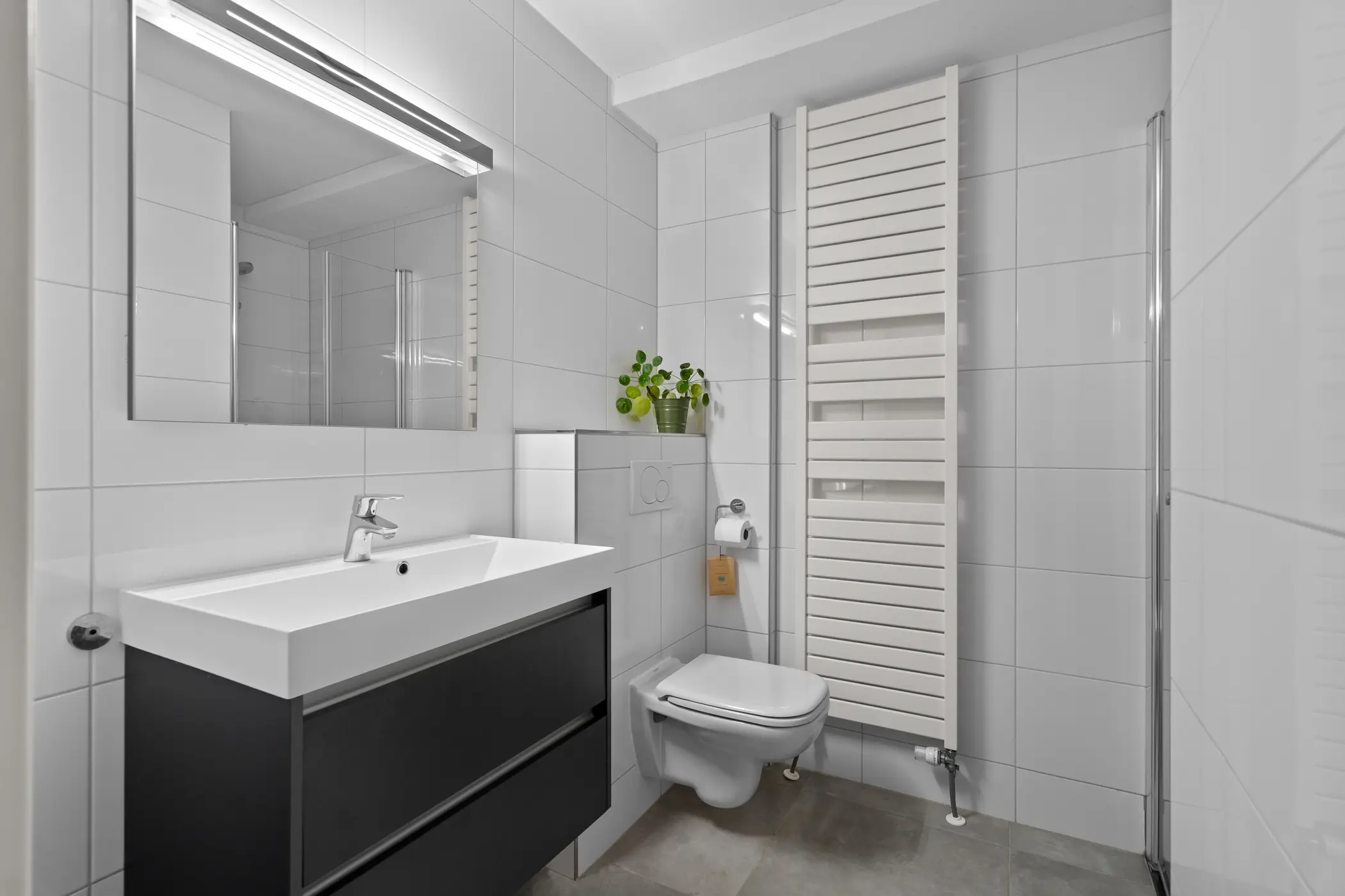 De ruime hal geeft toegang tot een praktische bergkast met cv-installatie en mv-box, de badkamer en natuurlijk de woonkamer. De badkamer is modern en compleet uitgerust met een wastafelmeubel, wandcloset, designradiator en een comfortabele inloopdouche.