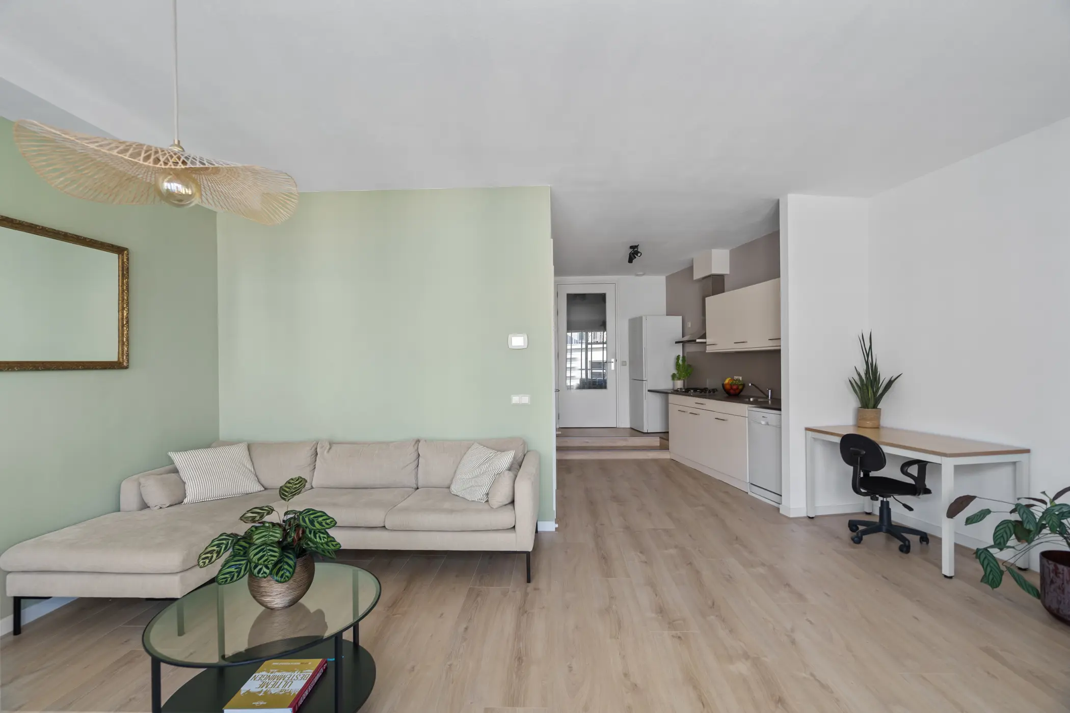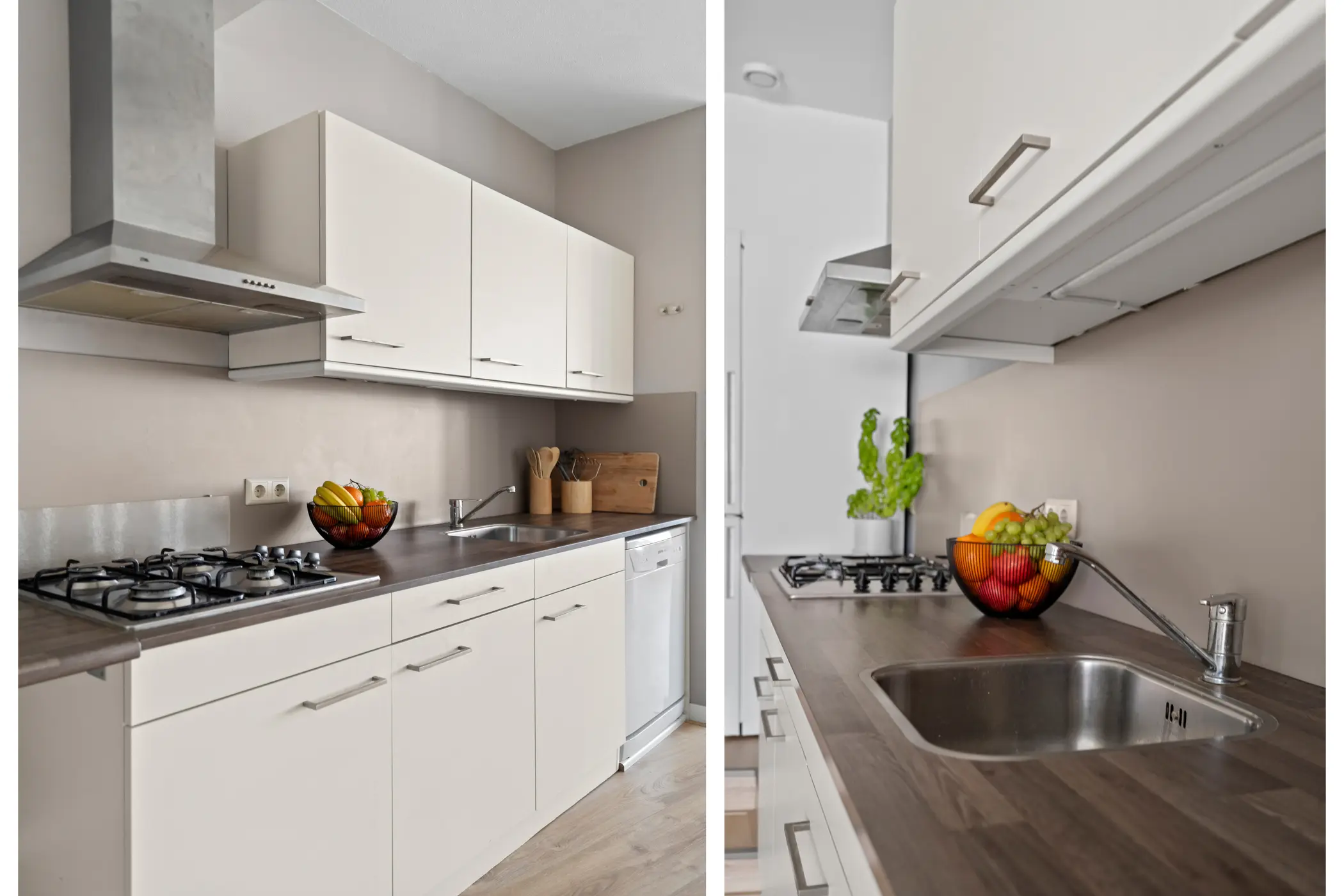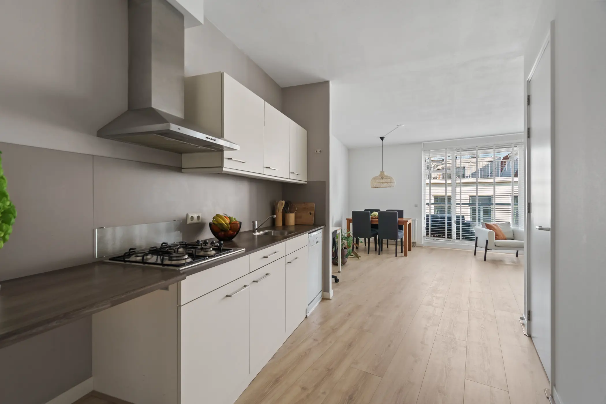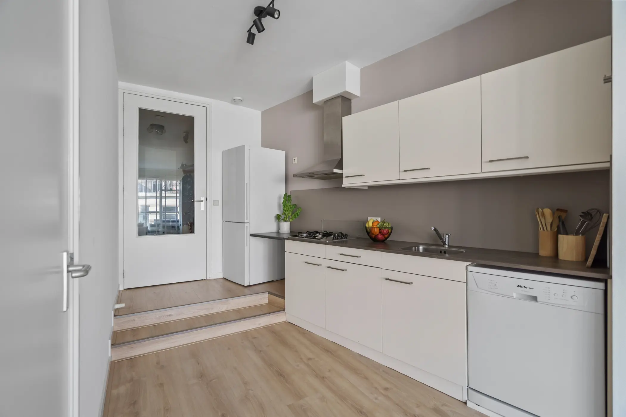 De ruime woonkamer voelt meteen gezellig aan en staat in open verbinding met de keuken. De keuken is praktisch ingericht en voorzien van o.a. een 4-pits gasfornuis, afzuigkap, koel/vriescombinatie en vaatwasser. Dankzij de handige indeling is er voldoende ruimte om te koken én te genieten.