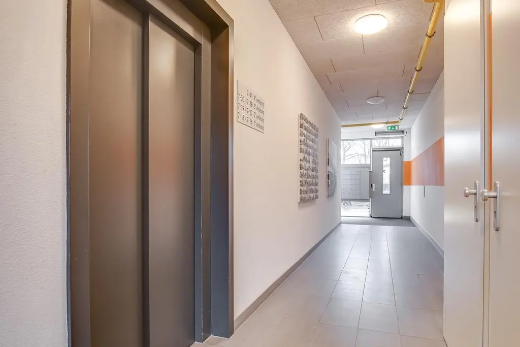 Complexentree op de begane grond: de entree is toegankelijk via de gemeenschappelijke hal met het bellentableau, de brievenbussen en de lift en trappenhuis.