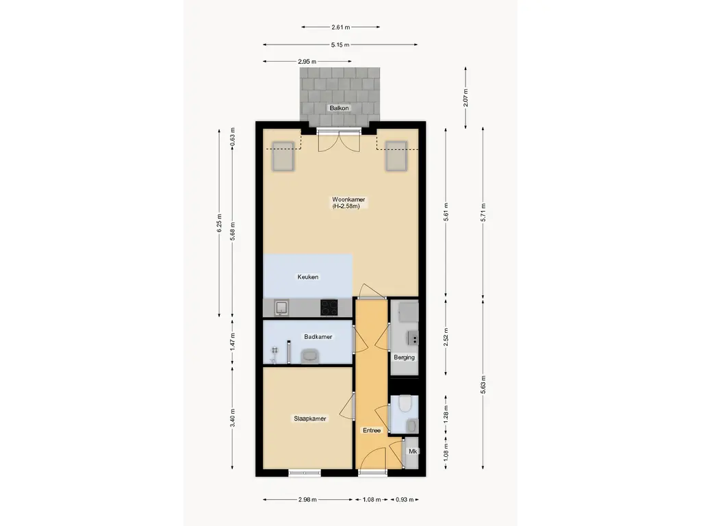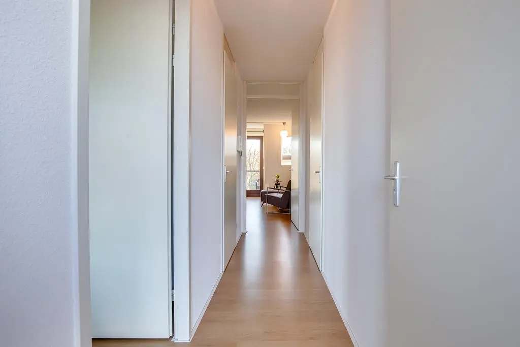 Appartementsentree op de derde verdieping: u komt binnen in de hal met meterkast, separate toiletruimte, ruime bergkast met de opstelplaats voor de c.v.-ketel en aansluitpunten van de wasmachine en droger en doorgang naar de ruime slaapkamer, de badkamer en de woonkamer.